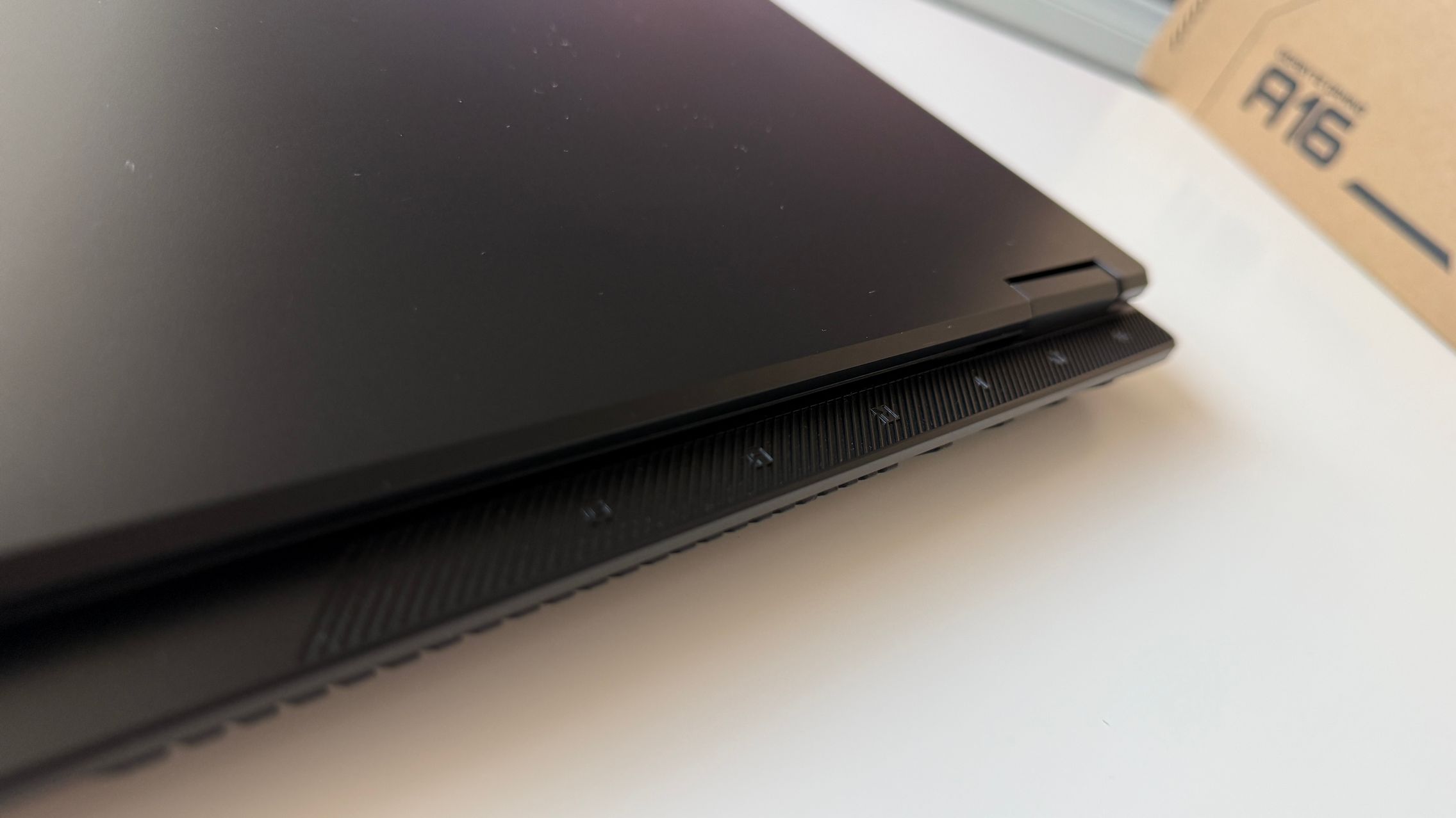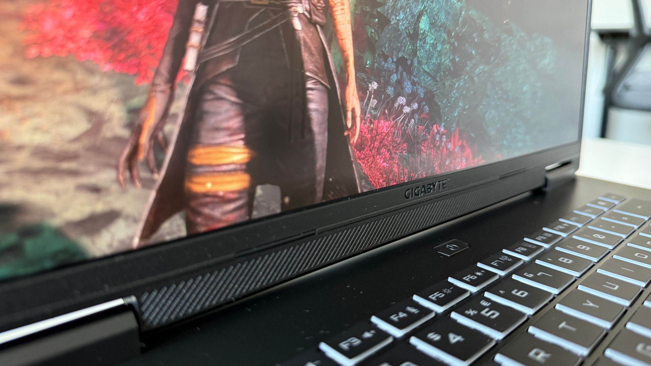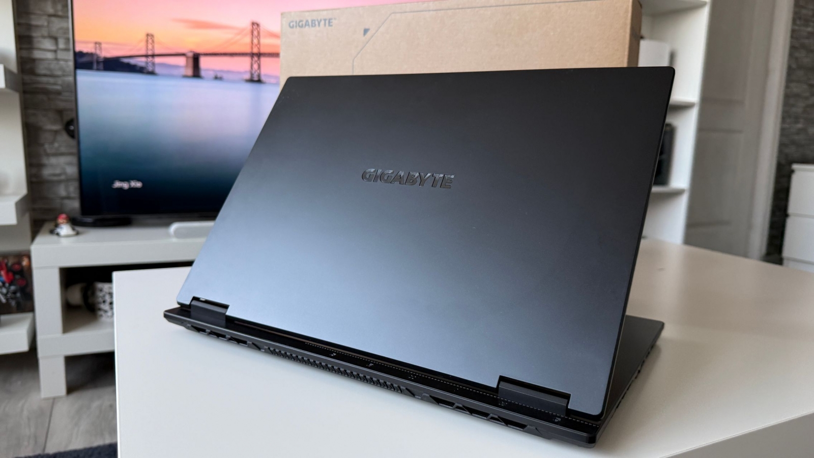 E mat, placut la atingere și parcă văd și un finisaj ca de sclipici pe capac. Doar grijă la amprente, la degete umede, uleioase, pentru că se prind amprentele rapid. Dacă te dai cu cremă înainte de o sesiune de gaming, mai bine aștepți. Logo-ul GIGABYTE este gravat frumos pe capac și îmi place că laptop-ul se poate așeza plat pe o suprafață, cu deschiderea la 180 de grade și aici mă gândesc la un scenariu în care pui laptop-ul în "picioare" pentru a te juca folosind un controller. Atipic, dar nu sună rău.