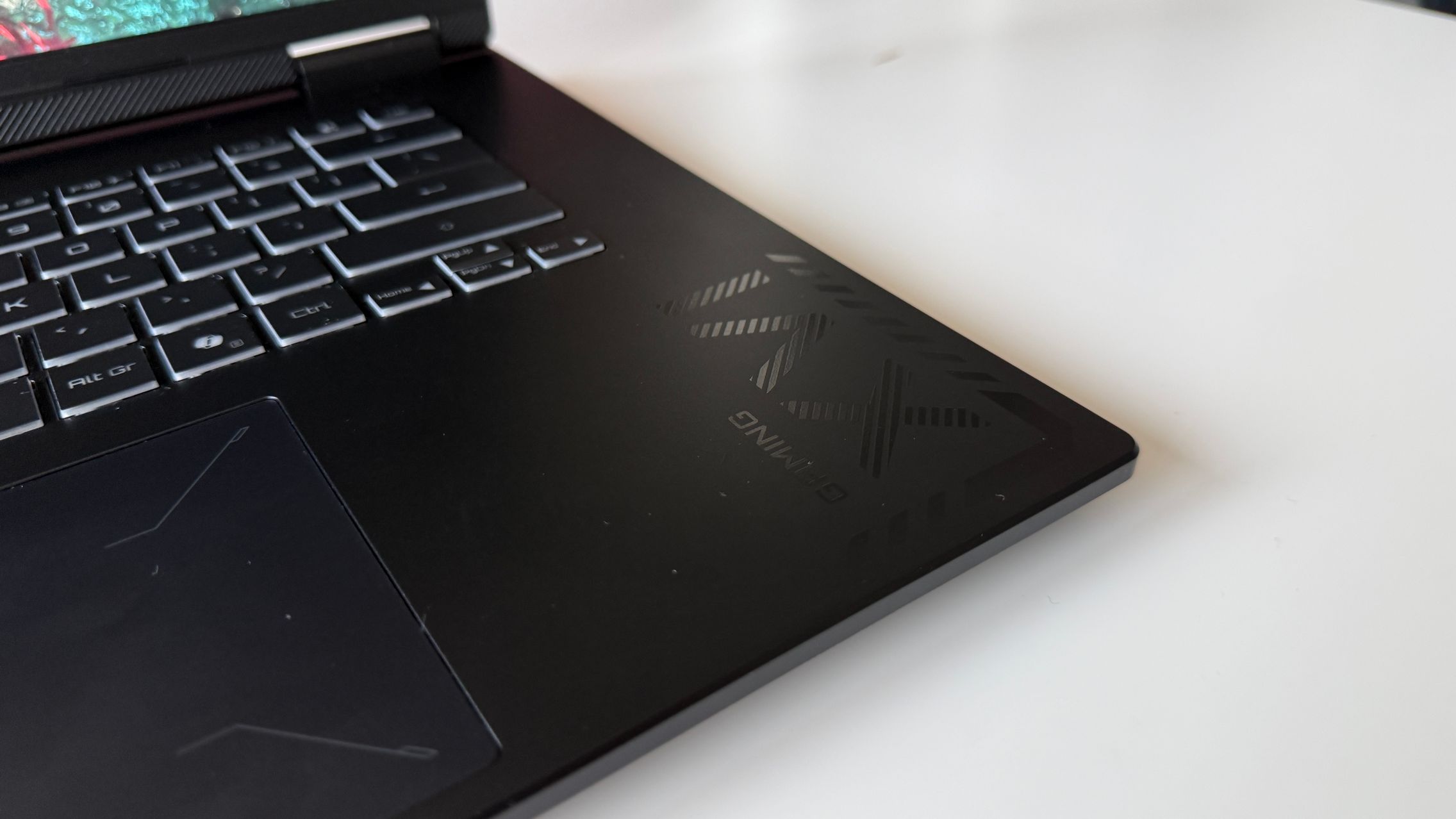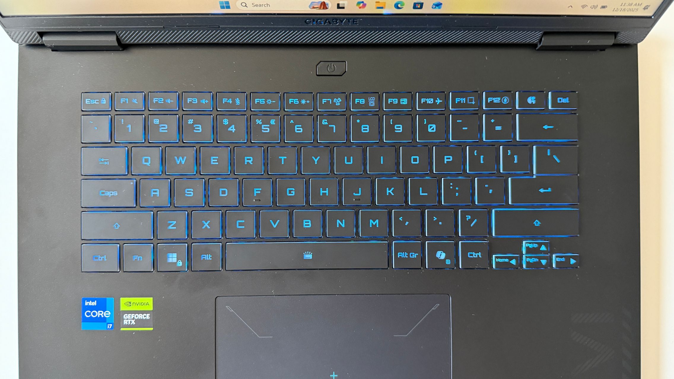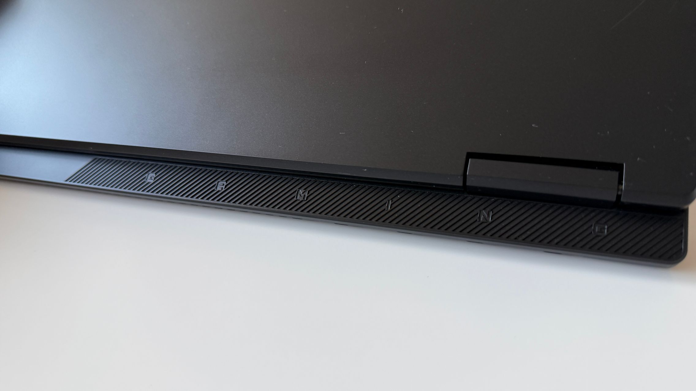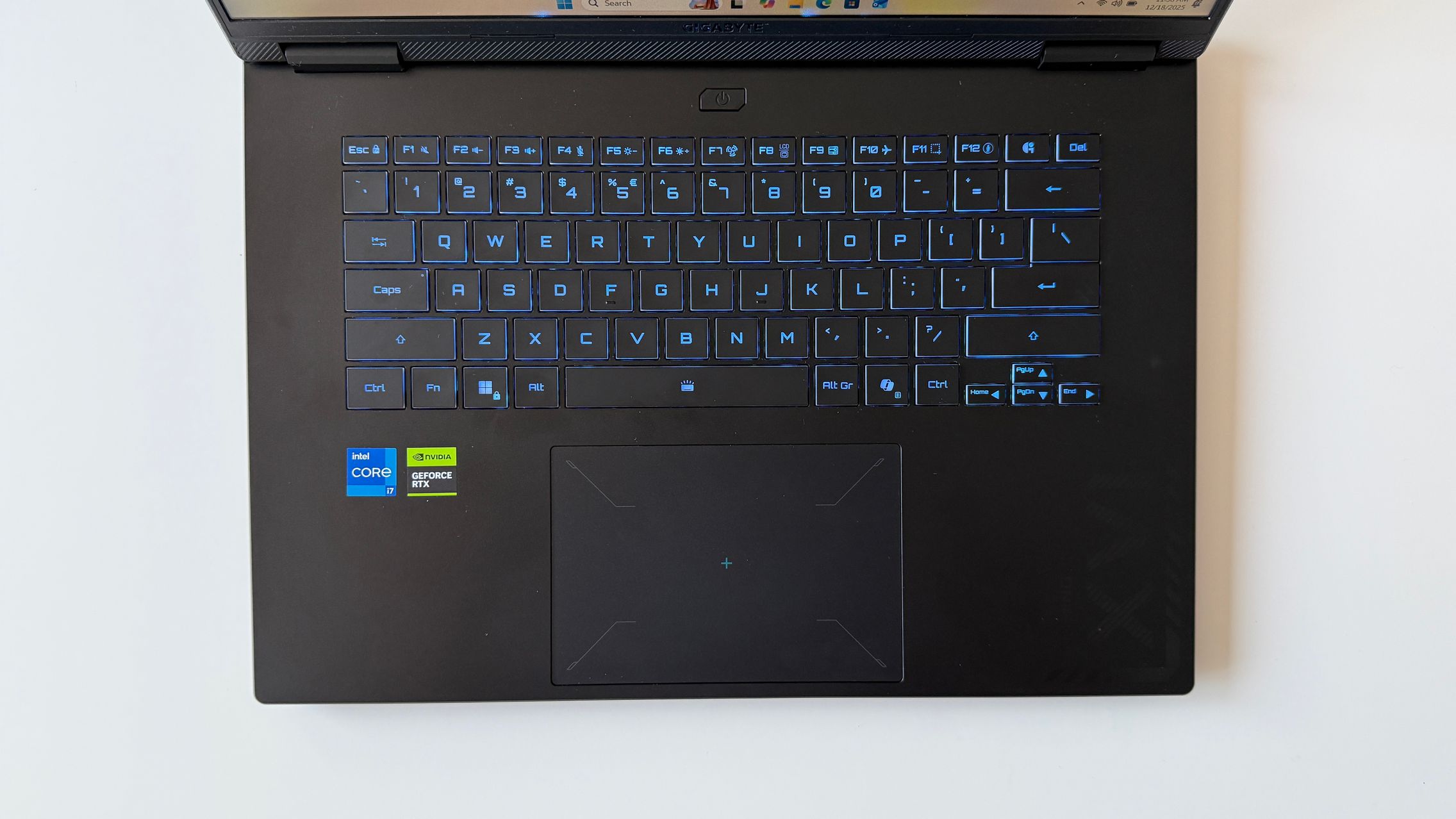 E mat, placut la atingere și parcă văd și un finisaj ca de sclipici pe capac. Doar grijă la amprente, la degete umede, uleioase, pentru că se prind amprentele rapid. Dacă te dai cu cremă înainte de o sesiune de gaming, mai bine aștepți. Logo-ul GIGABYTE este gravat frumos pe capac și îmi place că laptop-ul se poate așeza plat pe o suprafață, cu deschiderea la 180 de grade și aici mă gândesc la un scenariu în care pui laptop-ul în "picioare" pentru a te juca folosind un controller. Atipic, dar nu sună rău.