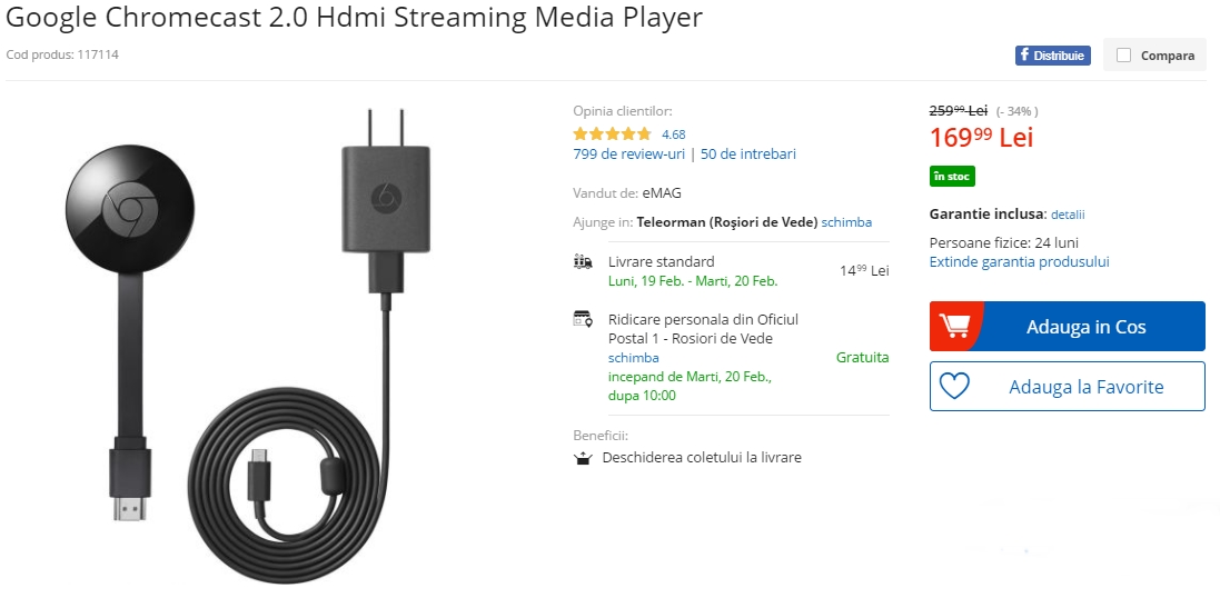 Cei care sunt în căutarea unei alternative foarte accesibile prin care să își transforme televizorul într-unul smart, există opțiunea numită Google Chomecast 2.0. Acest dongle smart este disponibil în aceste zile la cel mai bun preț de la Black Friday încoace, fiind disponibil în oferta eMAG.ro la suma de numai 169.99 lei. Se poate ridica direct din showroom sau puteți alege expedierea prin curier, sau chiar și poștă.