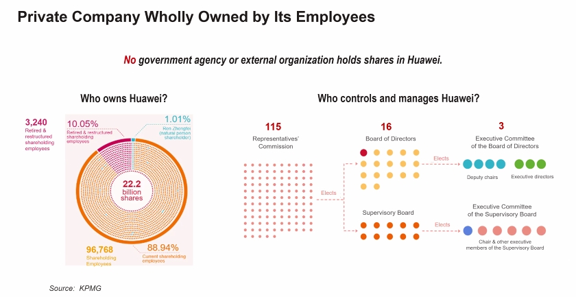 În primul rând reprezentanţii săi au subliniat că firma este o companie privată, deţinută de angajaţi. În plus, aflăm că nici o agenţie guvernamentală sau organizaţie externă nu deţine acţiuni la Huawei. Conform reprezentanţilor, în frunte cu CEO-ul local George Zhang, firma are un "track record" pozitiv în ultimii 30 de ani.