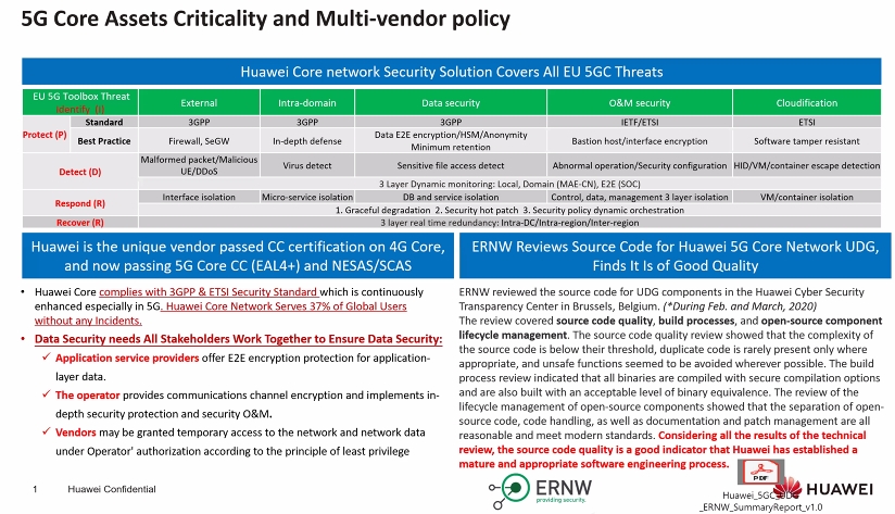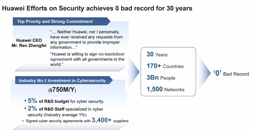Testele din ultimii ani au arătat că Huawei stă bine la securitate. Pe viitor compania se declară deschisă la verificări third party ale echipamentelor, dacă asta doresc autorităţile.