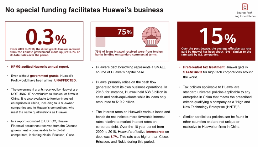 Aflaţi că din 2009 până în 2018, Huawei a primit subvenţii în valoare de 0.3% din totalul vânzărilor realizate în această perioadă. Se pare că 75% dintre împrumuturile Huawei au fost primite de la bănci străine, bazate pe termeni comerciali standard.