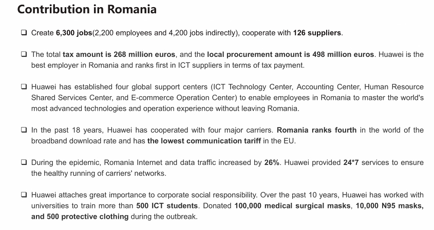 A fost reiterat şi aspectul contribuţiei locale a companiei. Prezentă la noi încă din anul 2003, Huawei a creat 6300 de joburi noi, colaborând în acest timp cu 126 de furnizori. În plus, are 268 de milioane de euro taxe plătite şi a creat un centru global de suport în România.