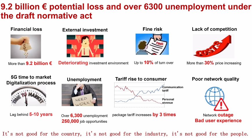 În draftul autorităţilor de la noi, Guvernul se referă nu doar la 5G, ci şi la 2G şi 3G, iar dacă nu se face o schimbare la draft, atunci un anumit furnizor ar trebui să renunţe la toată infrastructura, ceea ce poate fi catastrofal pentru un operator şi pentru public (picaj semnal, înlocuiri anevoioase echipament + altele).
