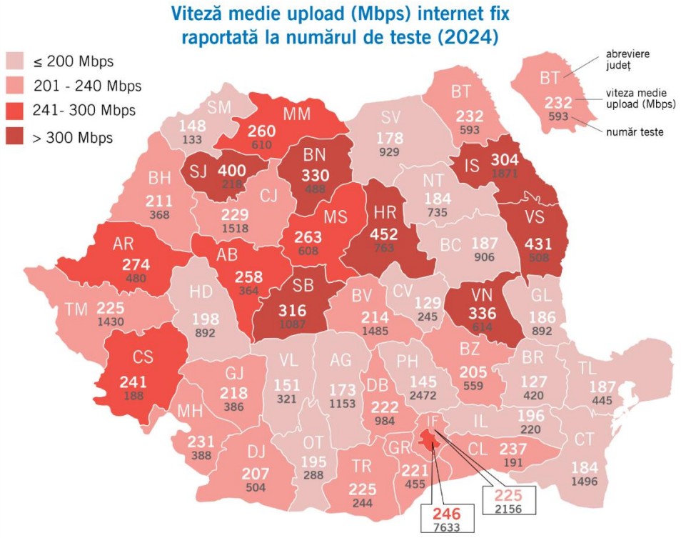 Viteza de upload este esențială pentru utilizatorii care fac streaming, folosesc aplicații cloud sau participă frecvent la videoconferințe. Pare că Vaslui domină și în acest top, cu o viteză medie de upload de 431 Mbps. Harghita se află pe primul loc, cu 452 Mbps. Asta indică o infrastructură echilibrată și bine dimensionată în raport cu populația pentru aceste județe.