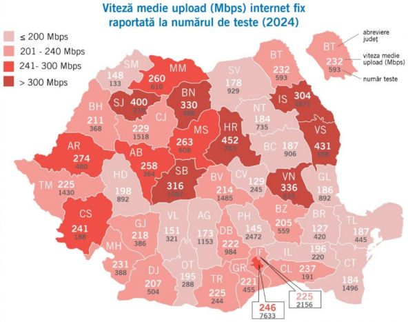 Codașe în materie de upload pe date ar fi Buzău, Hunedoara, Argeș, Olt, Călărași, județe ce au rămas sub 11 Mbps, o valoare sub limita decentă pentru servicii moderne. Chiar dacă ecartul e mai mic decât în cazul downloadului, această limitare afectează semnificativ aplicațiile de upload continuu sau cele de streaming.
