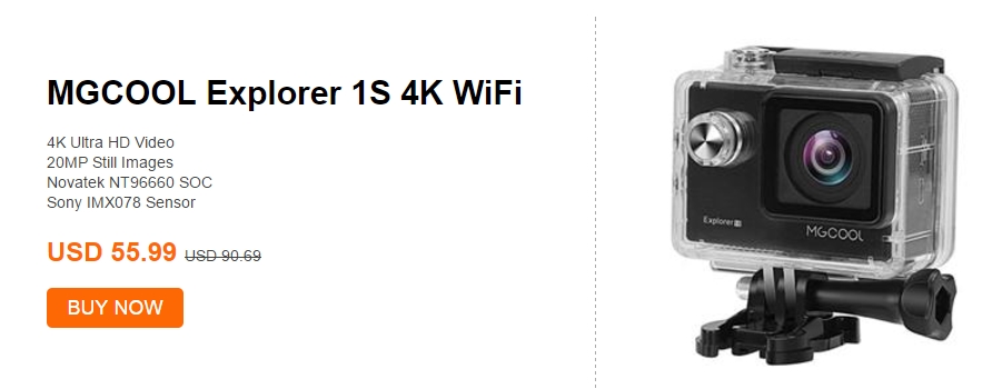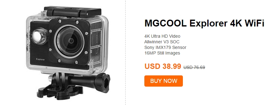 În ordinea crescătoare a prețului avem camera MGCOOL Explorer, model ce oferă la pachet un senzor CMOS Sony IMX179 capabil de captură video H.264 la rezoluție 4K și 15 fps, 1080p și 60fps, respectiv 720 la 120fps. Avem conectivitate Wi-Fi cu acoperire de 10 metri, o carcasă specială pentru captură subacvatică și slot microSD. Prețul acestei camere video de acțiune este acum de 38.99 dolari.