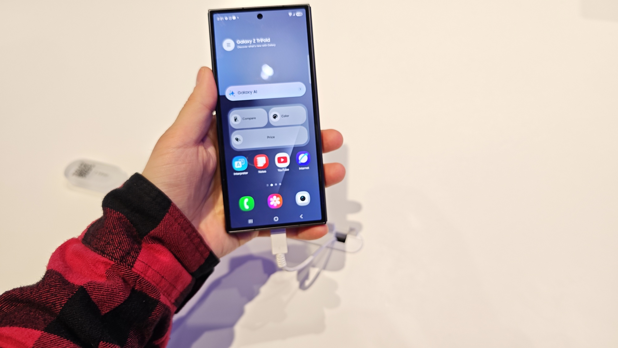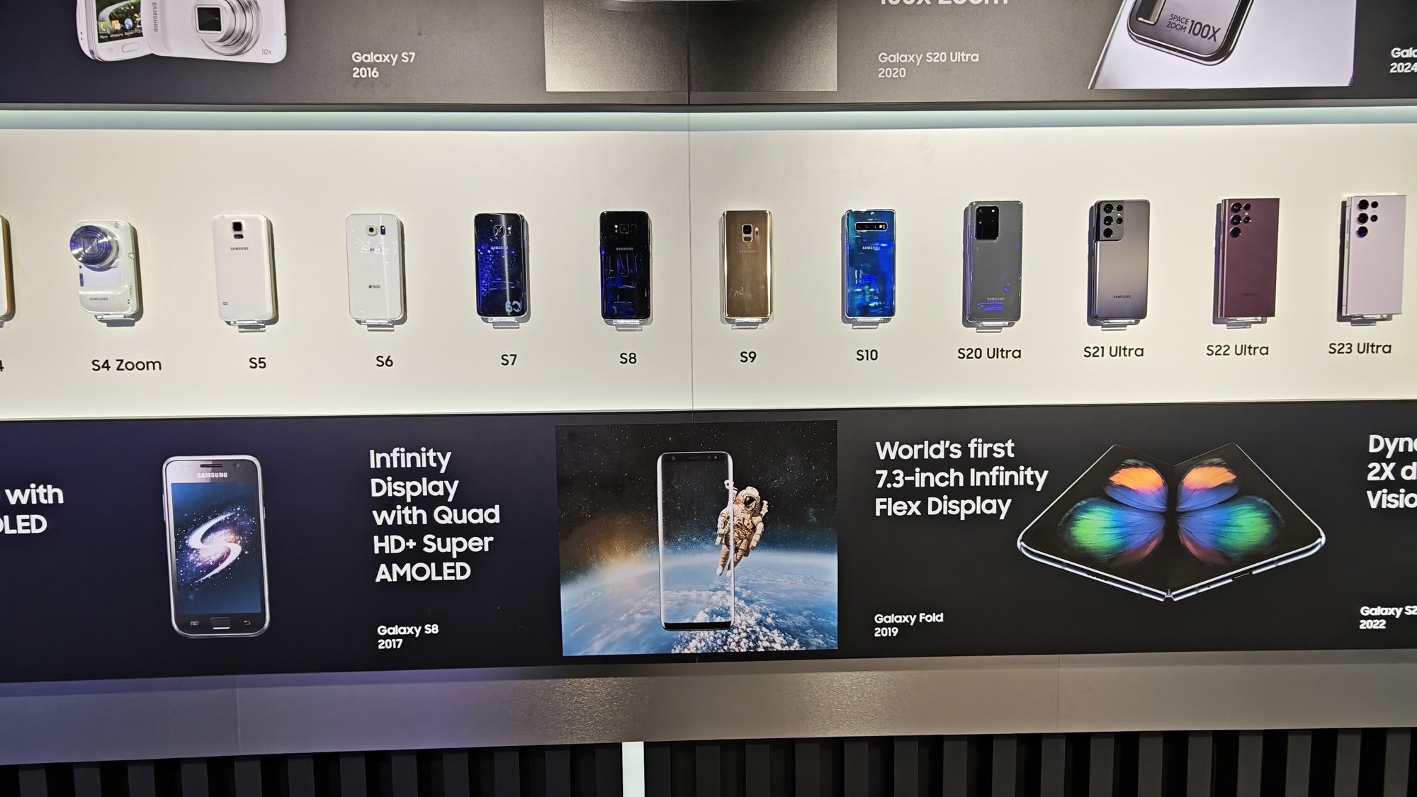 Turul începe în zona „cascadei”, acolo unde sunt așezate device-urile vedetă din portofoliul sud-coreenilor: Galaxy Z TroFold, smartwatch-uri Galaxy Watch8, laptopul Galaxy Book 6 Pro, tableta Galaxy Tab S11, dar și casca Galaxy XR. În centru se află camera-phone-ul de top al companiei - Galaxy S26 Ultra. Această zonă de expoziție a fost creată pentru a evidenția ecosistemul extins al companiei și funcțiile Galaxy AI prezente pe tot mai multe device-uri.