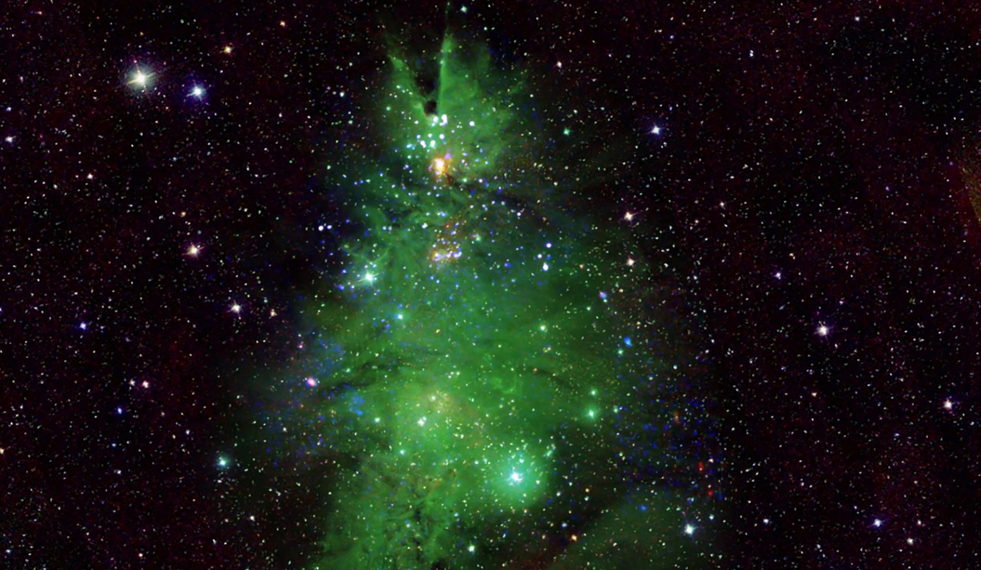 Ceea ce face această imagine și mai fascinantă e faptul că nu e chiar ceea ce pare. NASA ne explică că această aparență de "brad de Crăciun" e de fapt o iluzie optică. Observatorul Kitt Peak a folosit un telescop de 0,9 metri care afișează gazele din nebuloasă în verde, iar lumina infraroșie de la sondajul astronomic 2MASS evidențiază stelele în alb. Această combinație creează imaginea festivă.