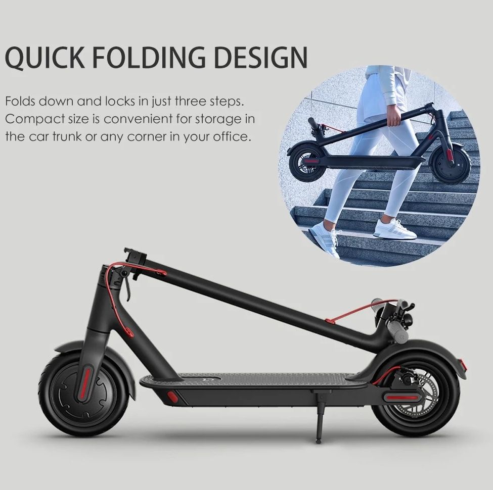 Pneurile de 8.5 inch absorb şocuri şi oferă confort şi pe suprafeţe mai dure. Avem şi faruri LED şi o aplicaţie Smart App, prin care facem update-uri de firmware de pe telefon şi verificăm starea trotinetei. Plierea se face în 3 paşi rapizi, iar încărcarea bateriei durează 5 ore. Cântăreşte 12.5 kilograme şi are sistem de frânare frontal E-ABS anti lock, plus frană cu disc în spate. Poate fi comandat de aici.