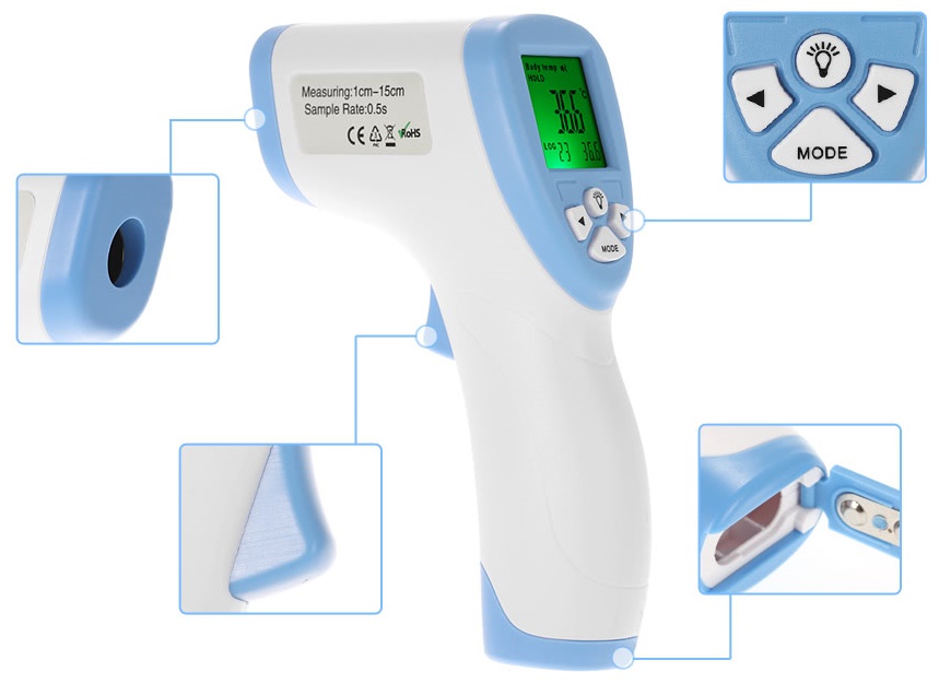 Acest termometru bazat pe o tehnologie infraroșu, este special creat cu scopul de a măsura temperatura unei persoane indiferent de temperatura din cameră fără a fi nevoie de contact. Ni se recomandă totuși ca termometrul să fie plasat în camera în care se va utiliza preț de 15-20 minute înainte de măsurarea temperaturii.