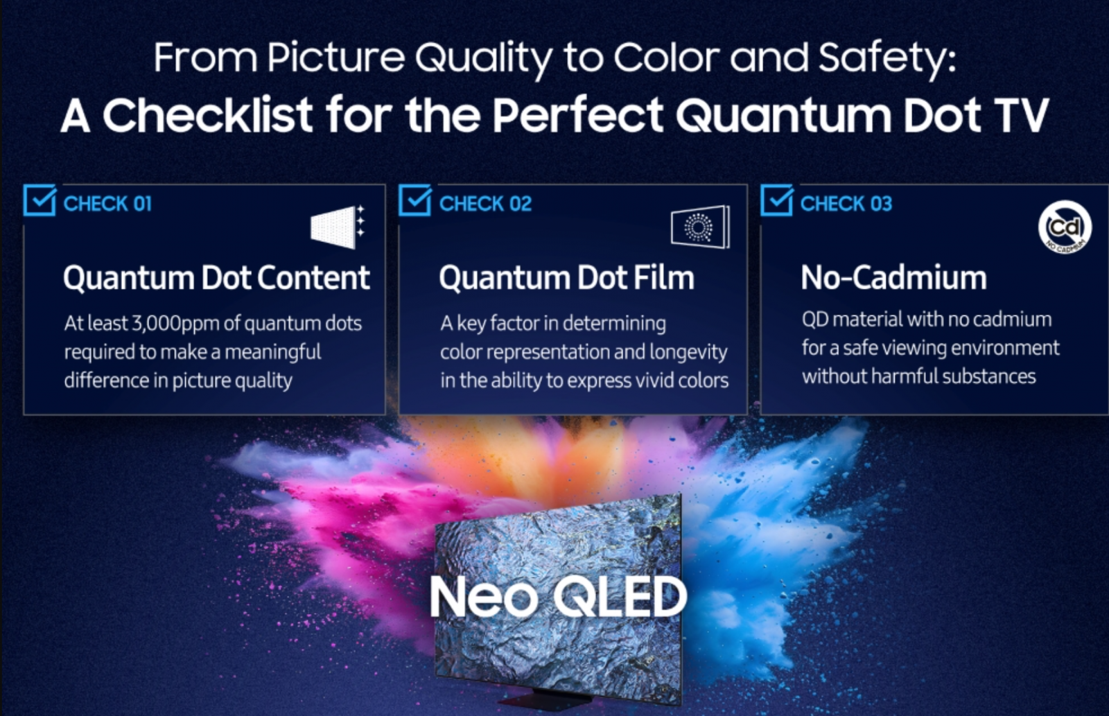 Samsung livrează din 2015 televizoare QLED care folosesc Quantum Dot fără cadmiu, o abordare ecologică care elimină utilizarea acestui metal greu toxic cunoscut pentru riscurile pe care le prezintă pentru sănătatea umană și pentru mediu. Mai mult, cea mai recentă gamă de televizoare QLED a primit certificarea "Real Quantum Dot Display" din partea TÜV Rheinland, o organizație internațională de certificare cu sediul în Germania.