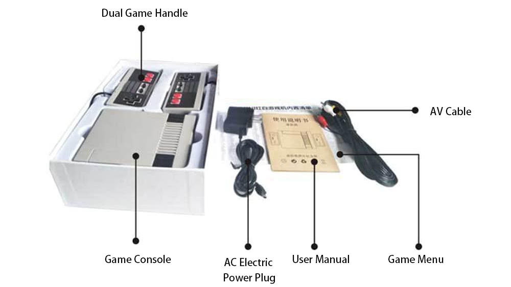 În primul rând trebuie știut că la bordul acestei mini-console avem un număr generos de 500 jocuri clasice pe care le putem juca pe televizor. La pachet găsim și 2 gamepad-uri cu fir, un cablu de alimentare, un adaptor pentru prizele europene, manualul de utilizare și un cablu audio-video prin care vom conecta consola la televizor.