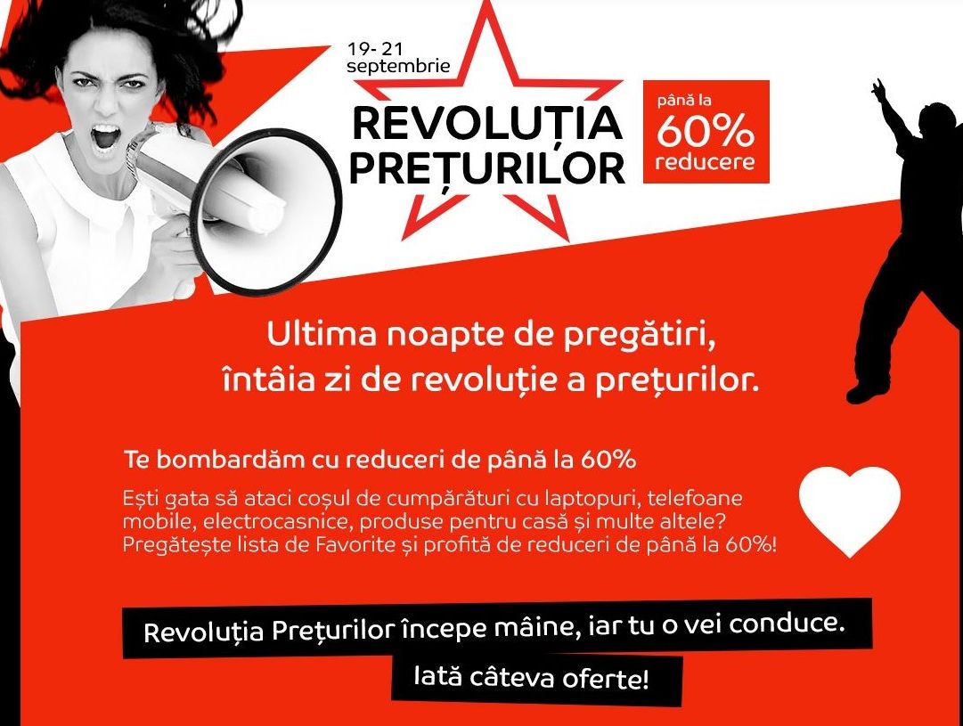 Nu ştiu voi ce faceţi de mâine dimineaţă de pe la 7, dar eu ştiu că mă voi uita pe eMAG.ro pentru că începe noua Revoluţie a preţurilor. Aceasta duce preţurile chiar cu 60% mai jos şi avem spre exemplu un laptop ASUS cu Core i3 şi Windows 10 la 1699 lei, Un Galaxy J5 (2017) la doar 999 lei şi maşina de spălat Whirlpool tot la doar 999 lei.