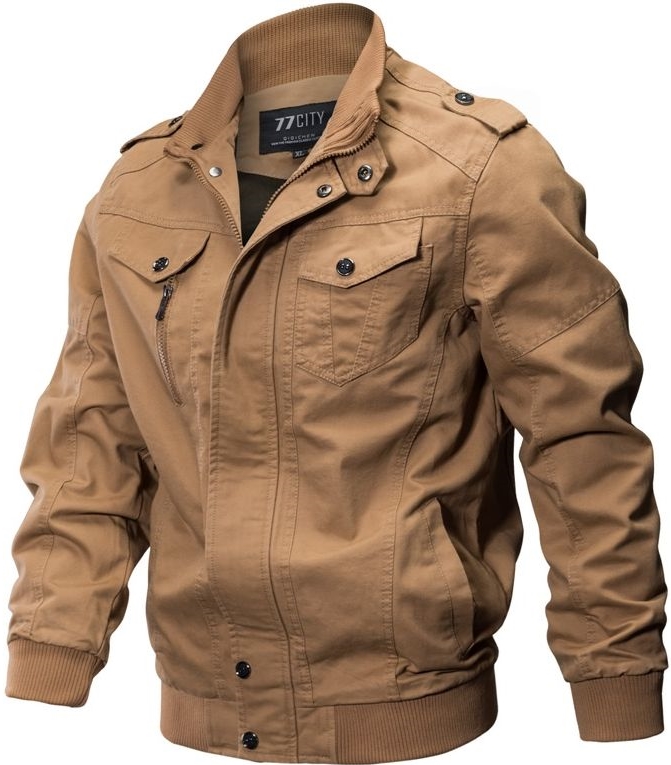Cine vrea să arate ca un militar, dar să nu exagereze cu culori de camuflaj sau cu haine rigide poate cumpăra aceasta jachetă militară la preţ bun de la Banggood.com. Costă doar 59.99 dolari şi vine în dimensiuni de la XS la 4XL. Este o jachetă de toamnă şi primăvară, fabricată din polyester şi bumbac, cu fermoare şi nasturi şi cu un guler ceva mai gros pentru protecţia gâtului de frig.