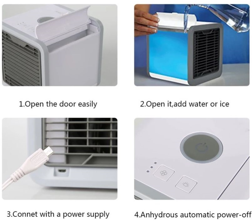 În cazul în care vreţi un ventilator/aer conditionat mai mic şi mai personal, găsiţi la TomTop.com acest mini aparat de răcire la suma de 25.99 dolari. Se conectează via USB şi este un mini aer condiţionat de 10W, cu funcţie de purificare şi umidificare la pachet. Are şi luminiţe în 7 culori şi necesită să fie umplut cu apă, în cantitate de 750 de ml. Face mai puţin de 68 dBA zgomot.