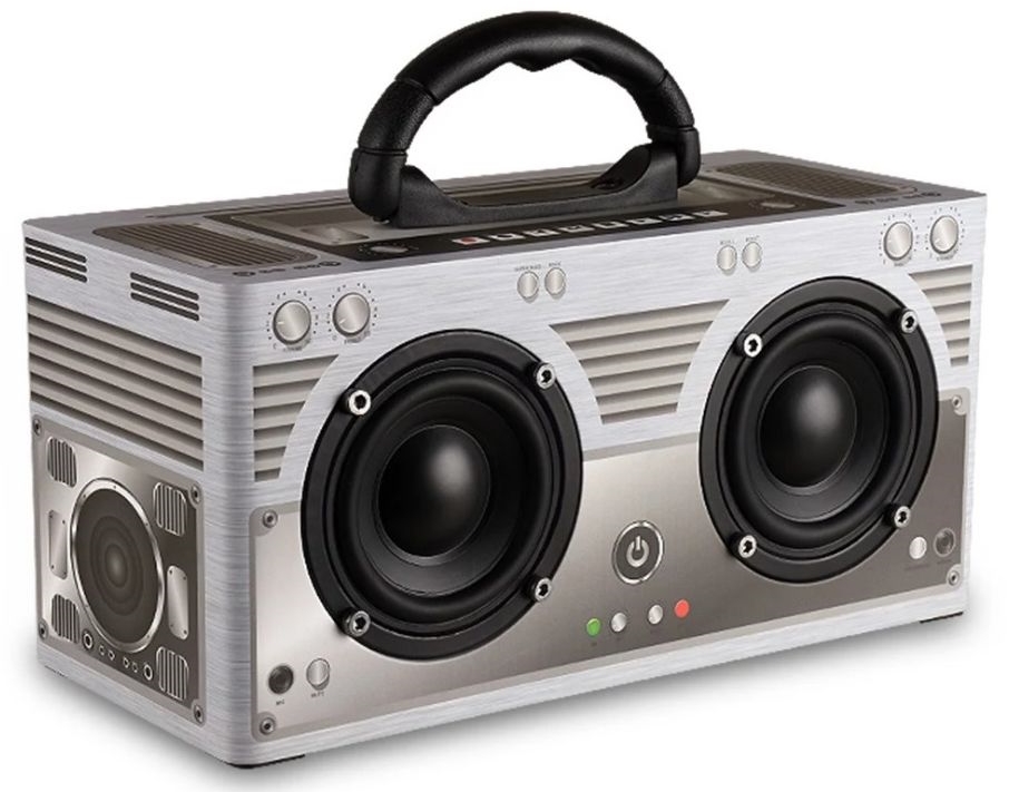 La doar 43 de euro la Cafago.com am găsit o boxă portabilă cu design ca pe vremuri. Arată ca un boombox şi casetofon al anilor 80 şi va aduce multă nostalgie. Pe de altă parte dotările sunt la zi şi pune la bătaie două difuzoare de 6W, Bluetooth 4.2, input audio pe bază de conector de 3.5 mm, slot microSD, radio FM, handsfree şi are o baterie de 3000 mAh ce asigură 6 ore de playback muzical sau 8 ore de convorbiri. Are şi mâner pentru a fi transportat mai uşor.