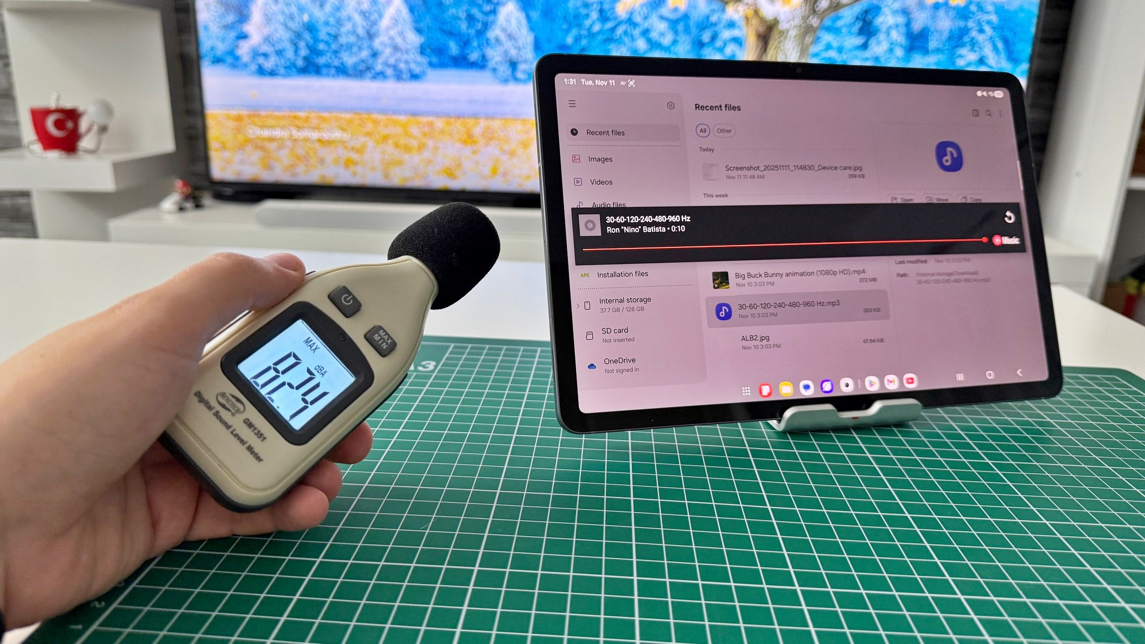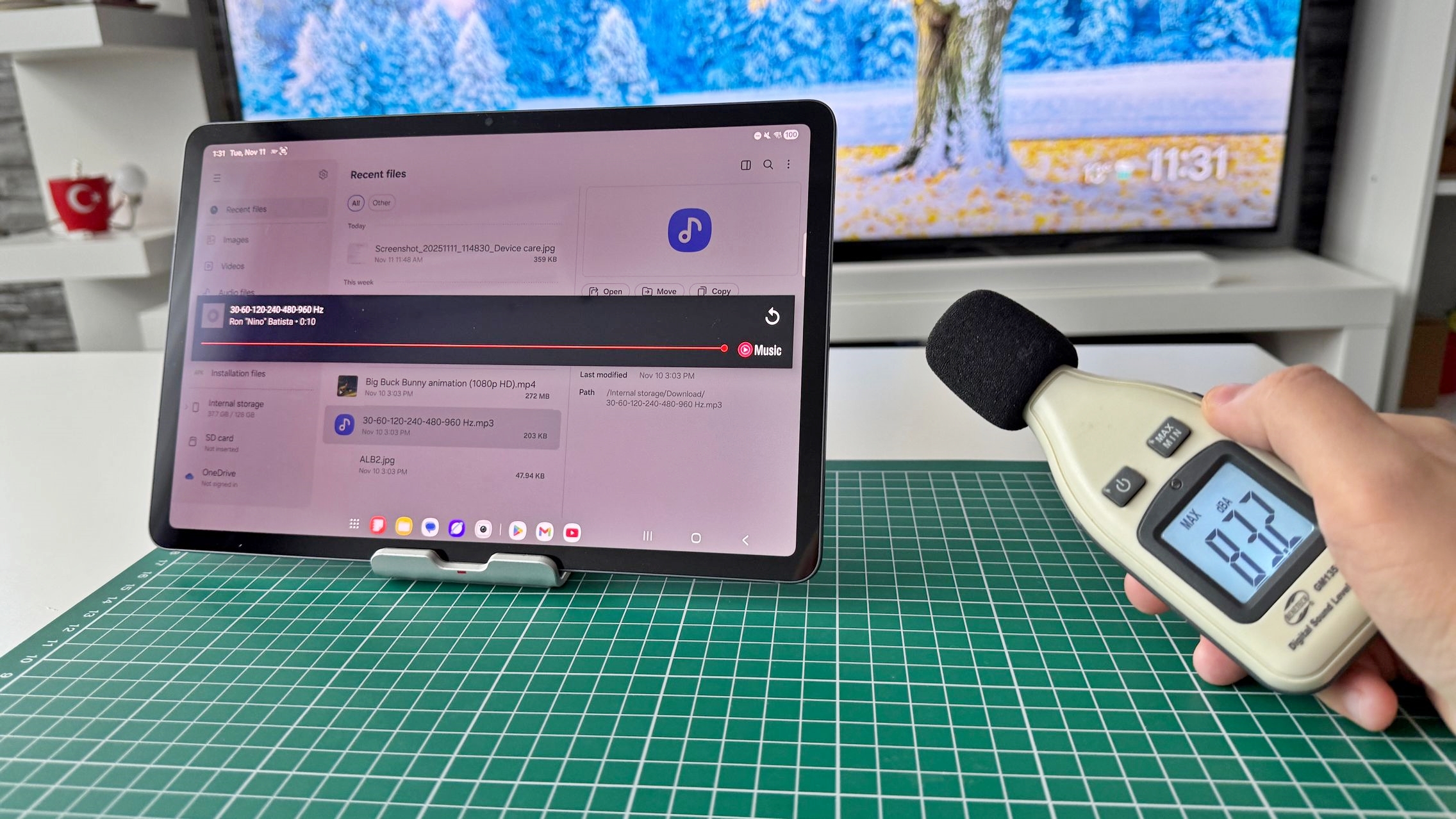 Samsung vine cu difuzoare stereo pe tableta Galaxy Tab S11, 4 la număr, poziționate două în stânga și două în dreapta atunci când ții dispozitivul în landscape. Am ajuns la 82,4 dBA sus și 83,2 dBA jos la testul cu sample acustic și pe multimedia la 95,4 dBA, la nivel cu un MatePad Pro 12.2 și peste Tab S10 FE, Tab S9 FE+.
