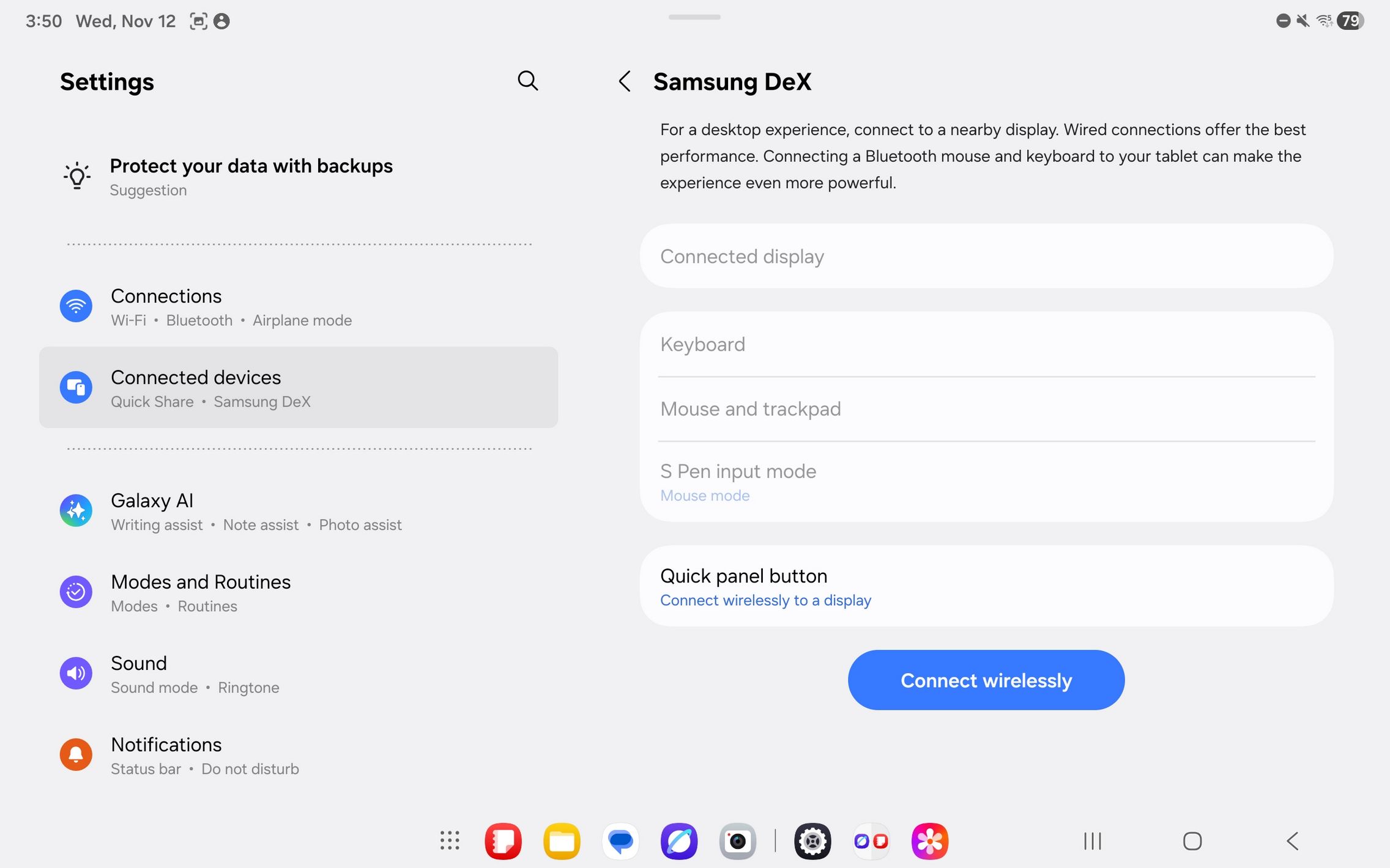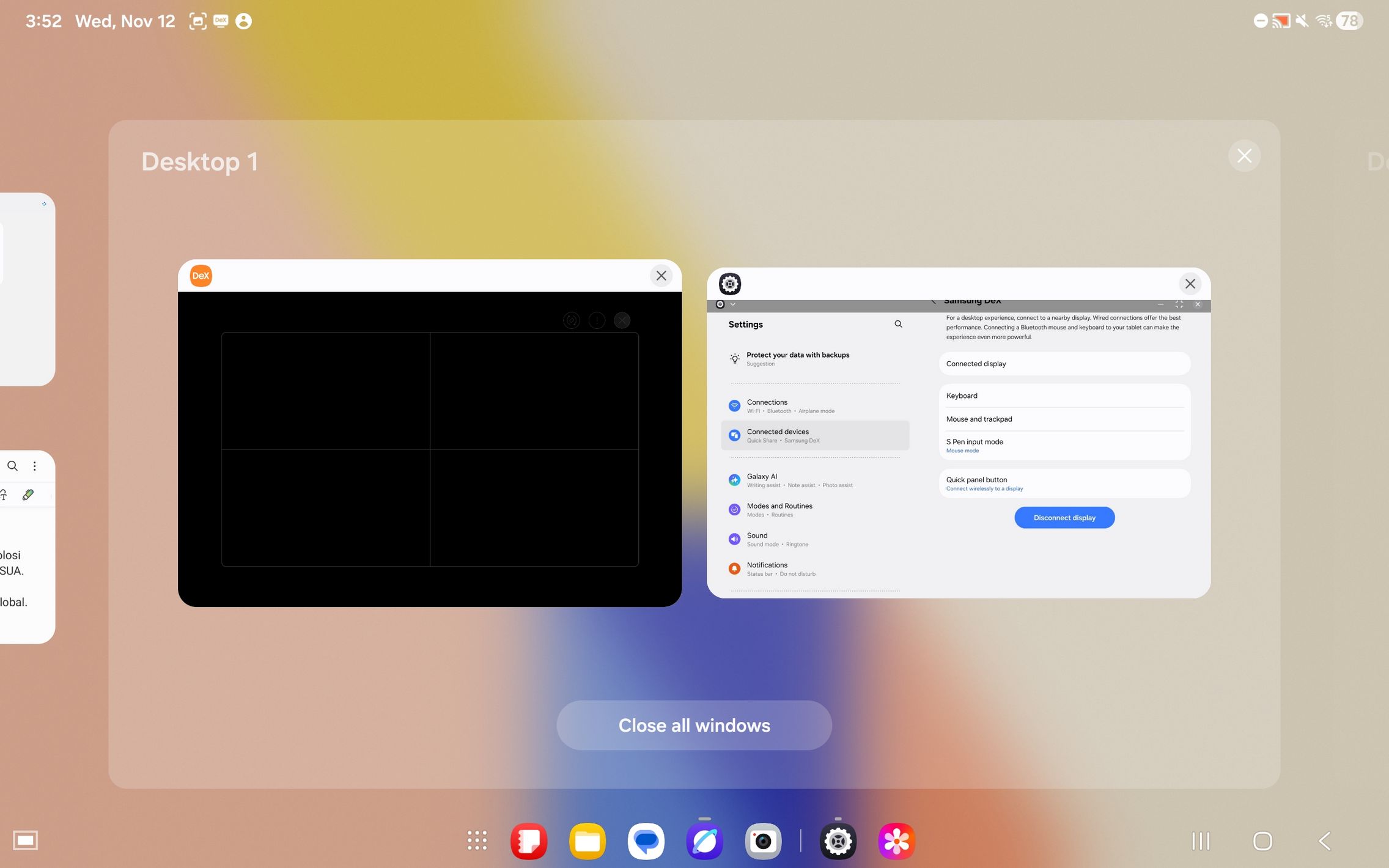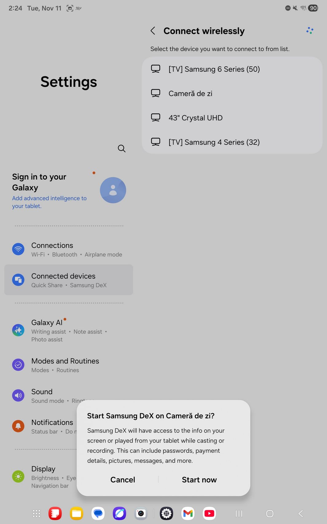 - Samsung DeX: interfață tip desktop pe ecranul tabletei sau conectată la un monitor/TV