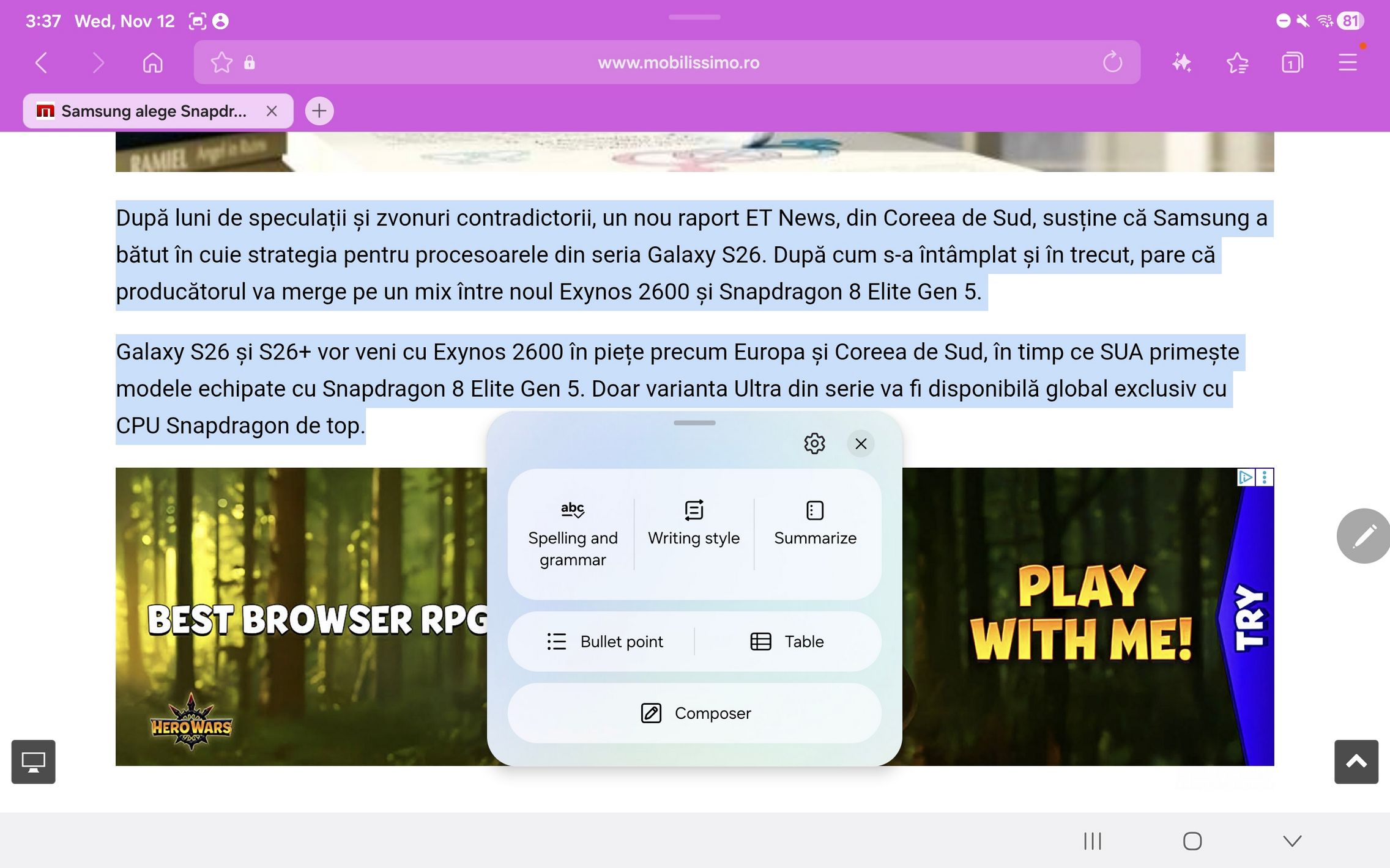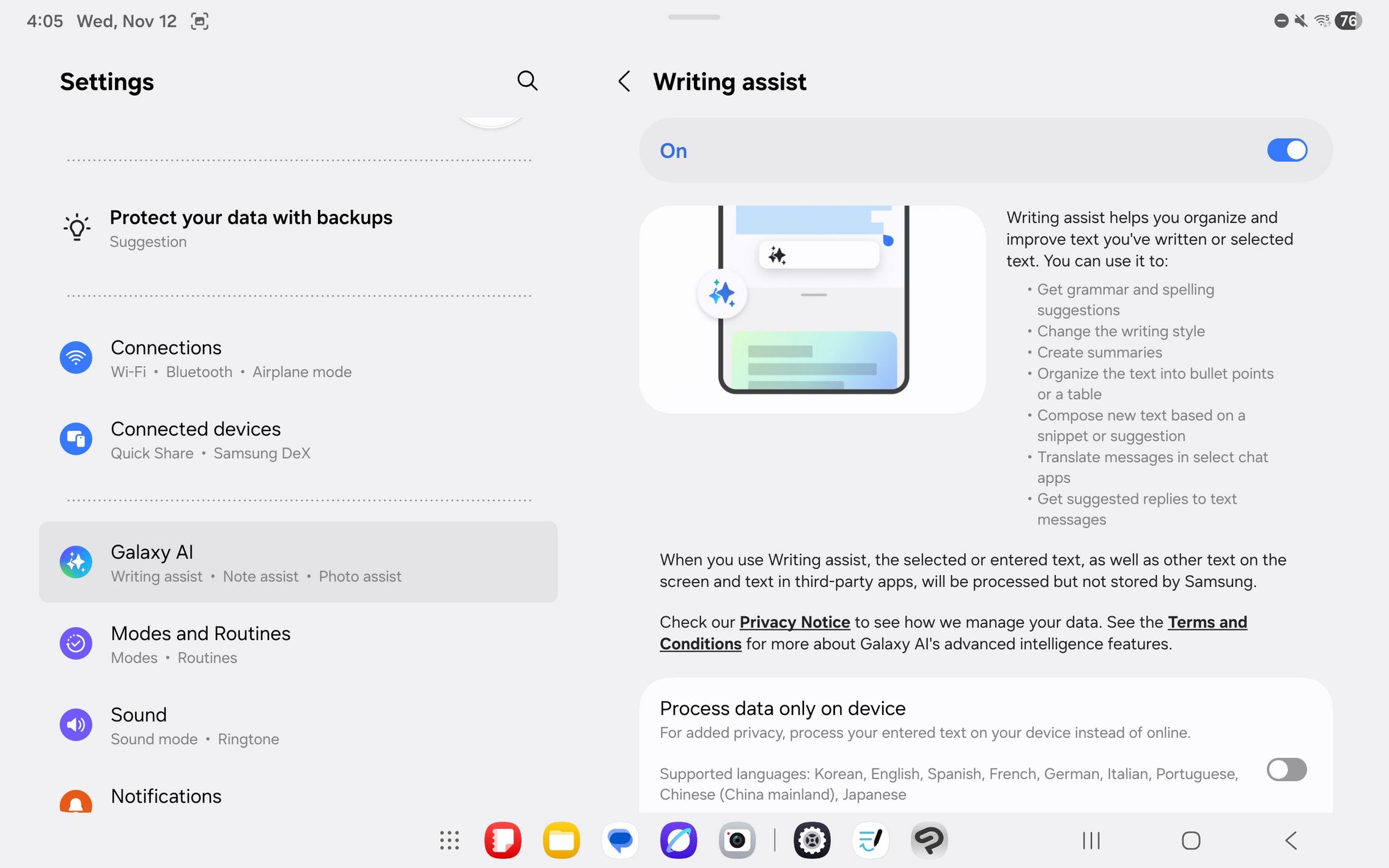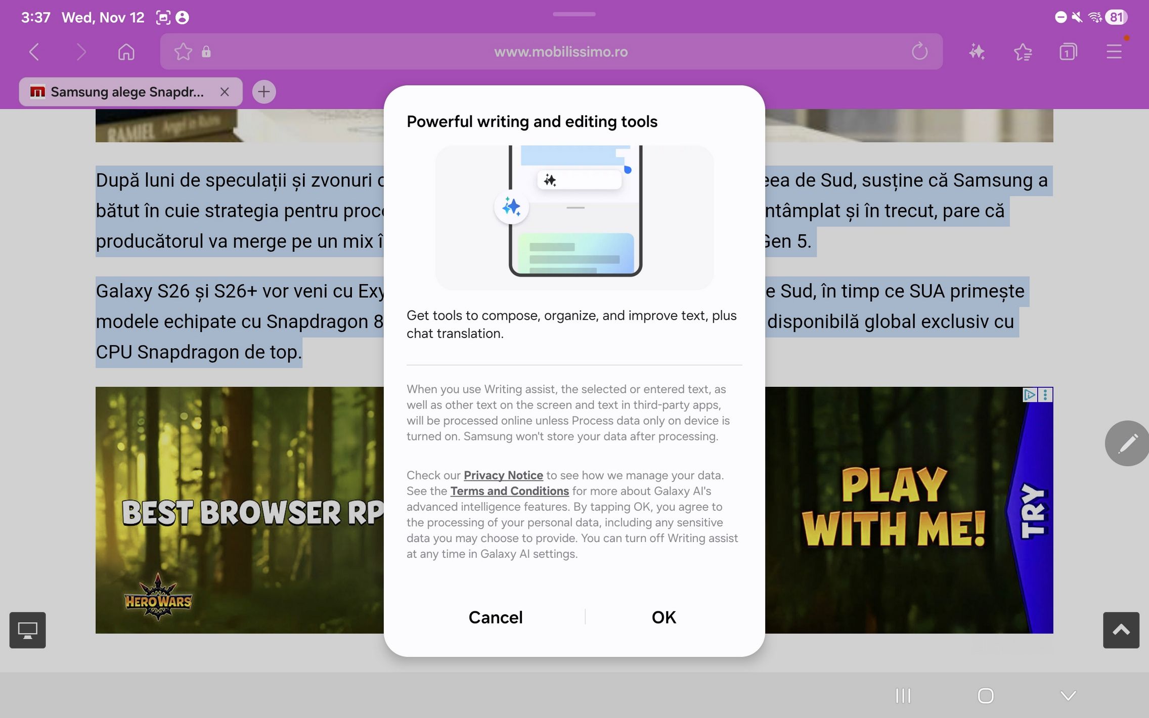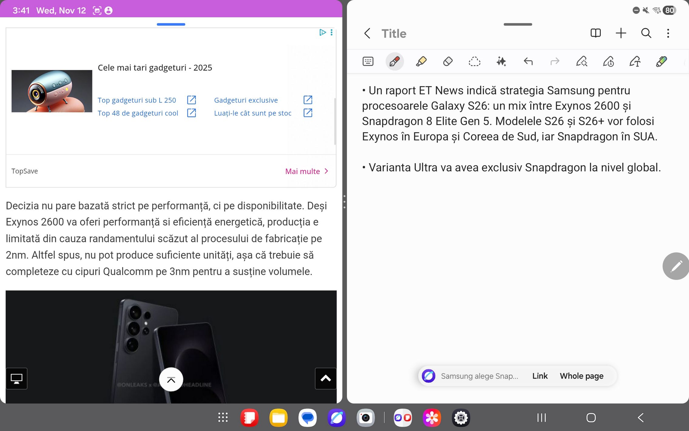 Pe Tab S11 Ultra am descoperit toată suita Galaxy AI, care e deja disponibilă în limba română. Tableta devine practic un asistent digital extins, pentru a scrie mai ușor, traduce, edita, crea rezumate, iar cu Drawing Assist transformi schițele în ceva mult mai arătos, fără să fii neapărat artist.