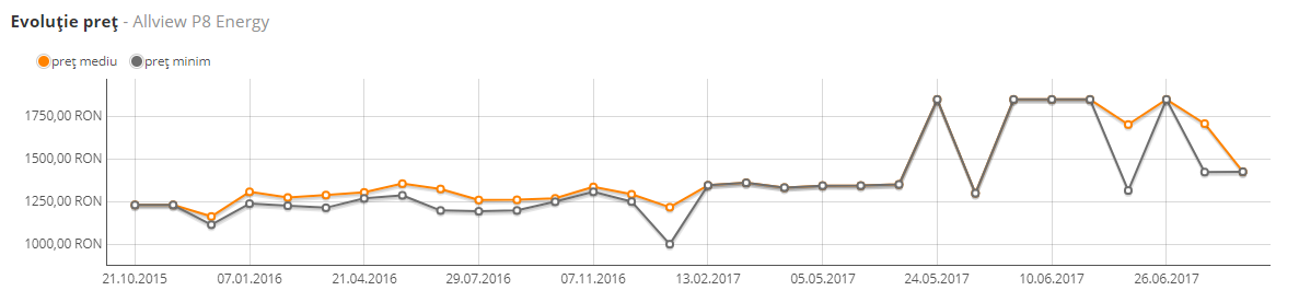 Vedeți mai sus și graficul cu evoluția de preț a lui Allview P8 Energy, telefon ce era listat la prețul de 1.849 lei pe 26 iunie, respectiv la 1.707 lei ieri pe data de 27 iunie. Astăzi pe compari.ro mai găsim doar un magazin ce are produsul în stoc la suma de 1.422 lei.