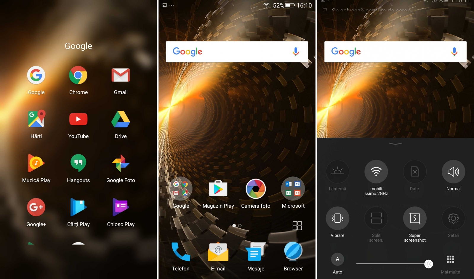 Avem şi gesturi smart, precum Smart Dial, Smart Answer şi Dublu Tap pentru Activare. Widget-ul Suspend Button e la posturi şi avem şi opţiuni legate de panoul de notificări sau LED-ul de notificări. În privinţa aplicaţiilor preinstalate avem 56 de nume aici, un număr cam mare şi puţine aplicaţii sunt dezinstalabile. De remarcat folderul cu aplicaţii Microsoft, printre care şi Outlook, Word, Excel, PowerPoint, OneNote sau OneDrive, dar şi Skype. Mai primim şi Bitdefender, Chameleon, Child Mode, Notes, , Private Space, System Manager, Trip Plan, Theme Park şi Video Editor.