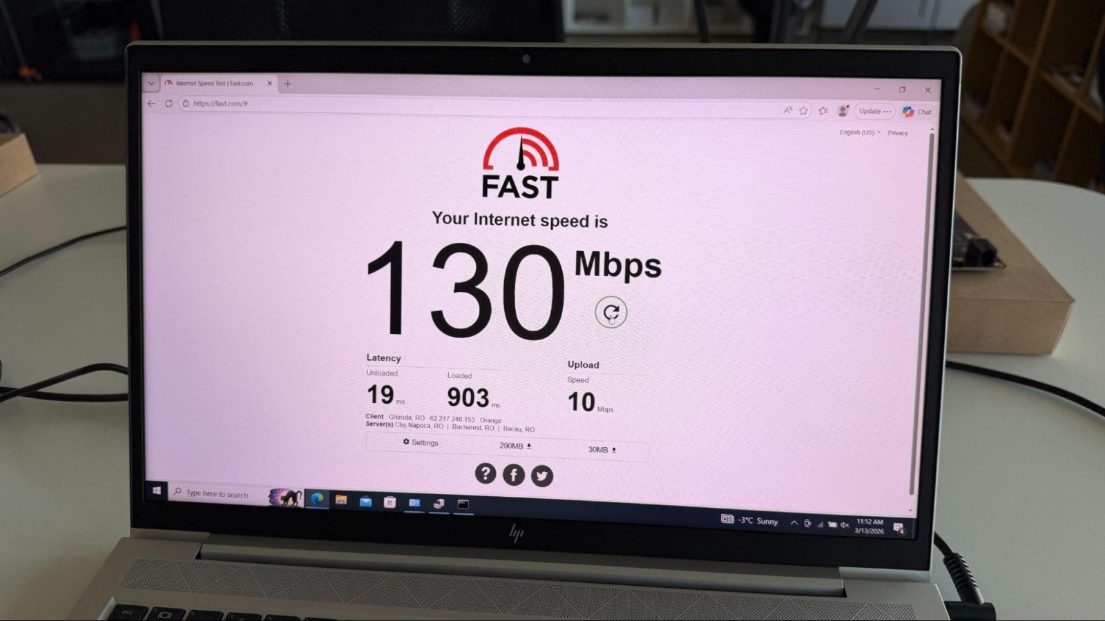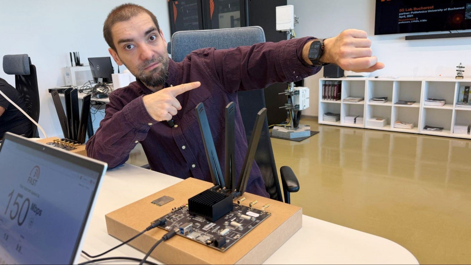 Terminalul nu era un telefon, ci un modem experimental conectat la laptop. Pe ecran apărea un test de viteză care arăta rezultatele în timp real. Valorile au ajuns la aproximativ 150 Mbps pentru download și 50 Mbps pentru upload, niveluri suficiente pentru majoritatea aplicațiilor industriale și comerciale.