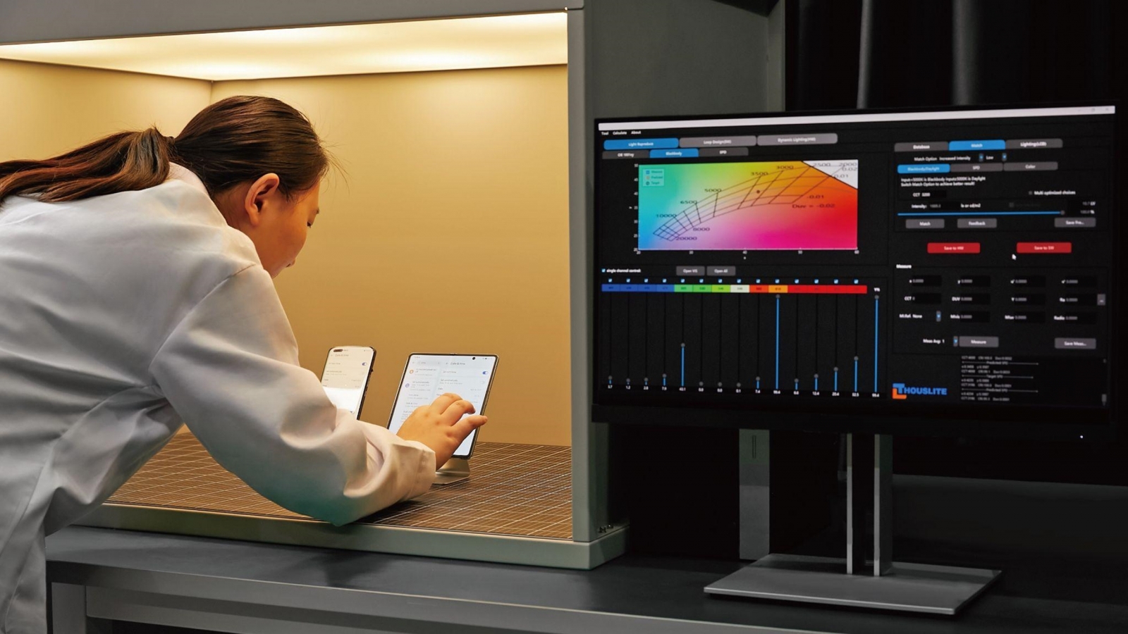 Alături, într-un alt laborator, se lucrează la ecrane. Vezi o ingineră verificând două telefoane pliabile în fața unui monitor cu grafic de culoare și temperatură de alb. De fapt, aici se calibrează luminozitatea, balansul de alb și comportamentul ecranului în diferite scenarii: lumină caldă de interior, lumină rece, mod întunecat, modul de protecție a ochilor. Software-ul controlează LED-urile din plafon, măsoară răspunsul panoului și trimite corecții în firmware. Din aceeași zonă vine și partea de „Vision Health”: PWM la frecvențe foarte mari, dimming dinamic, ajustarea culorilor seara pentru a nu obosi ochii.