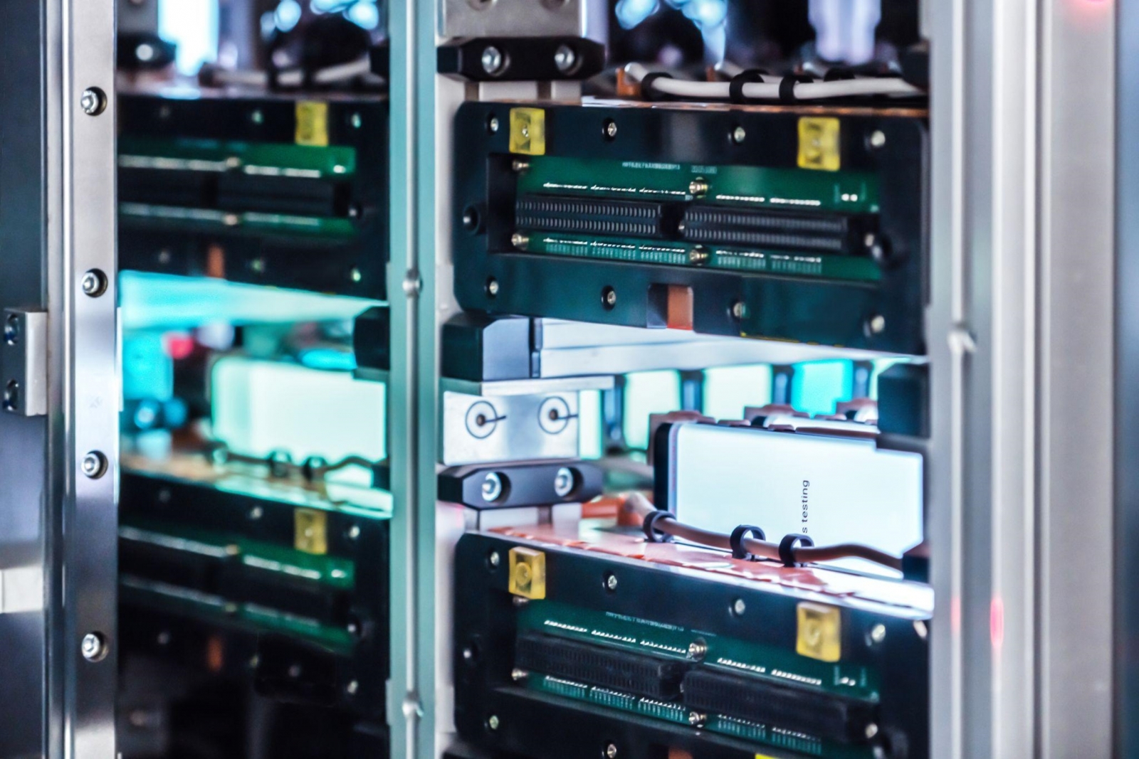 Prima oprire este în zona de testare automată, unde vezi rafturi metalice pline cu telefoane conectate în rig-uri, cablate strâns, cu ecranele aprinse uniform. E faza de burn-in și stress-test, în care hardware-ul este ținut la limită ore și zile întregi. Aici se simulează ani de utilizare în câteva sute sau mii de cicluri: încărcare-descărcare repetată, schimbări de temperatură, rulare continuă de aplicații, totul controlat de AI care monitorizează tensiuni, curenți și temperaturi. Orice deviație iese imediat în grafice, iar telefonul problematic este scos din banc și „disecat”.