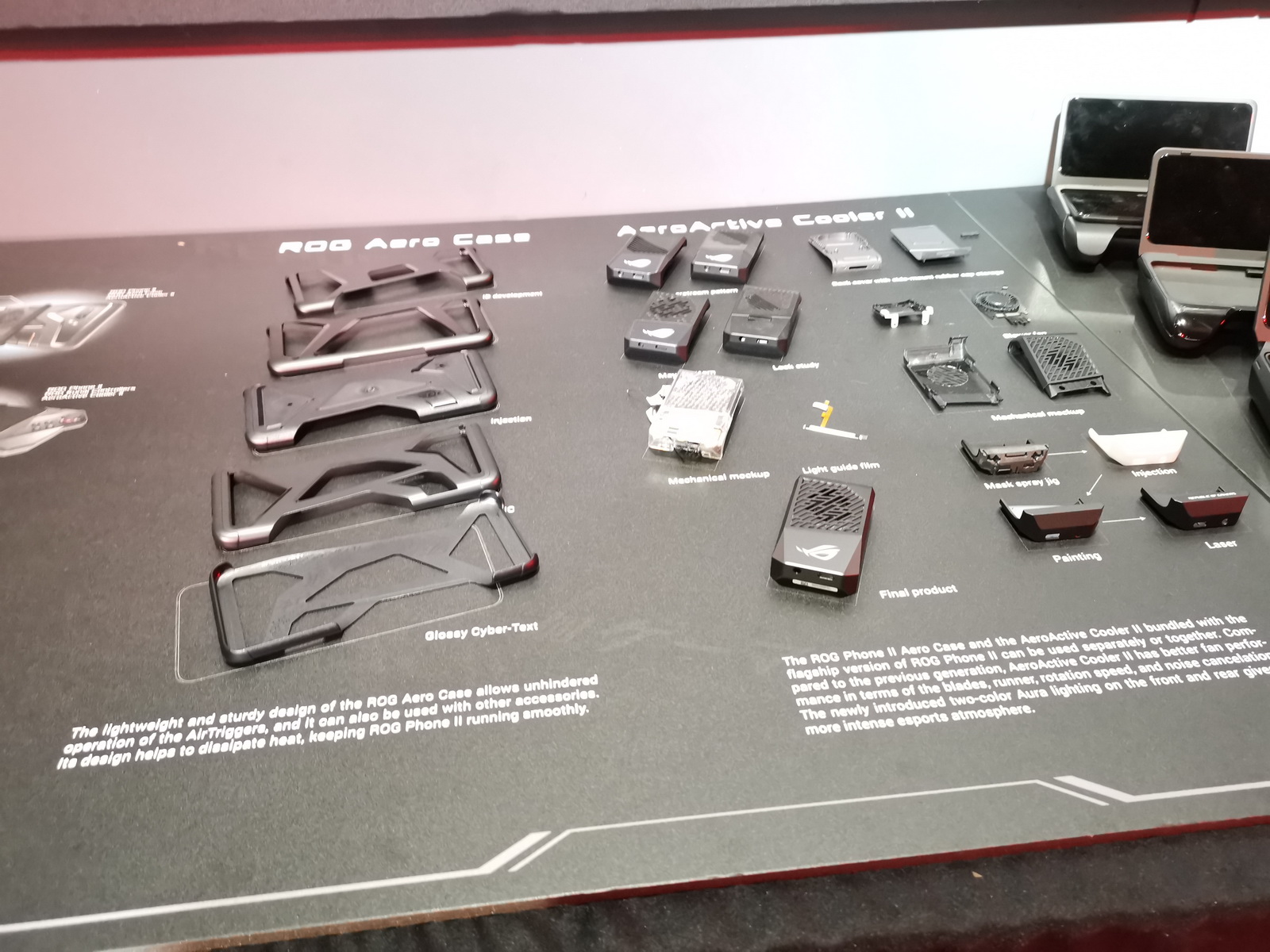 TwinView Dock 2 este disecat, cu bateria la vedere şi vedem şi cutia telefonului, plus joystick-ul Kunai cu holder, gamepad şi husa dedicată. Privim la interiorul lui Aero Active Cooler şi avem şi desene şi schiţe de ROG Phone 2, unele aducând cu un Nintendo DS. S-a trecut prin multe prototipuri până la designul final, cel câştigător, se pare.