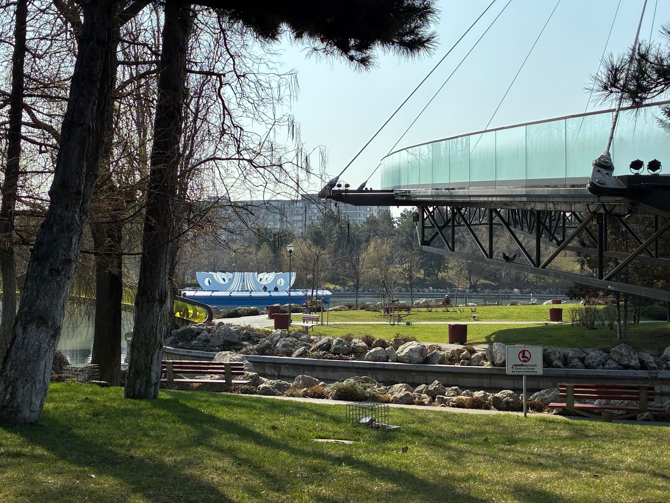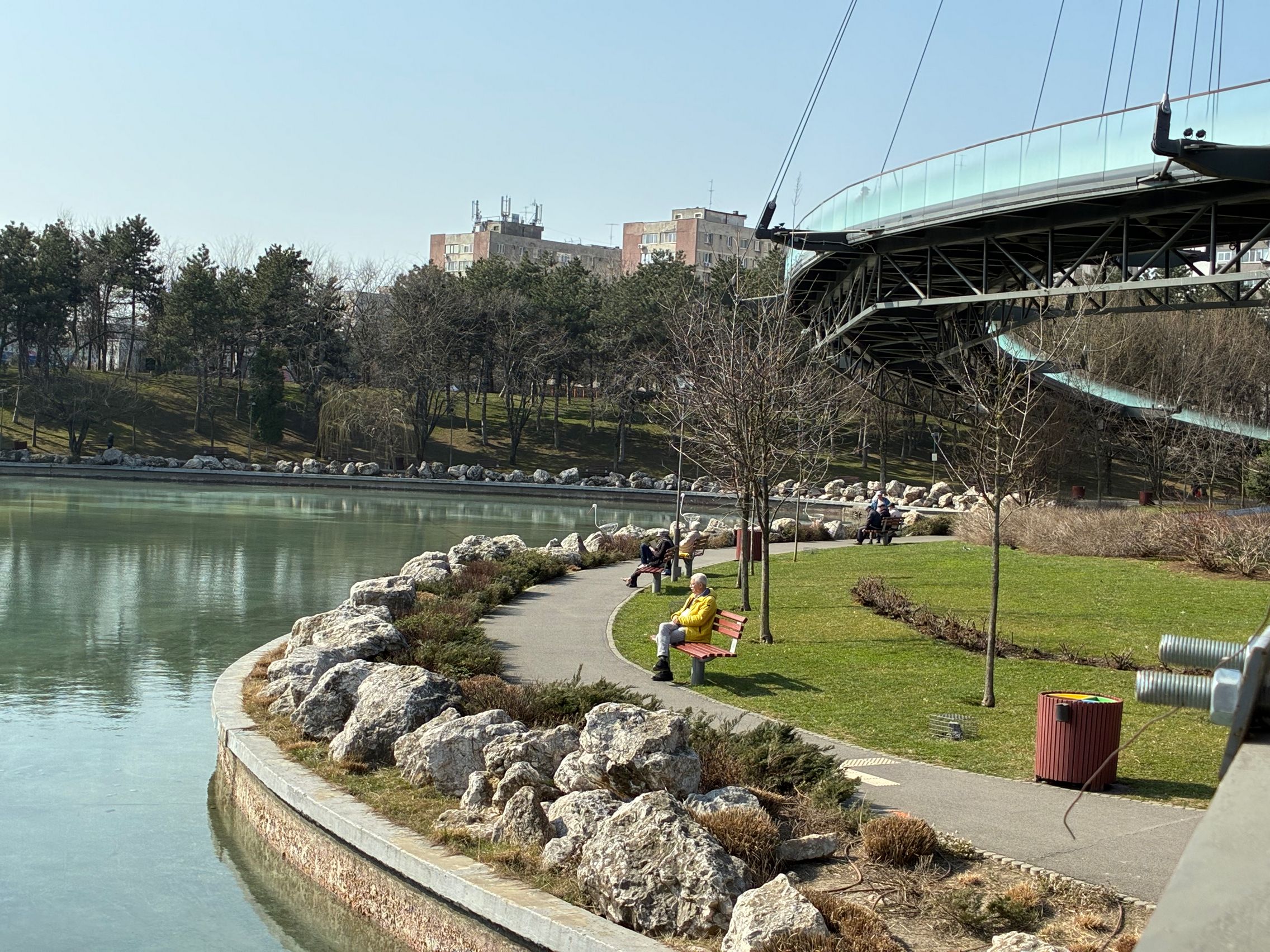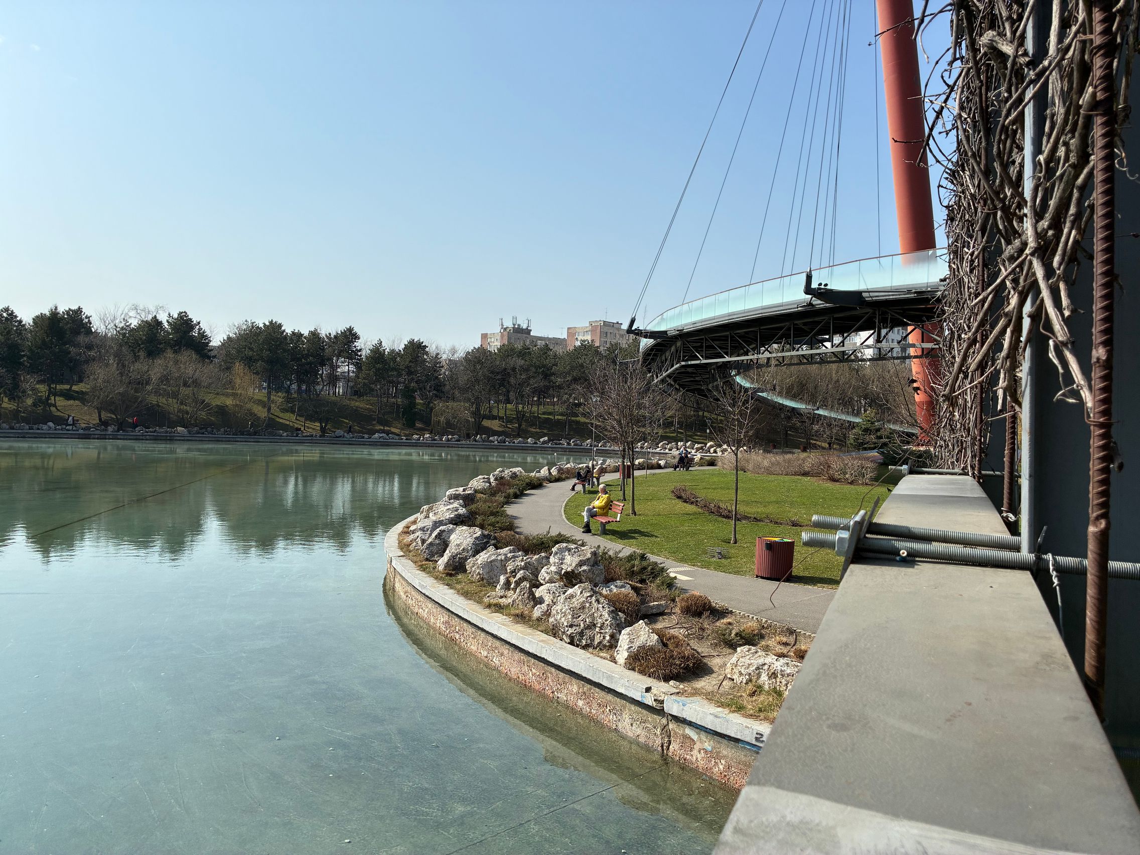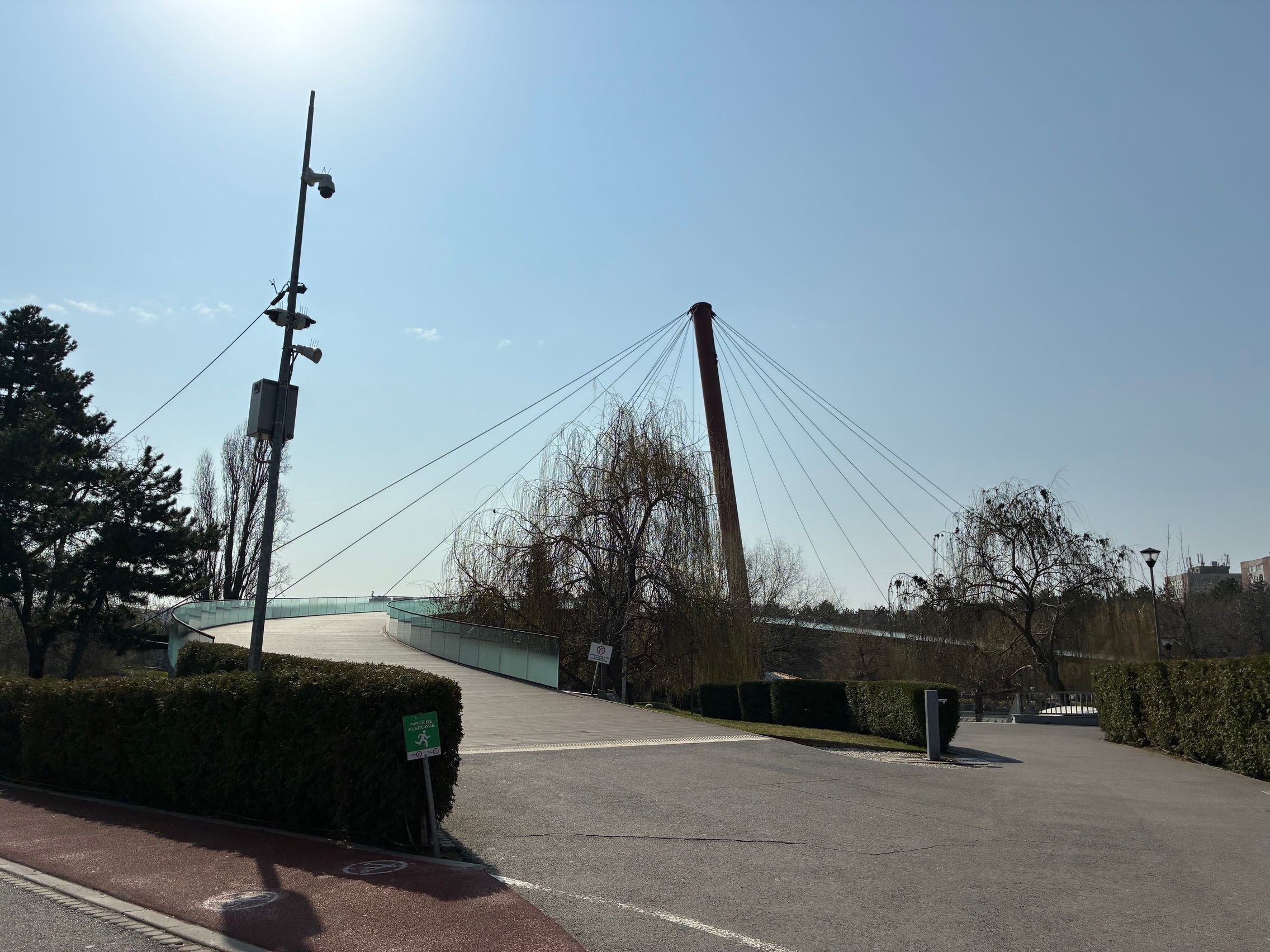 Avem dynamic range bun în fotografiile din această galerie, iar legat de HDR, singurul moment în care a fost derutat, a fost la stația de autobuz când elementele din fața camerei au rămas întunecate, cu soarele sus pe cer în cadru. Prin parc arhitectura a fost prinsă în armonie cu natura, podul răsare de printre copacii înverziți iar apa este cristalină, cu un lac proaspăt alimentat.