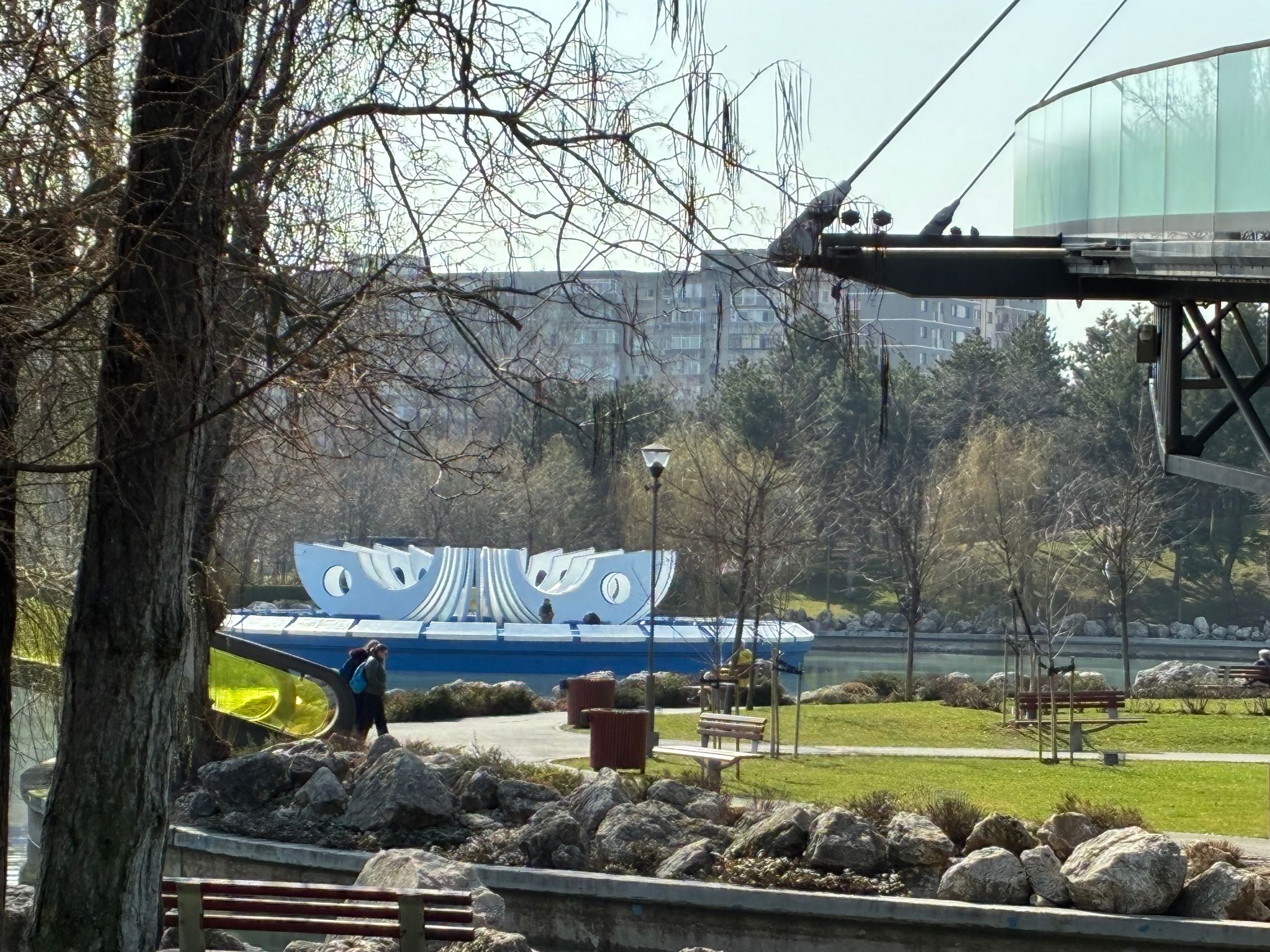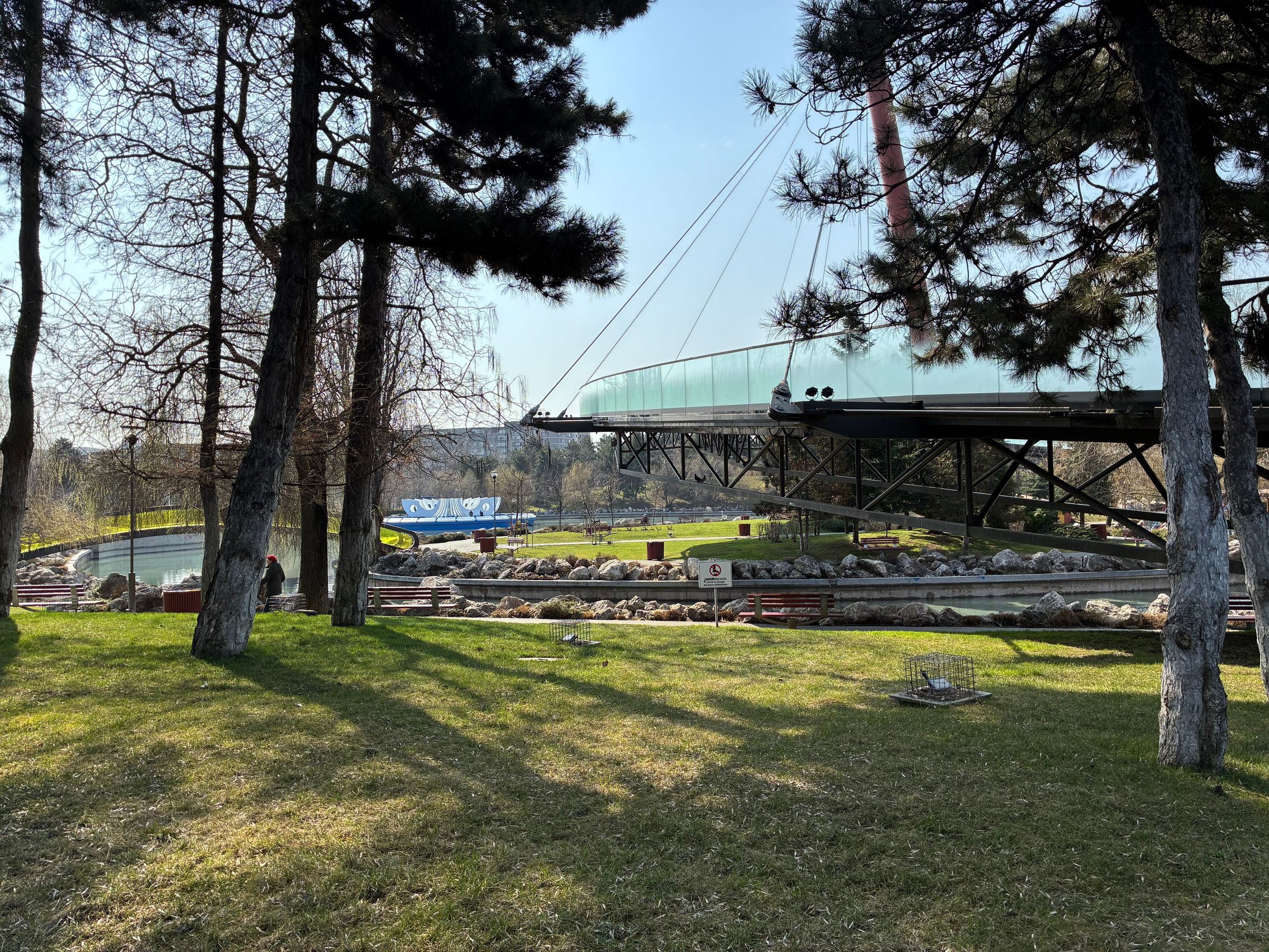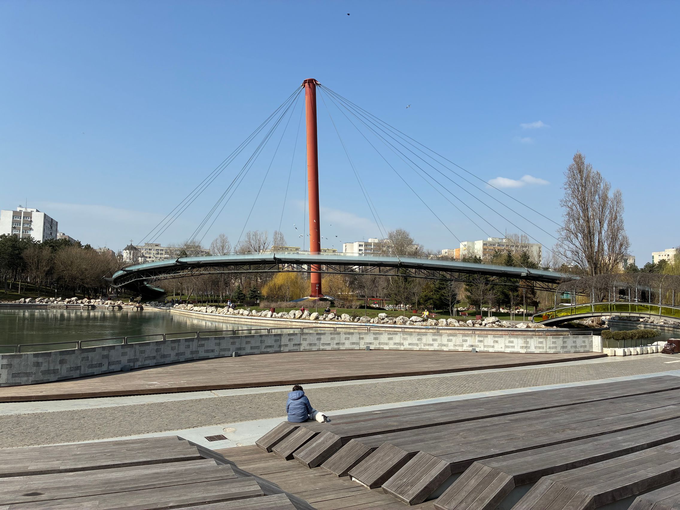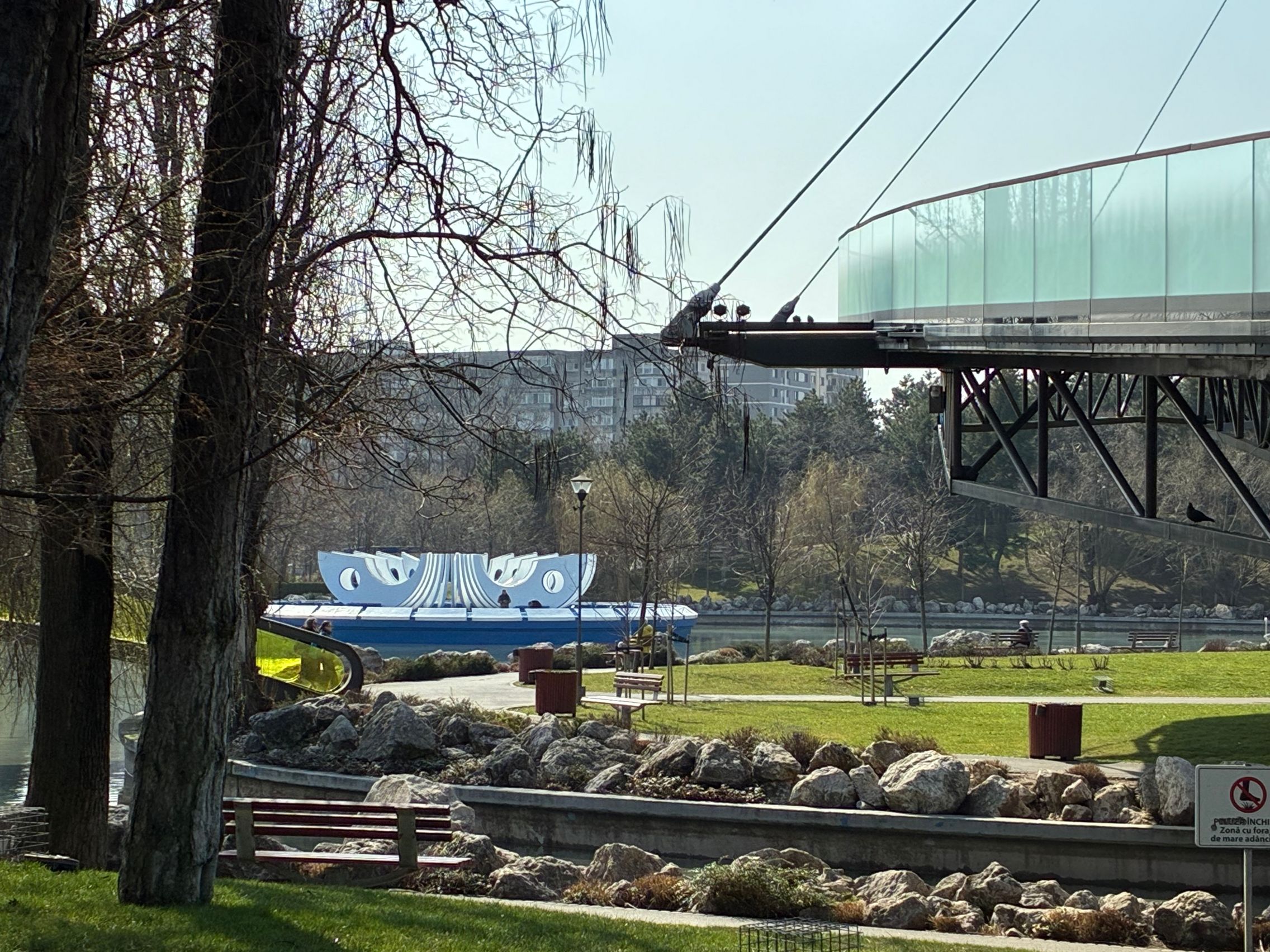 Avem dynamic range bun în fotografiile din această galerie, iar legat de HDR, singurul moment în care a fost derutat, a fost la stația de autobuz când elementele din fața camerei au rămas întunecate, cu soarele sus pe cer în cadru. Prin parc arhitectura a fost prinsă în armonie cu natura, podul răsare de printre copacii înverziți iar apa este cristalină, cu un lac proaspăt alimentat.