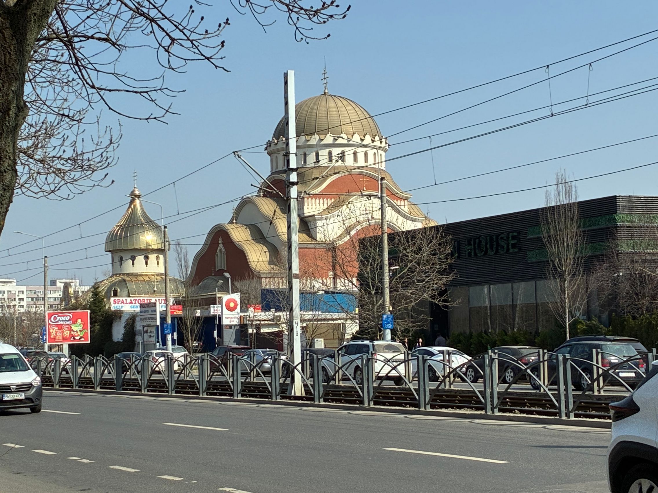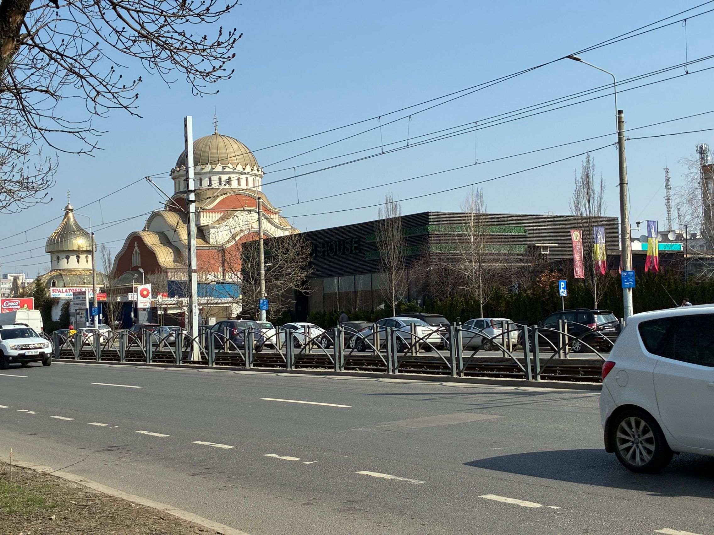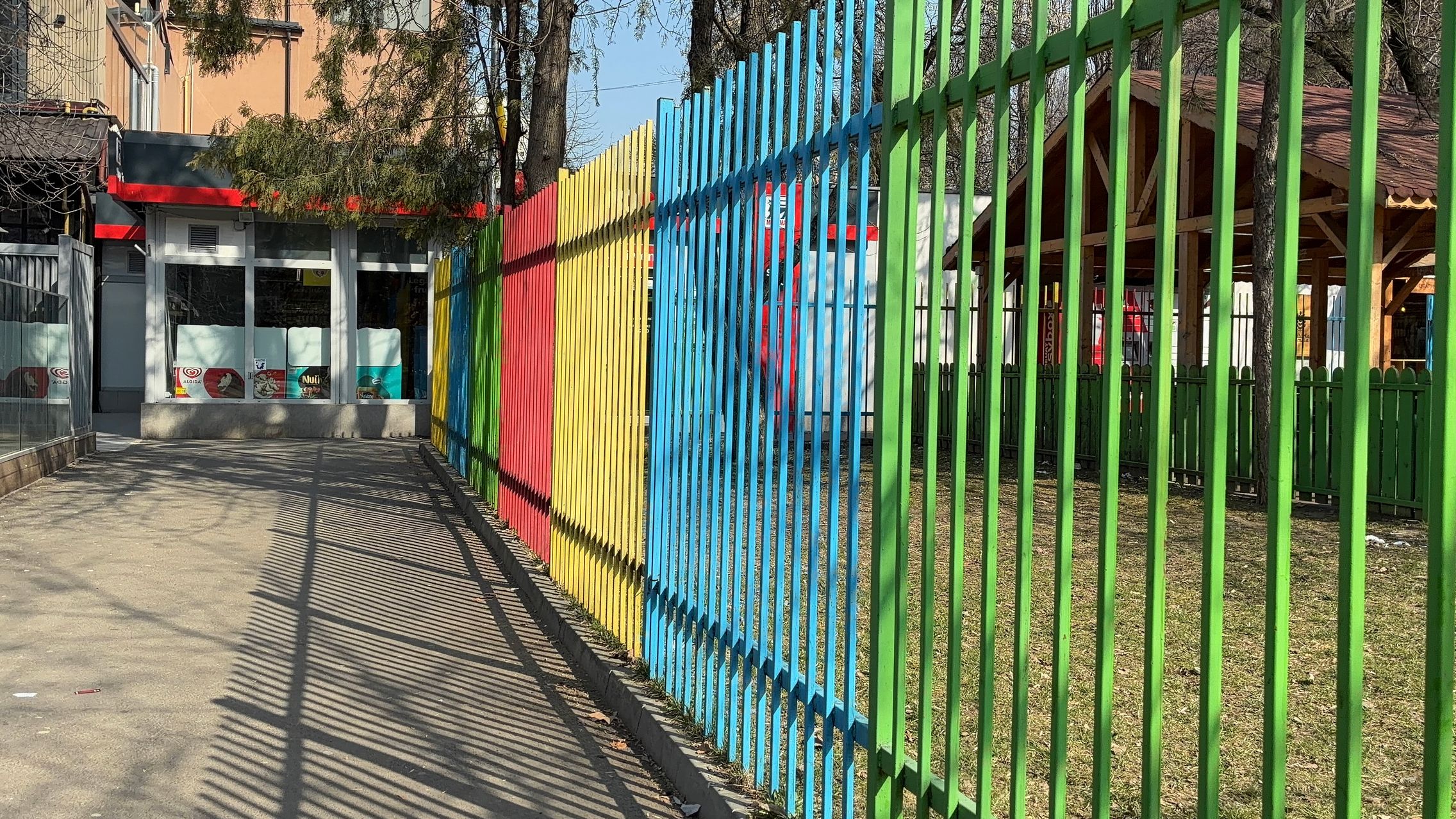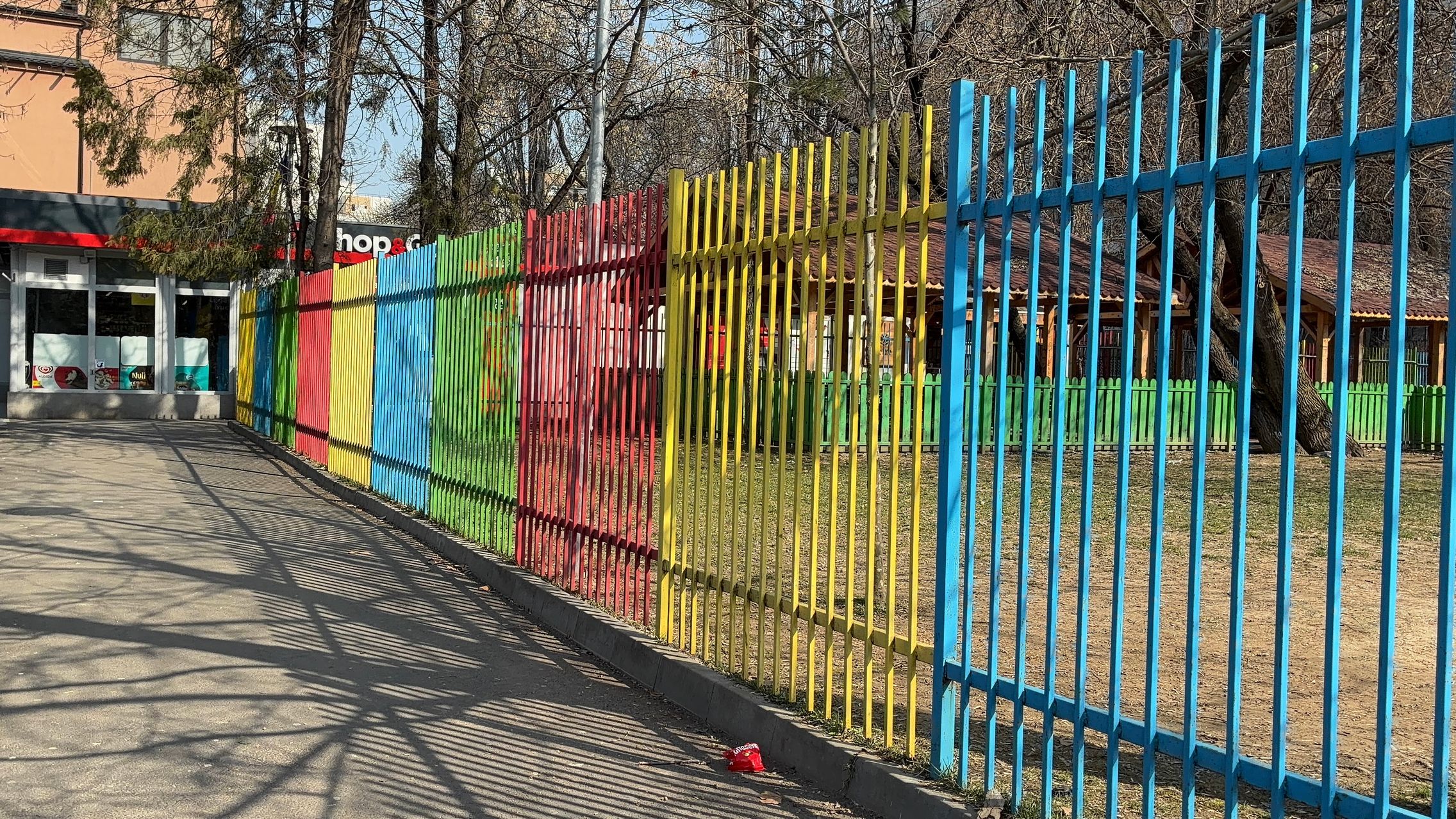 Nu există ultra-wide, dar sunt mulțumit de unghiul prins de această cameră principală și dacă mă gândesc ultra-wide-ul e pentru mine camera pe care o folosesc cel mai rar. Cu soarele în față camera rămâne în continuare capabilă, iar roșul Vodafone de la magazin e prins vibrant și văd diferențe între roșul de lângă, de la bancă. Roșul gardului e cuminte, după ani și ani la rând în care soarele i-a furat din măreție.