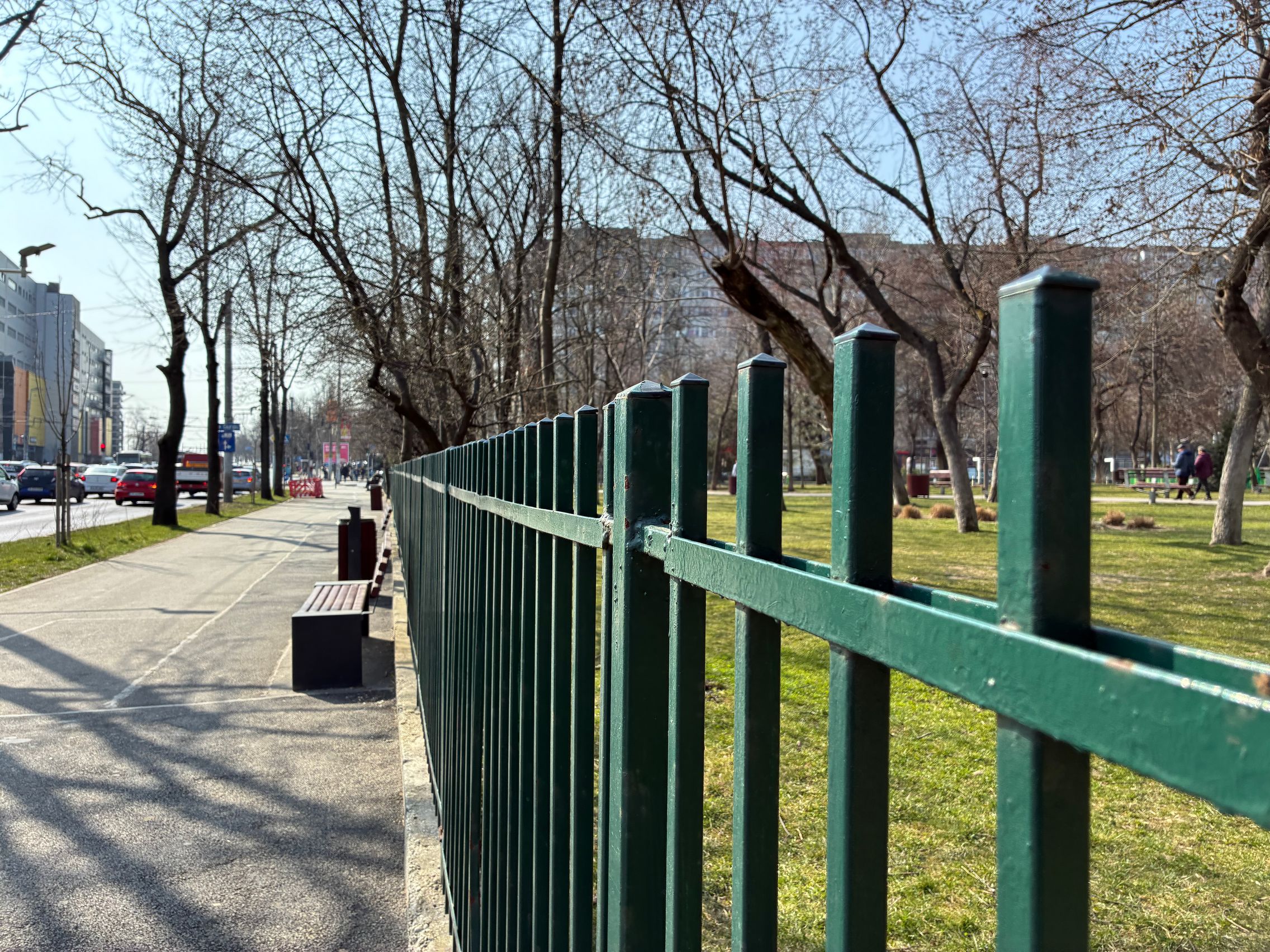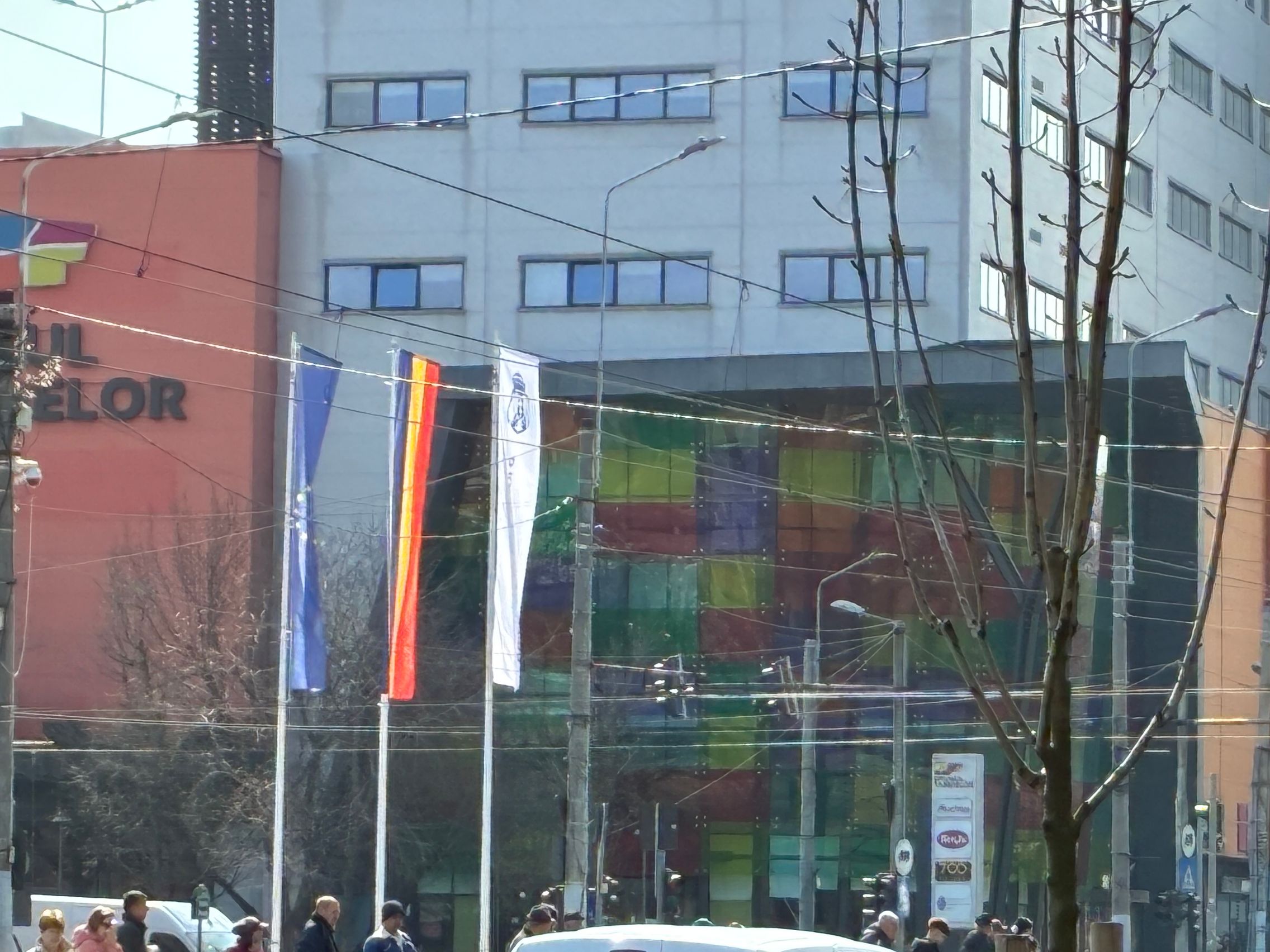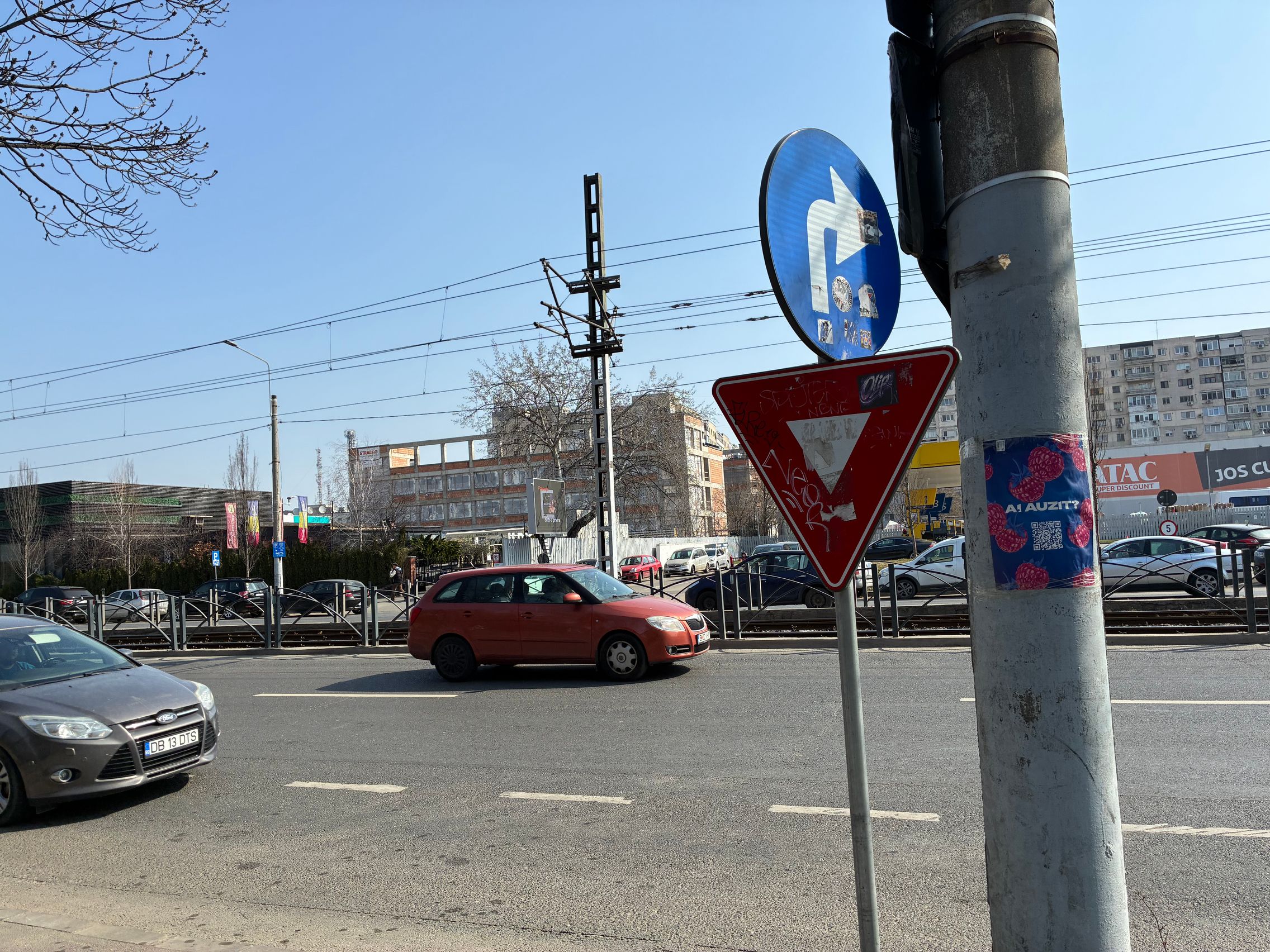 Nu există ultra-wide, dar sunt mulțumit de unghiul prins de această cameră principală și dacă mă gândesc ultra-wide-ul e pentru mine camera pe care o folosesc cel mai rar. Cu soarele în față camera rămâne în continuare capabilă, iar roșul Vodafone de la magazin e prins vibrant și văd diferențe între roșul de lângă, de la bancă. Roșul gardului e cuminte, după ani și ani la rând în care soarele i-a furat din măreție.