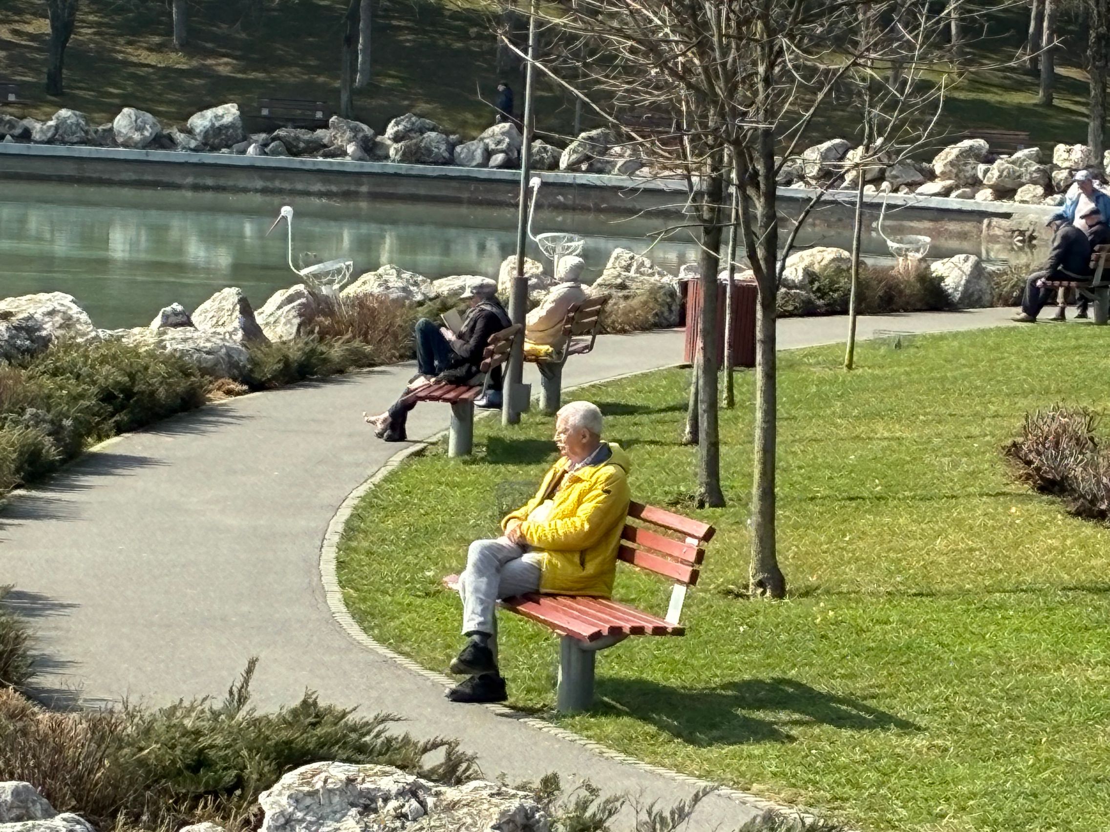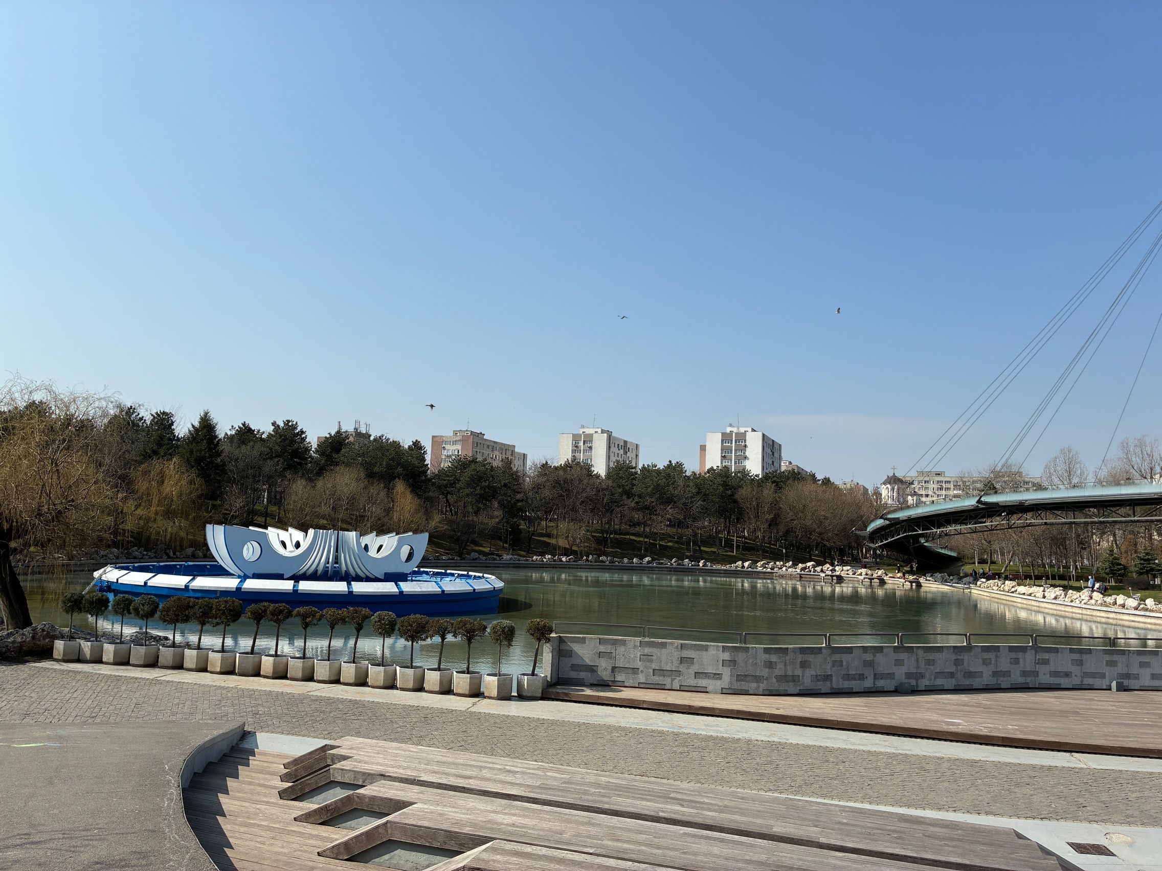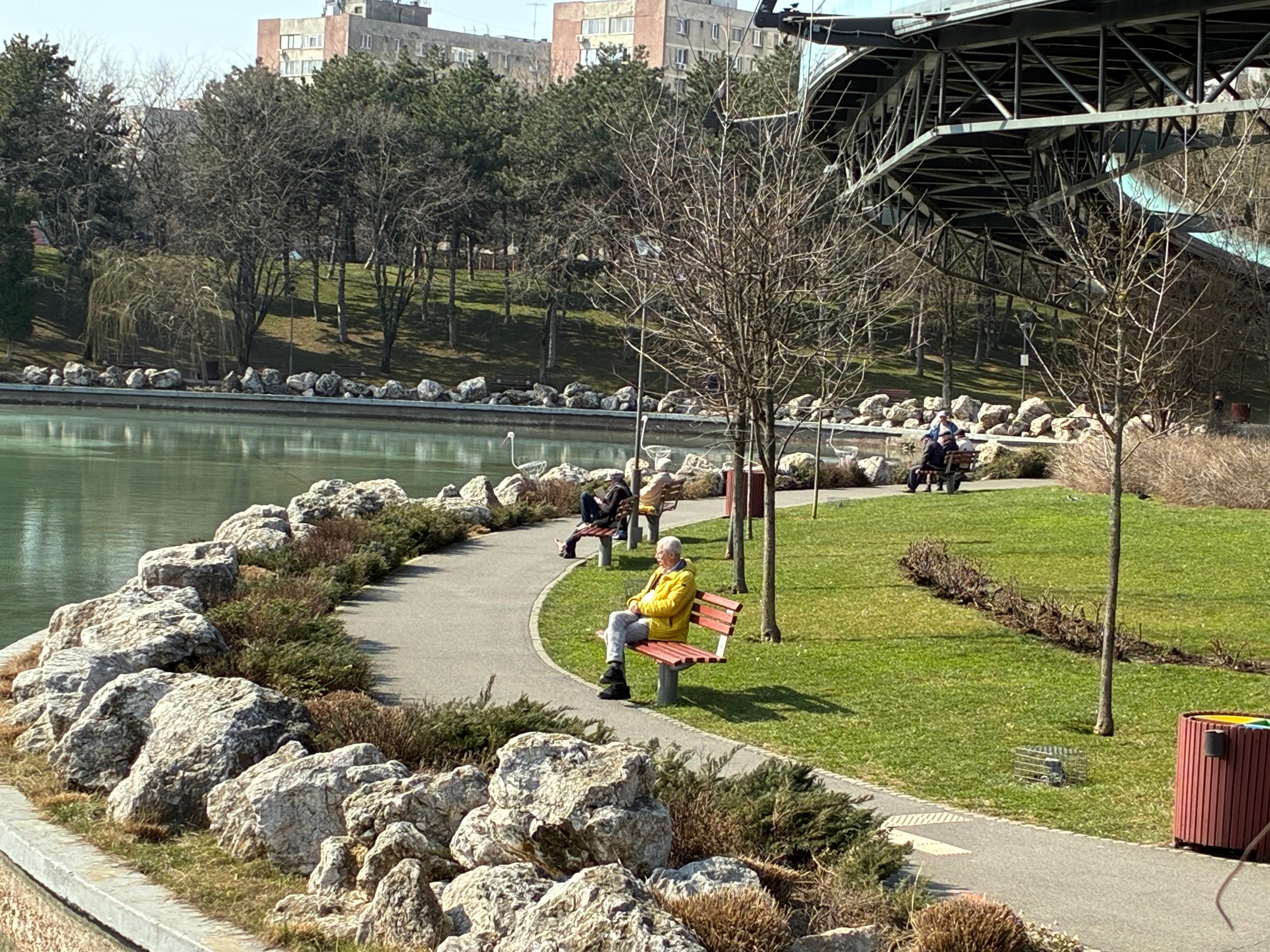 Culorile gardului sunt 1:1 cu ce am văzut și la foto și în realitate. Testul de stabilizare este reușit și la urcarea treptelor din parc. Am dat apoi și zoom spre fântâna din mijlocul lacului, iar pentru nivelul 6x maxim nu e tocmai rău. Am dat zoom și spre un nene cu geacă galbenă care se bucura de soarele cald de primăvară, iar panomarea e smooth, fără trepidații sau ezitări.