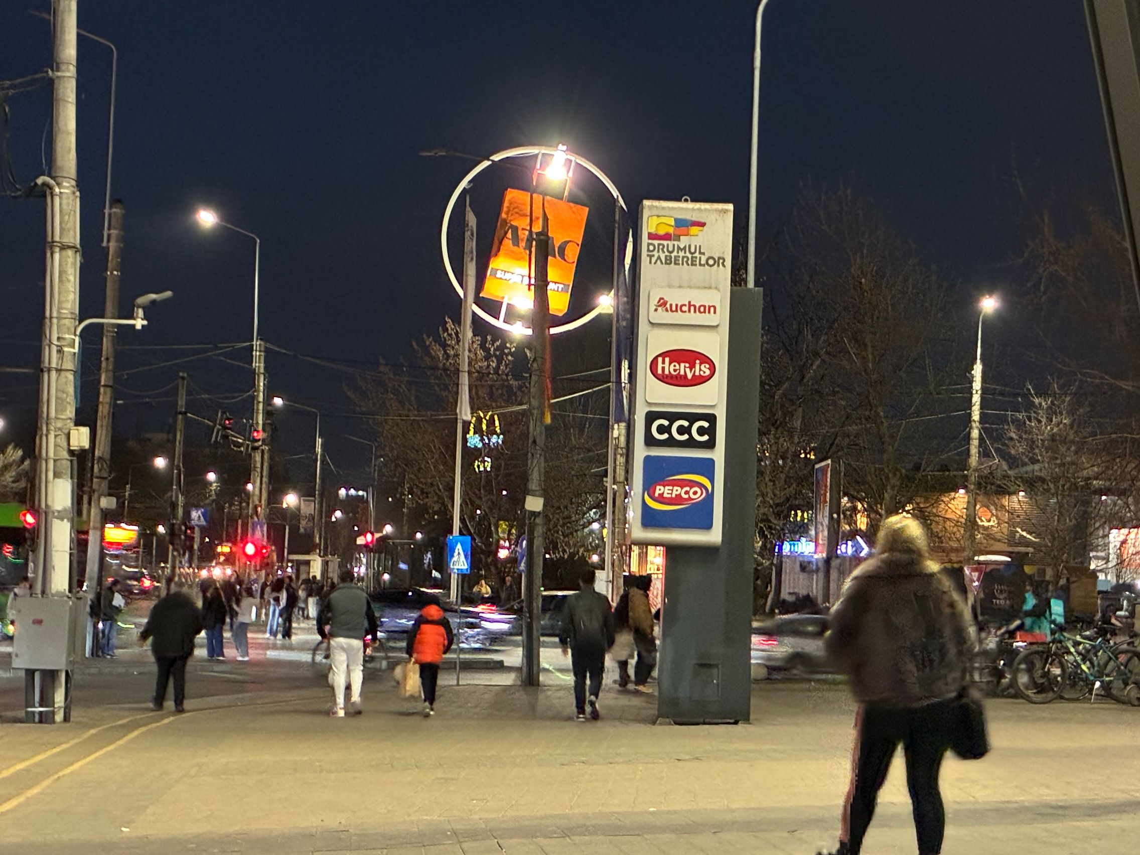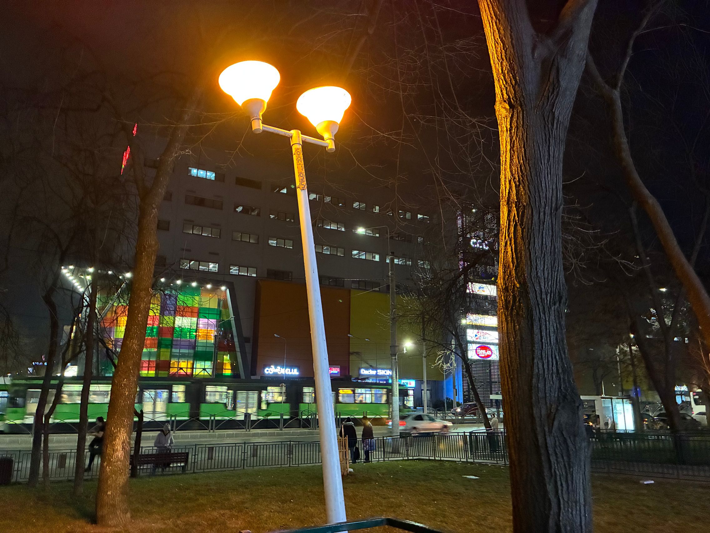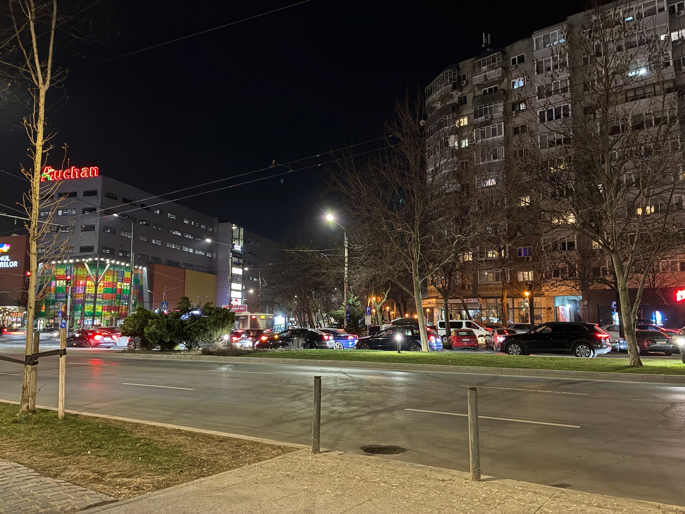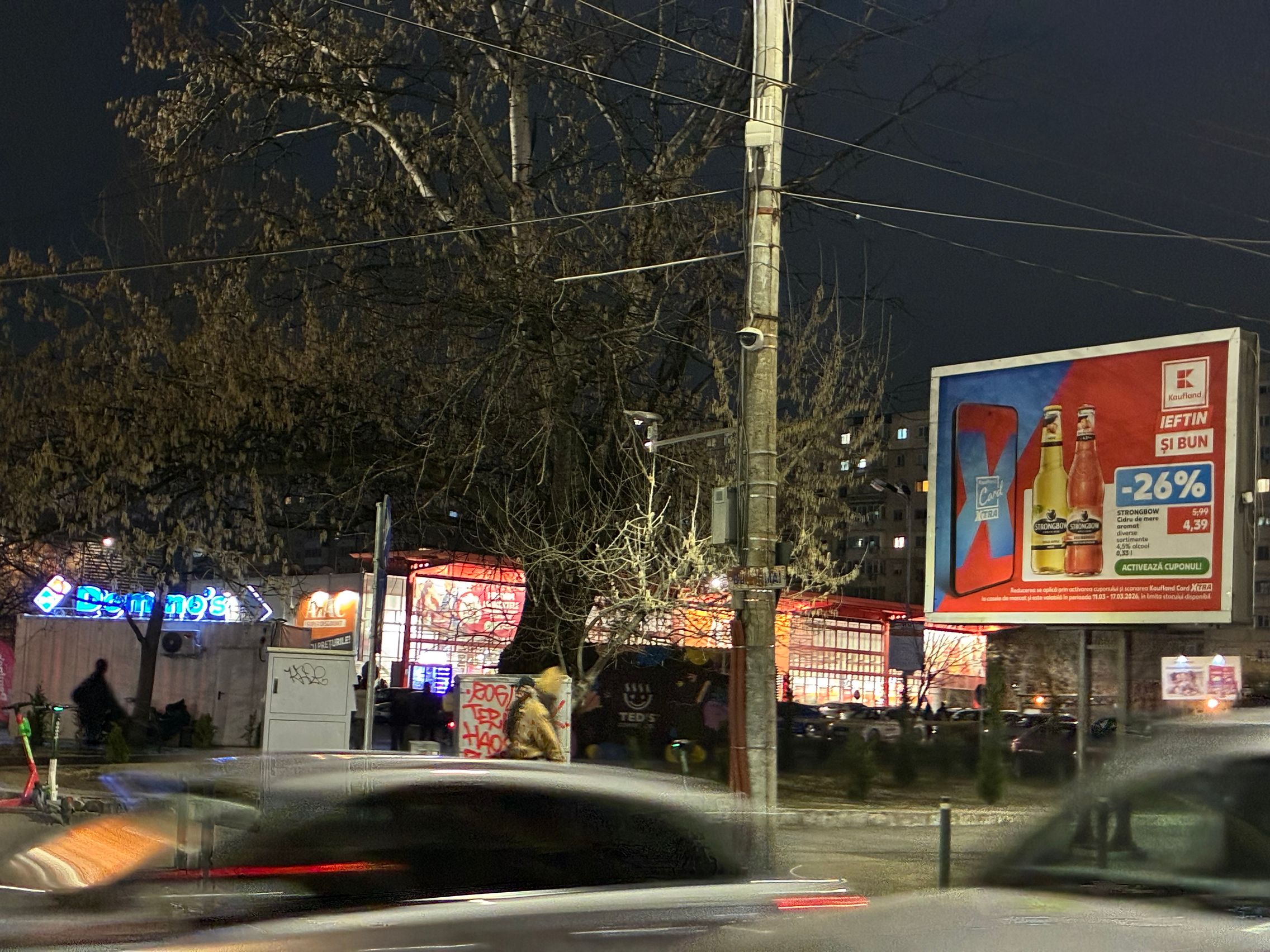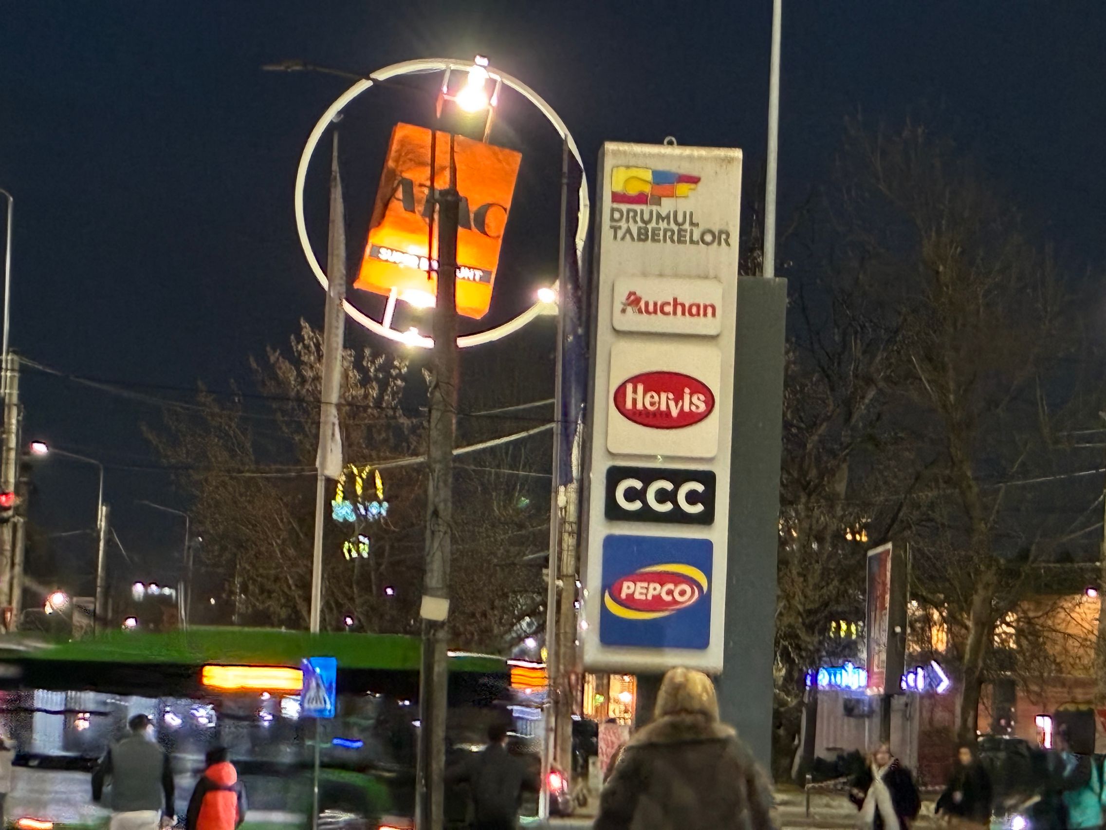 Fațada de sticlă de la Auchan multicoloră îmi place mult iar dacă tot vorbeam de zoom nocturn, parcă la cadrele pe magazinul Atac camera face o impresie mai bună decât la început. Posterele stradale arată savuros, la fel și tramvaiul cu mesaje motivaționale. Sunt bine reprezentate și siglele luminoase de la magazine, mai ales Ciorbe și Plăcinte cu acel roșu vibrant.