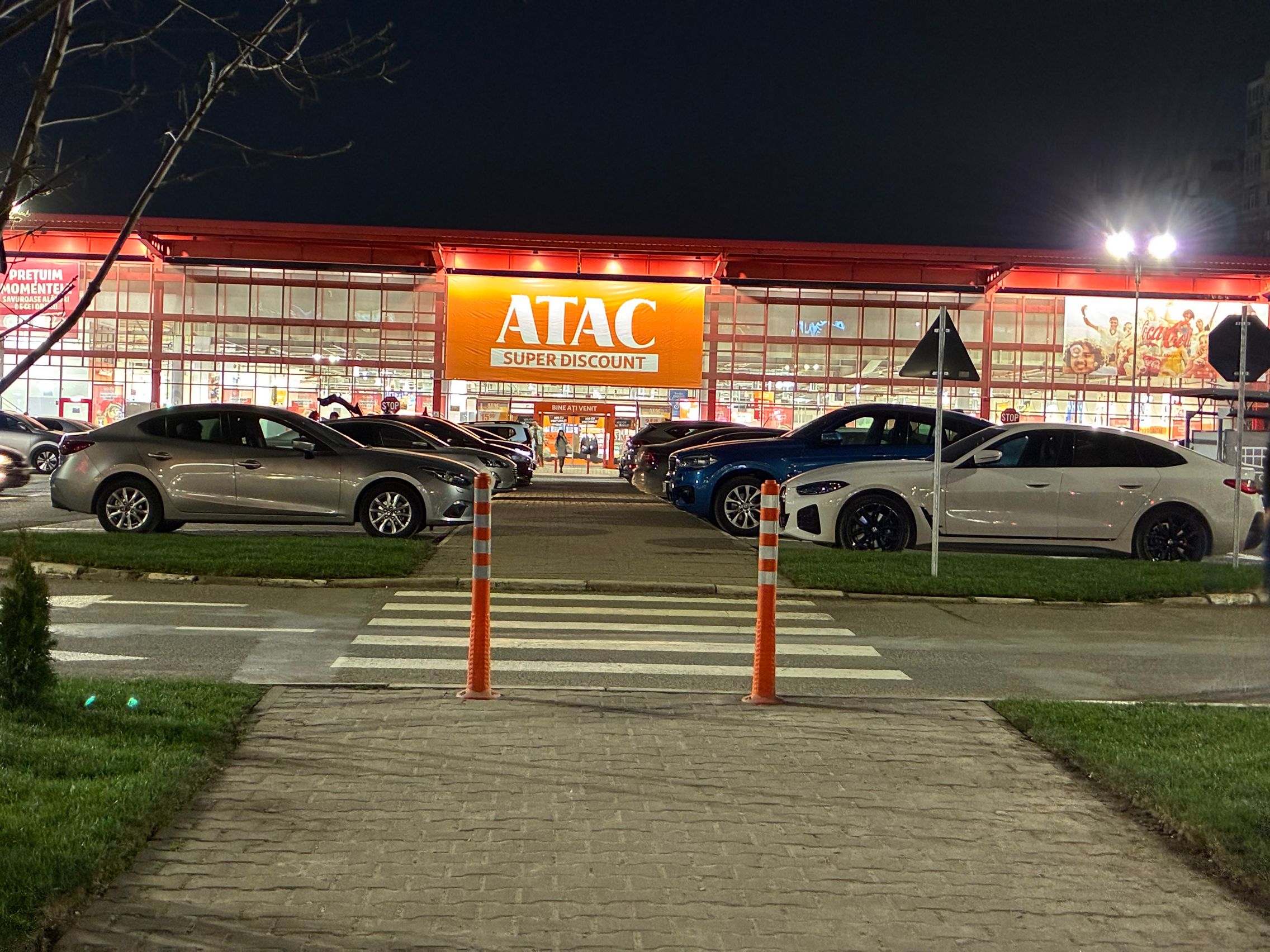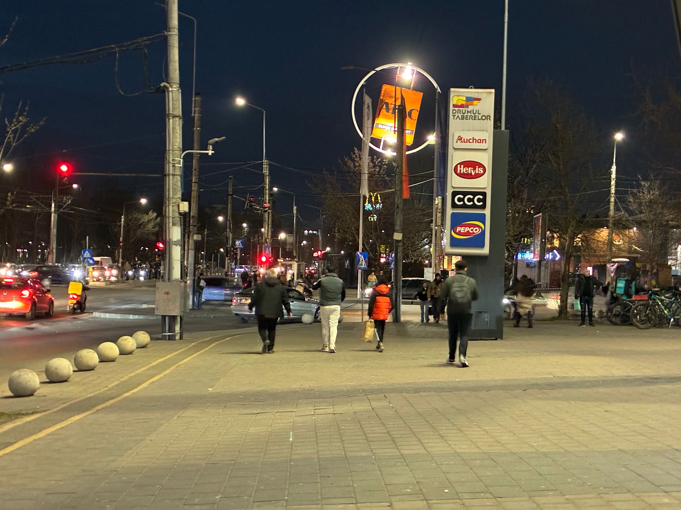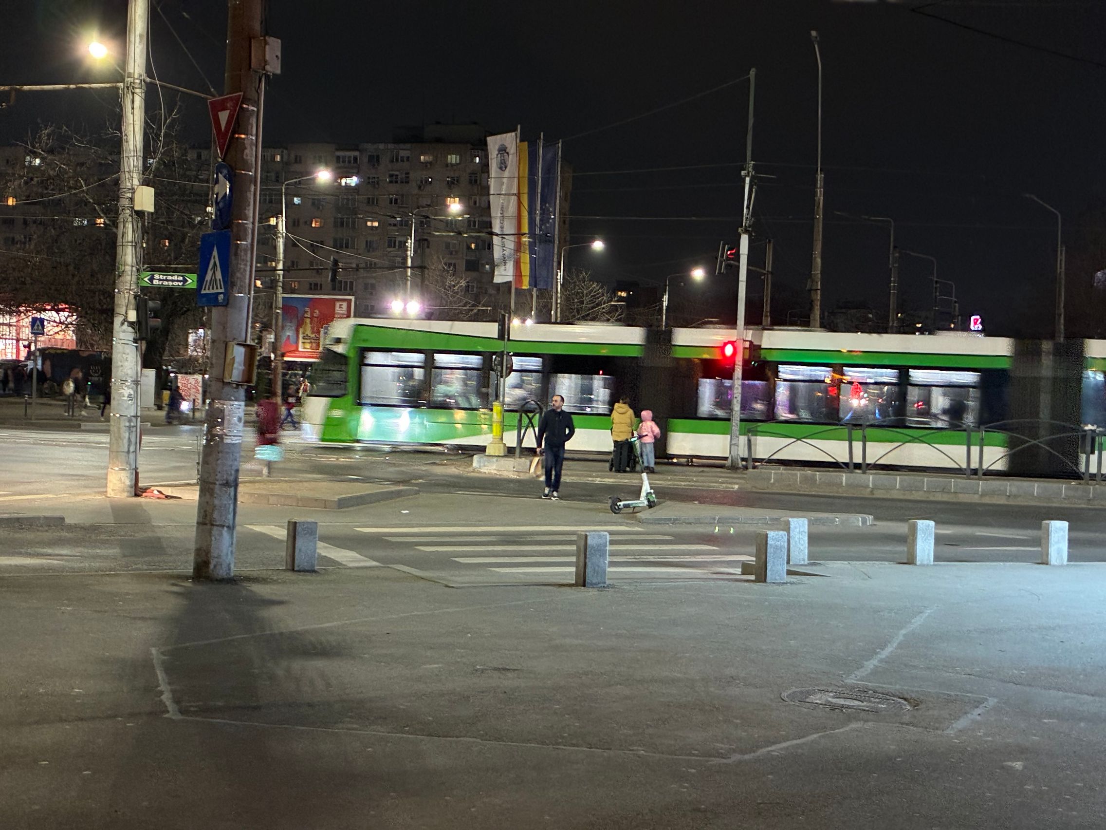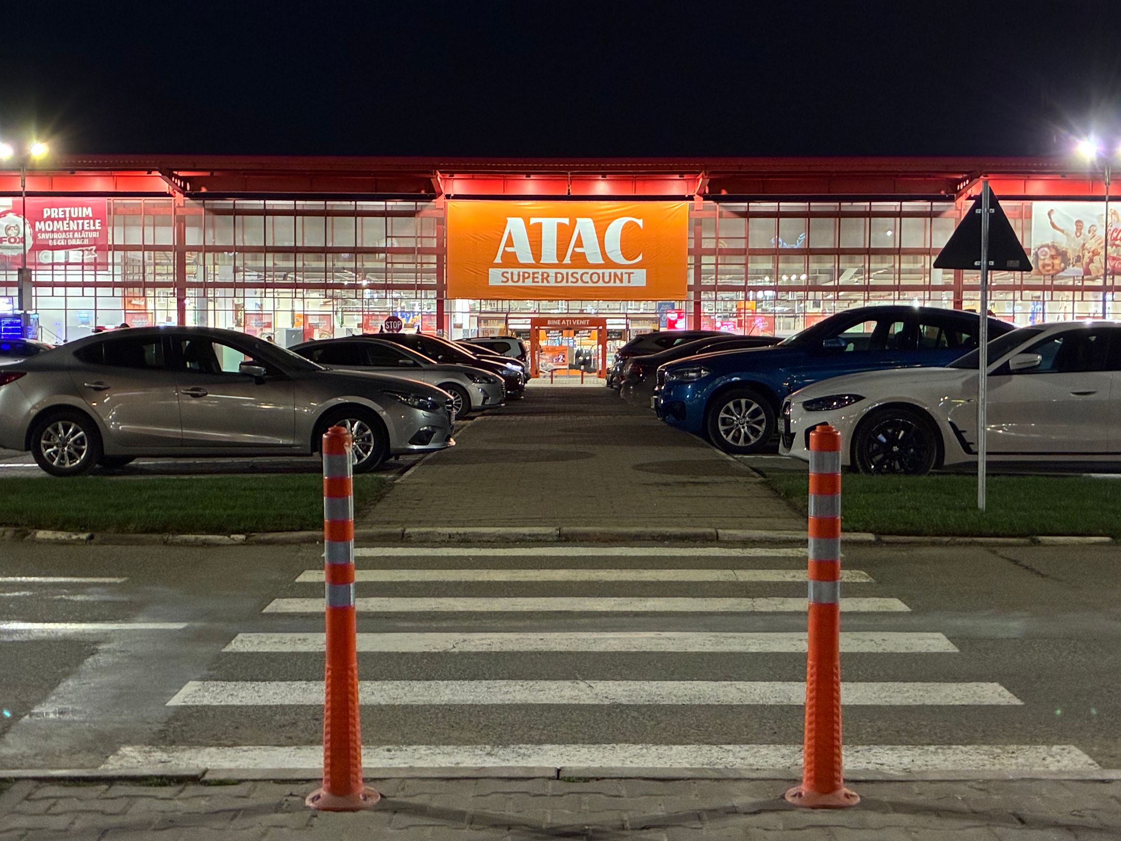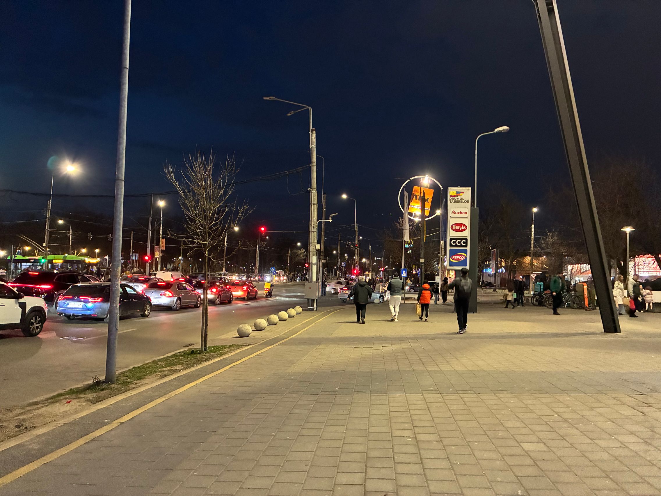 Fațada de sticlă de la Auchan multicoloră îmi place mult iar dacă tot vorbeam de zoom nocturn, parcă la cadrele pe magazinul Atac camera face o impresie mai bună decât la început. Posterele stradale arată savuros, la fel și tramvaiul cu mesaje motivaționale. Sunt bine reprezentate și siglele luminoase de la magazine, mai ales Ciorbe și Plăcinte cu acel roșu vibrant.