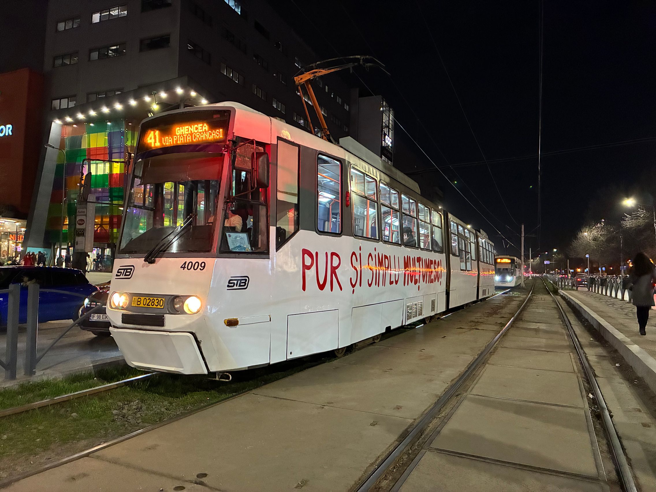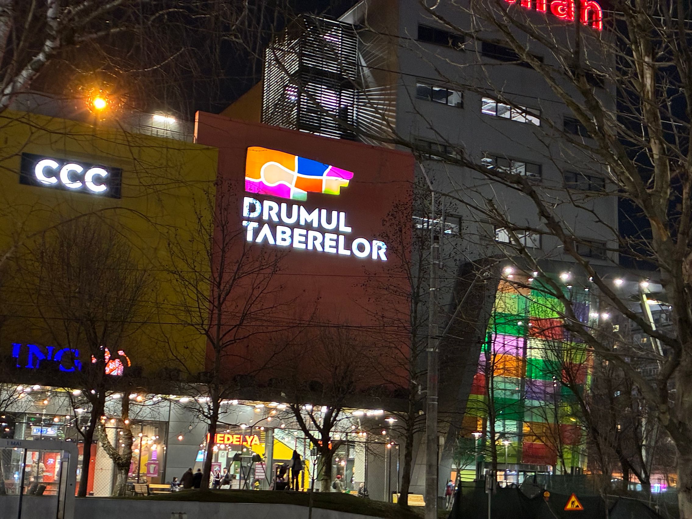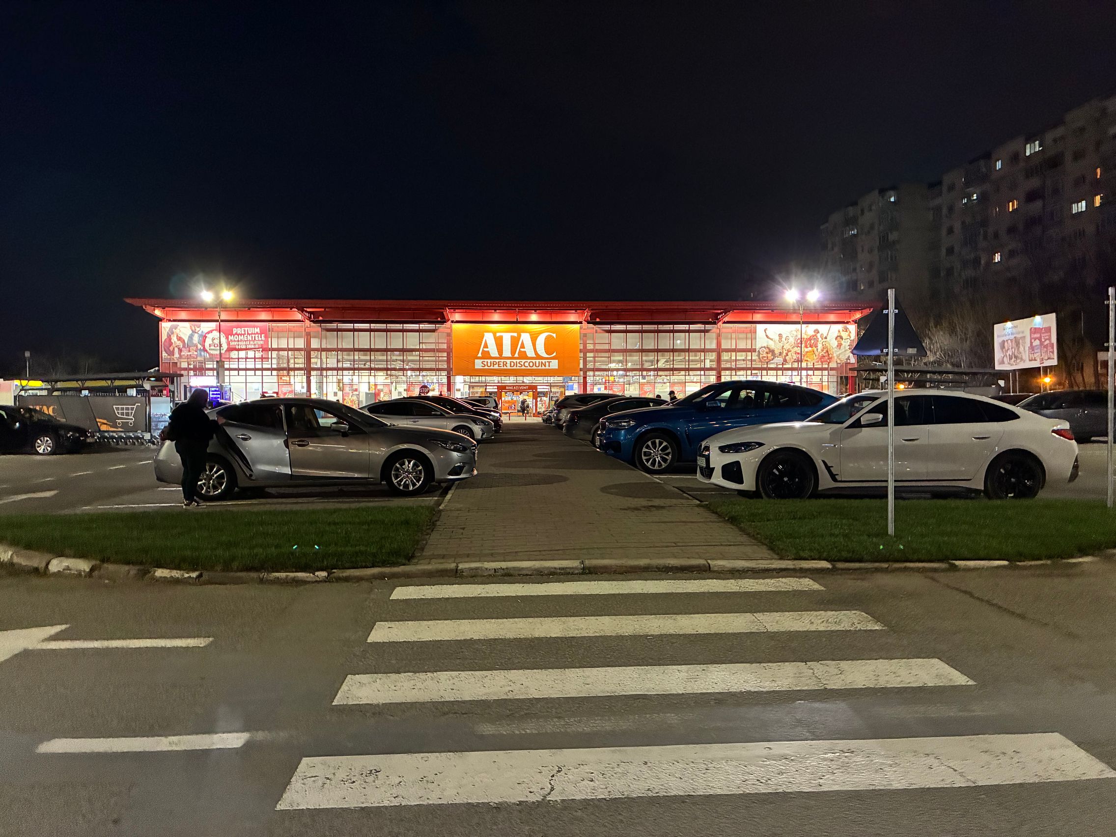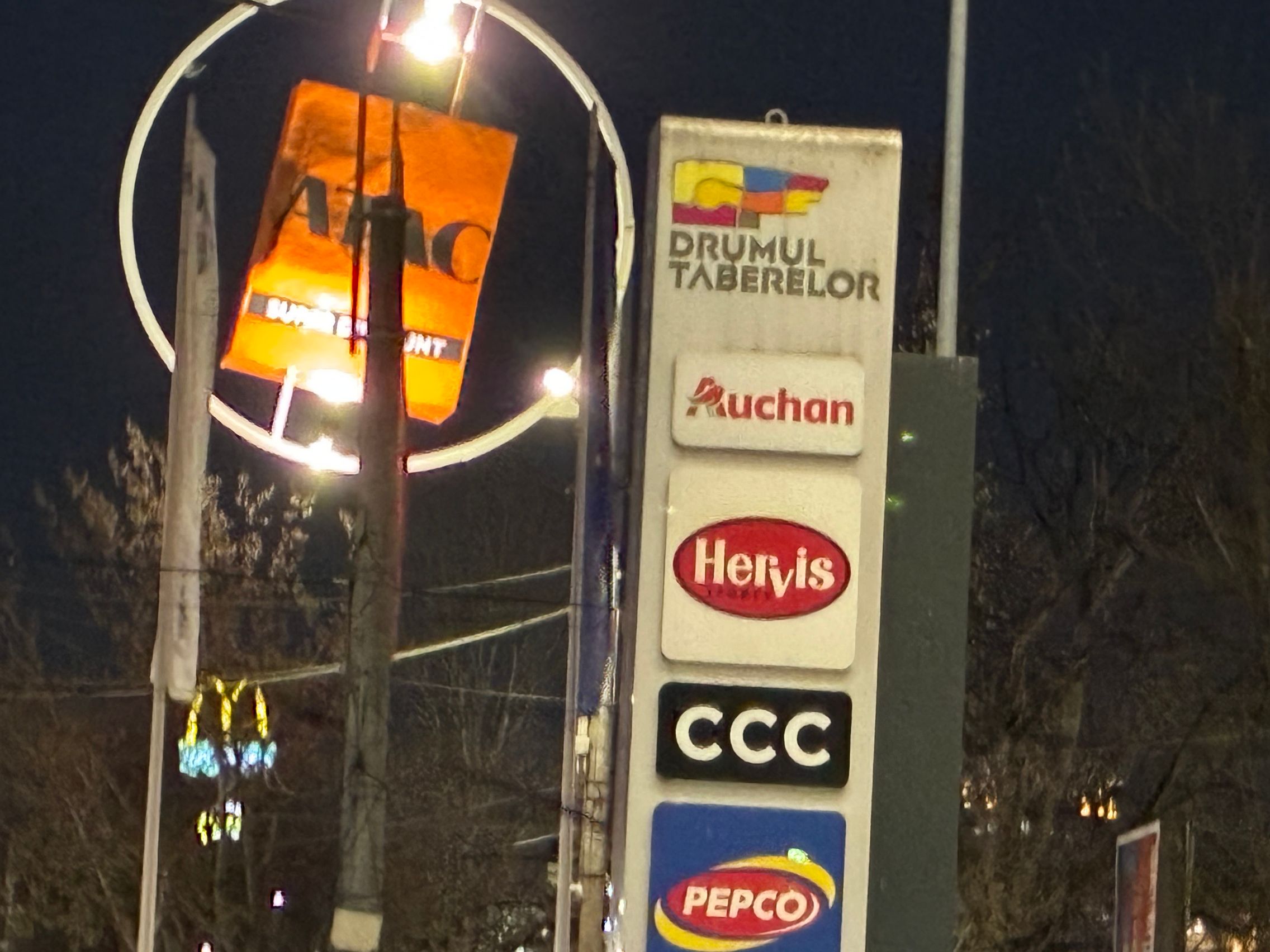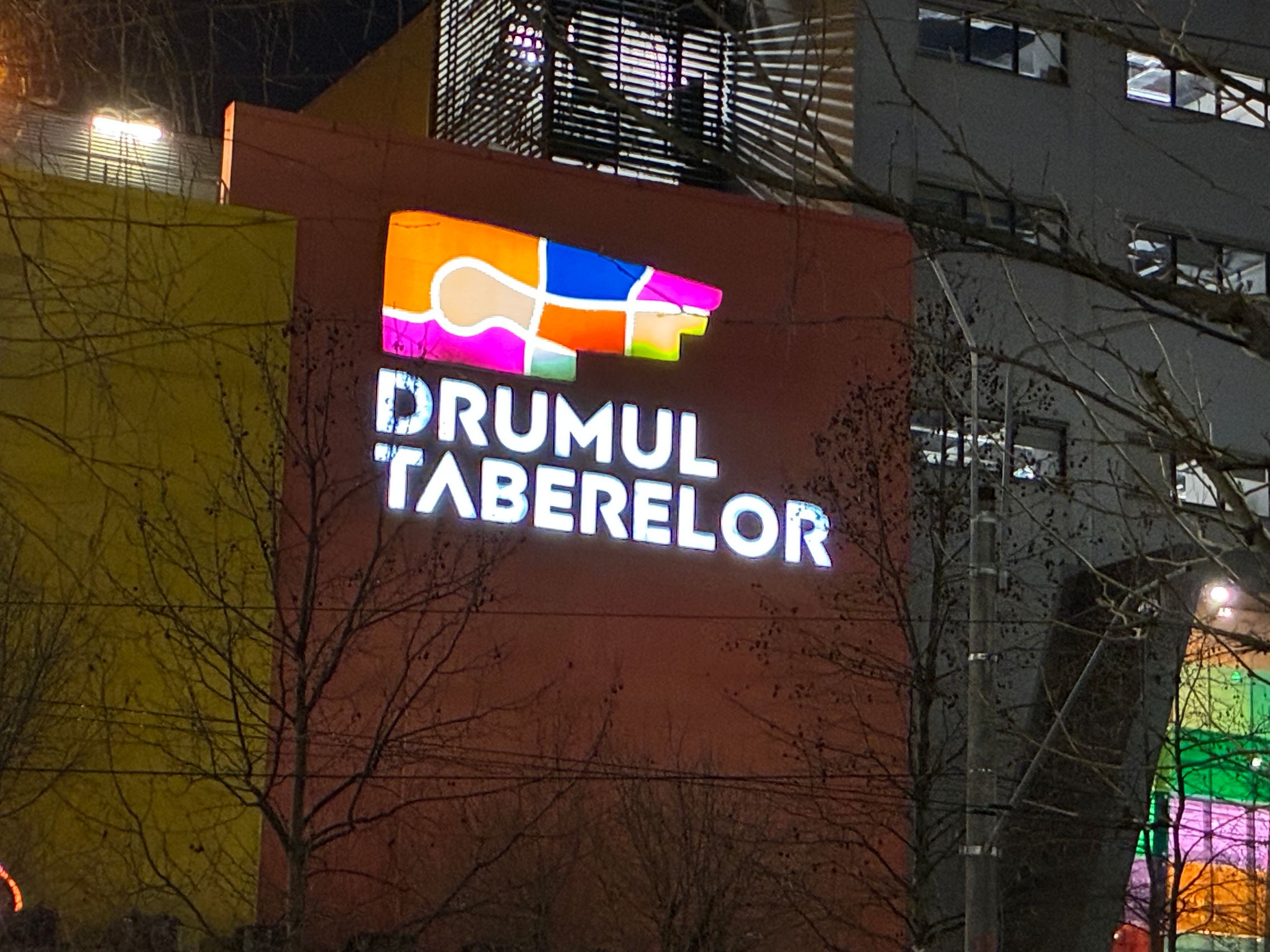 Fațada de sticlă de la Auchan multicoloră îmi place mult iar dacă tot vorbeam de zoom nocturn, parcă la cadrele pe magazinul Atac camera face o impresie mai bună decât la început. Posterele stradale arată savuros, la fel și tramvaiul cu mesaje motivaționale. Sunt bine reprezentate și siglele luminoase de la magazine, mai ales Ciorbe și Plăcinte cu acel roșu vibrant.