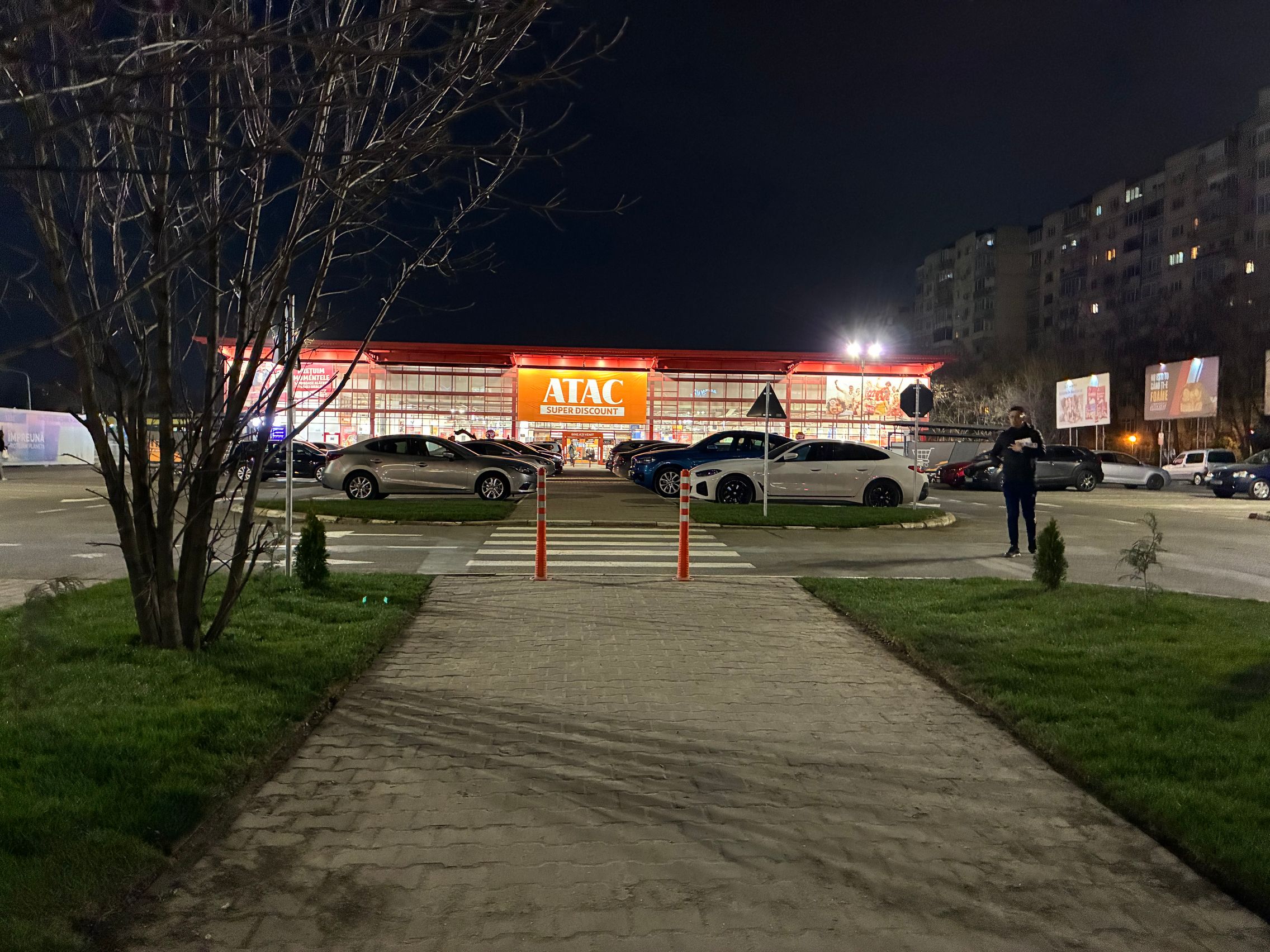 Pe timp de noapte apar clasicele reflexii a la iPhone, dar sunt mulțumit de cum se descurcă la panoramare. La plimbarea pe aleea destul de luminată, apar trepidații de mid-range, semn că aceasta cel puțin noaptea este o cameră mai degrabă de utilizat de pe loc. Tremurici sunt și la testul selfie. Zoom-ul pe magazinul Atac nu e rău, dar nu te uiți inițial la halourile care au prins raze mari.