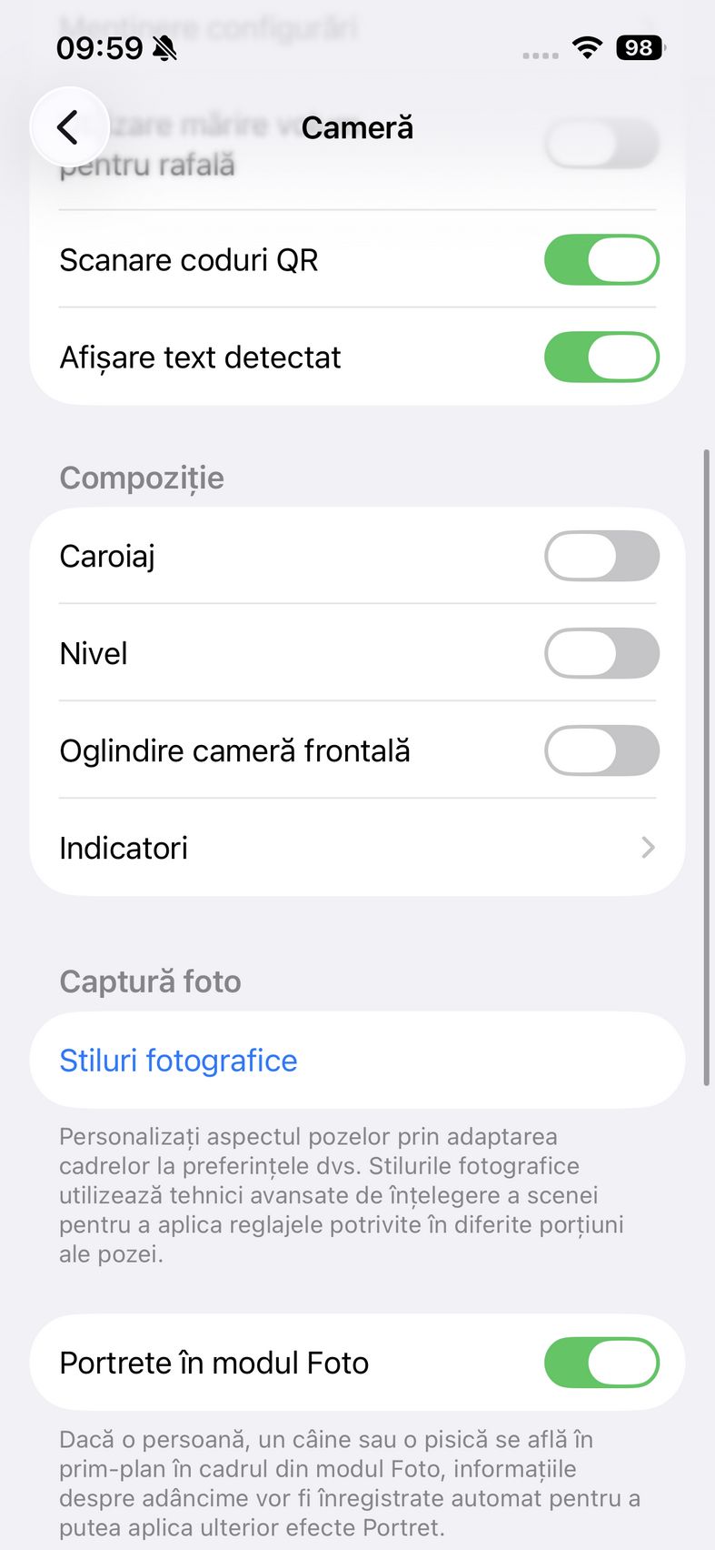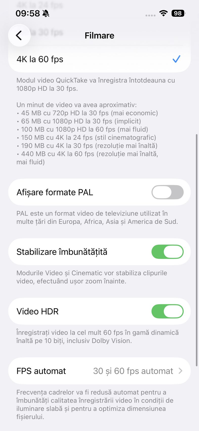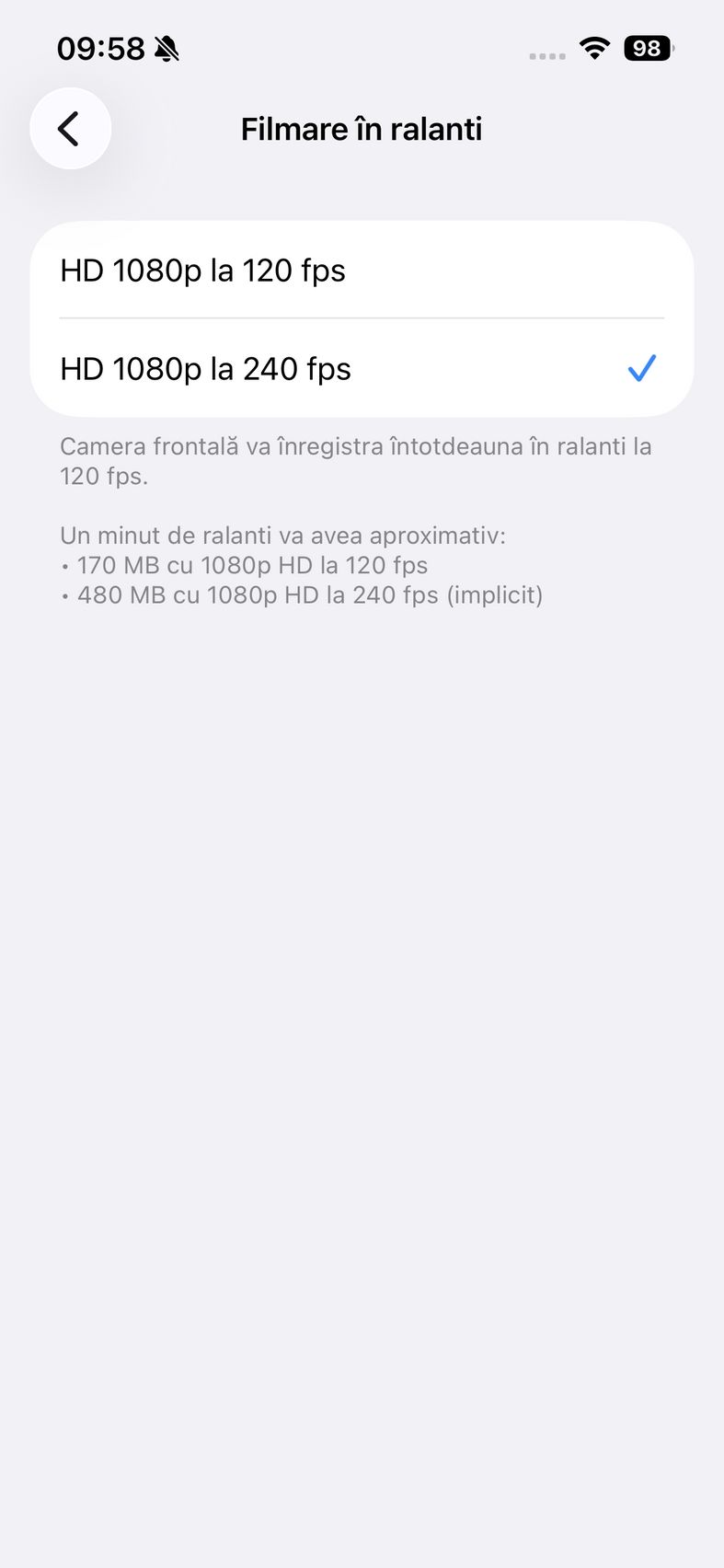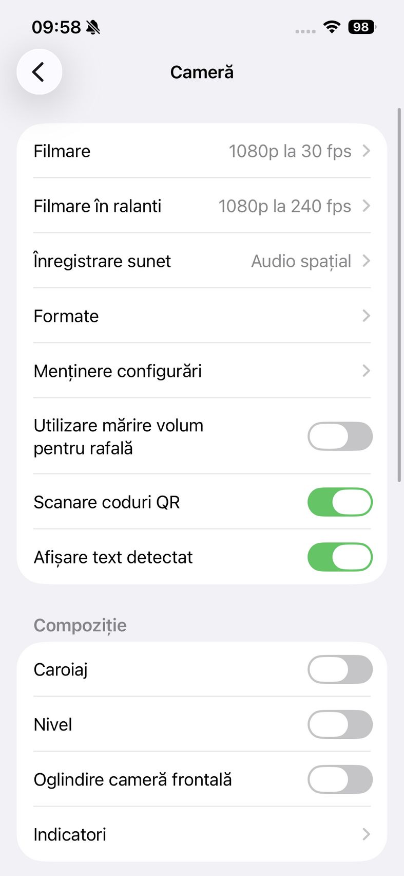 Pentru selfie-uri ne bazăm pe o cameră de 12 mpx, senzor de 1/3.6", 23mm focala, deschidere f/1.9 și PDAF. Nu se face trecerea către senzorul pătrat de pe restul familiei iPhone 17, dar e bine și așa. Și această cameră filmează 4K 60. După cum suntem obișnuiți în iOS, grosul setărilor nu sunt în aplicația cameră, ci în Setări.