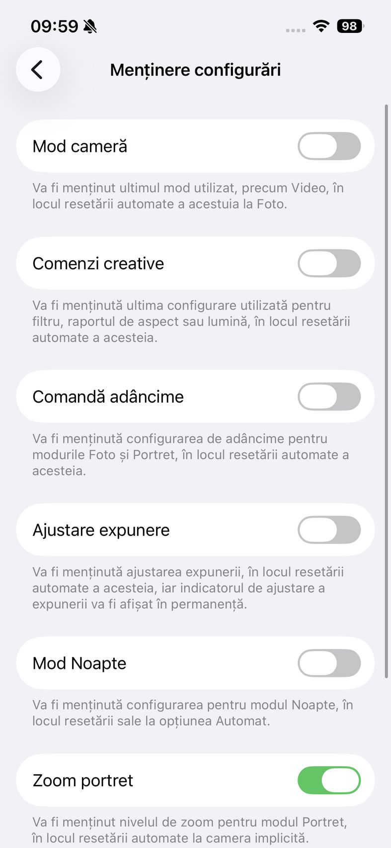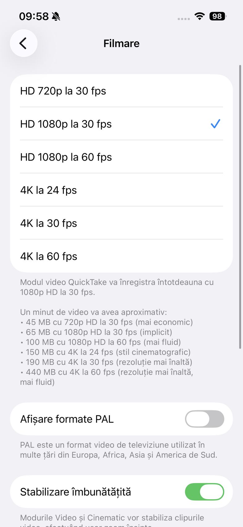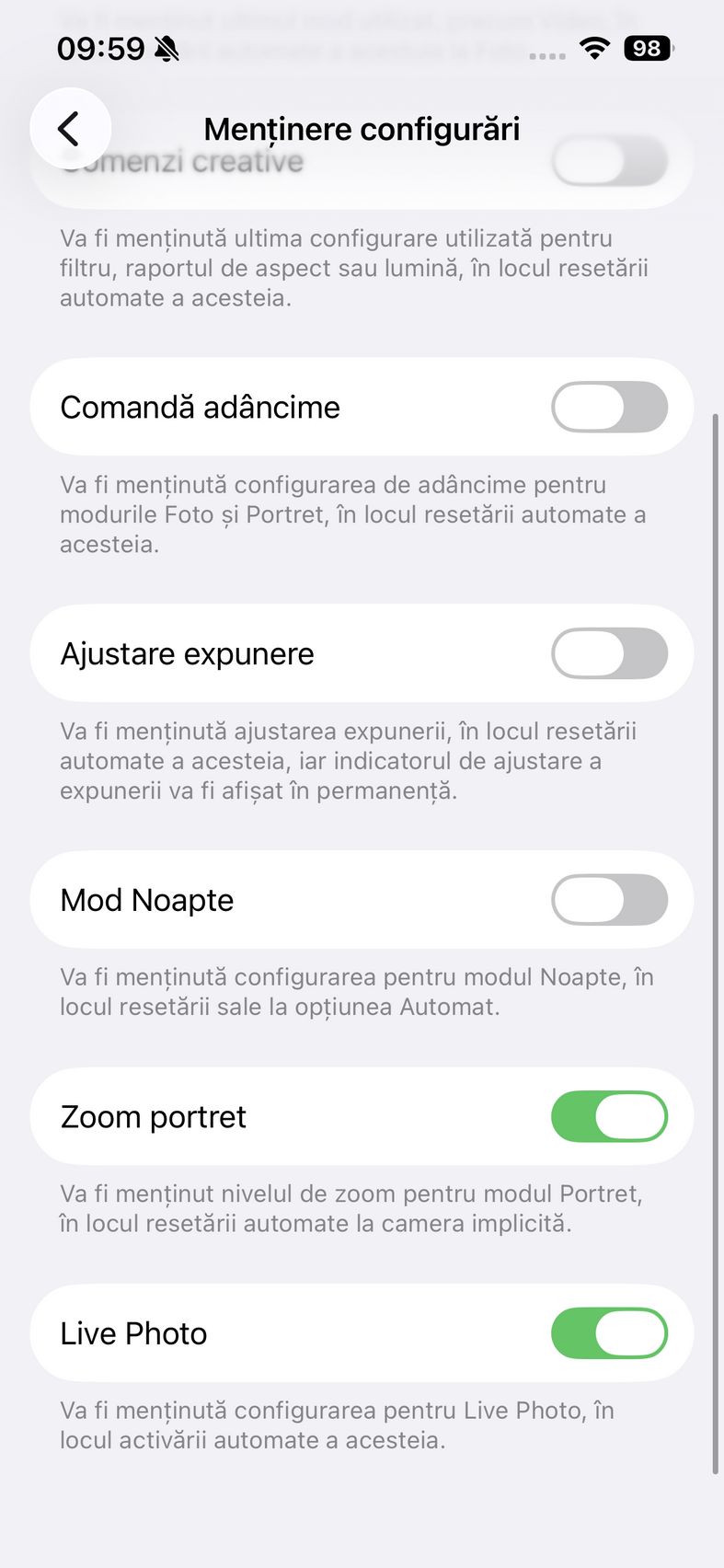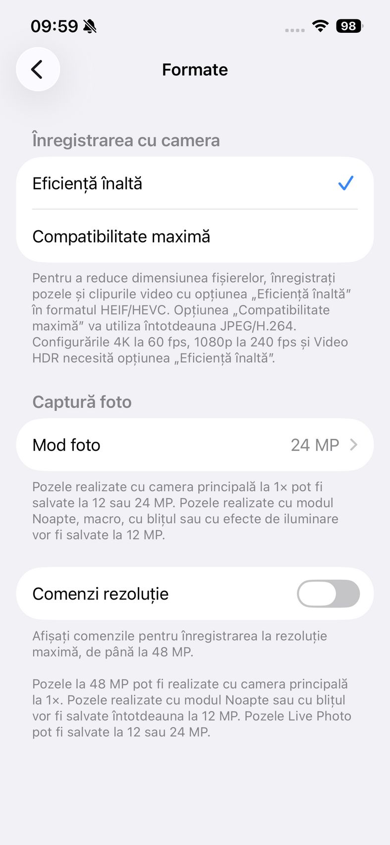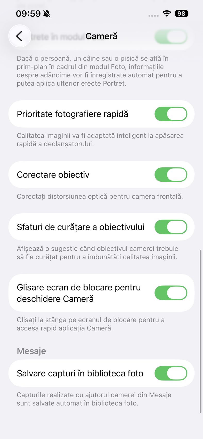 Pentru selfie-uri ne bazăm pe o cameră de 12 mpx, senzor de 1/3.6", 23mm focala, deschidere f/1.9 și PDAF. Nu se face trecerea către senzorul pătrat de pe restul familiei iPhone 17, dar e bine și așa. Și această cameră filmează 4K 60. După cum suntem obișnuiți în iOS, grosul setărilor nu sunt în aplicația cameră, ci în Setări.