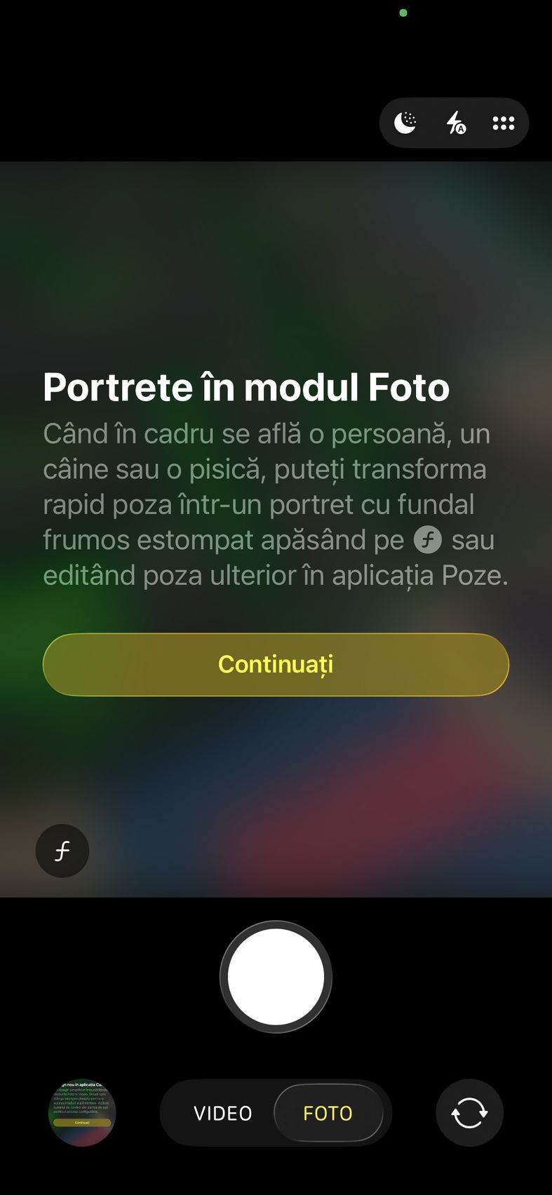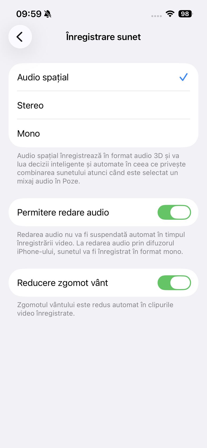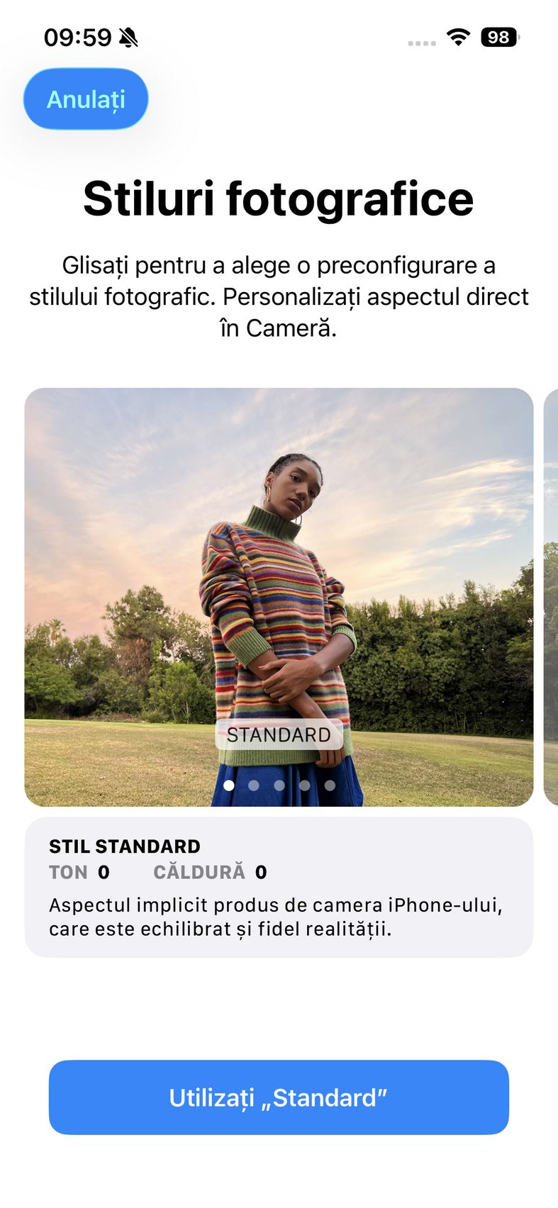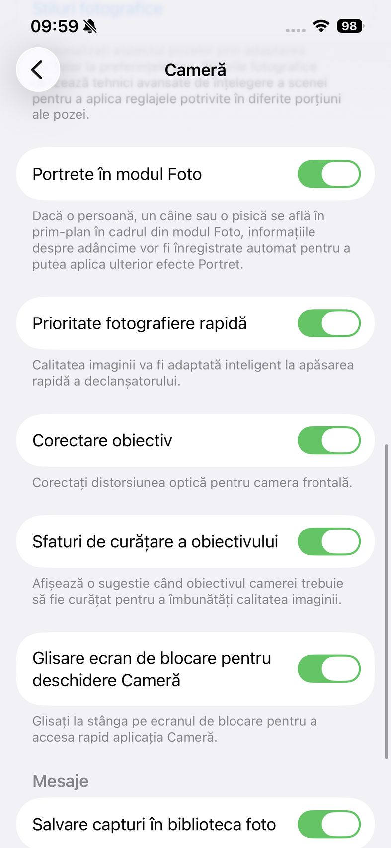 Pentru selfie-uri ne bazăm pe o cameră de 12 mpx, senzor de 1/3.6", 23mm focala, deschidere f/1.9 și PDAF. Nu se face trecerea către senzorul pătrat de pe restul familiei iPhone 17, dar e bine și așa. Și această cameră filmează 4K 60. După cum suntem obișnuiți în iOS, grosul setărilor nu sunt în aplicația cameră, ci în Setări.