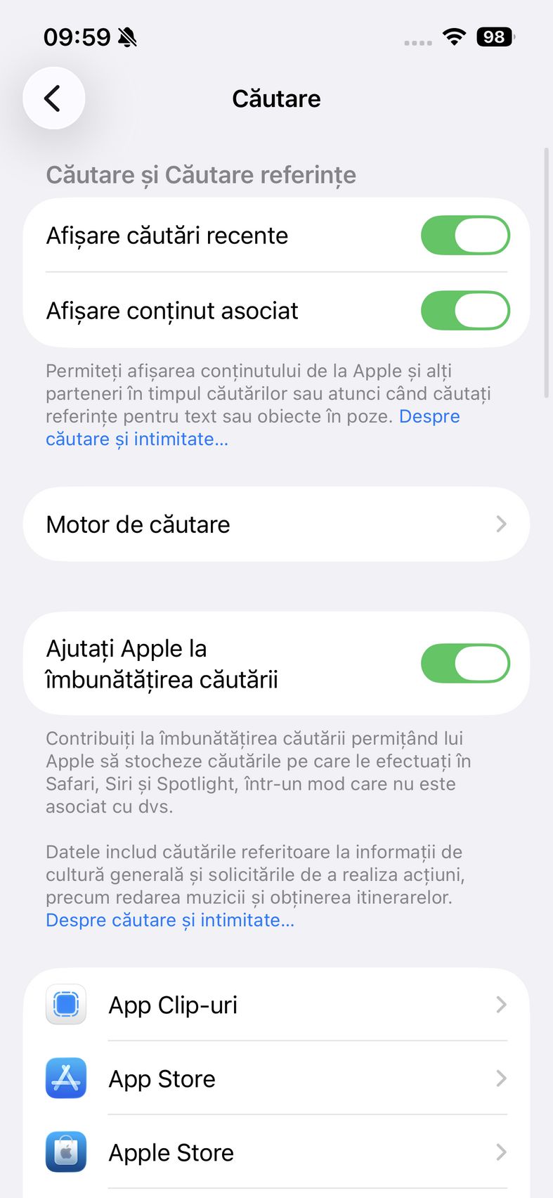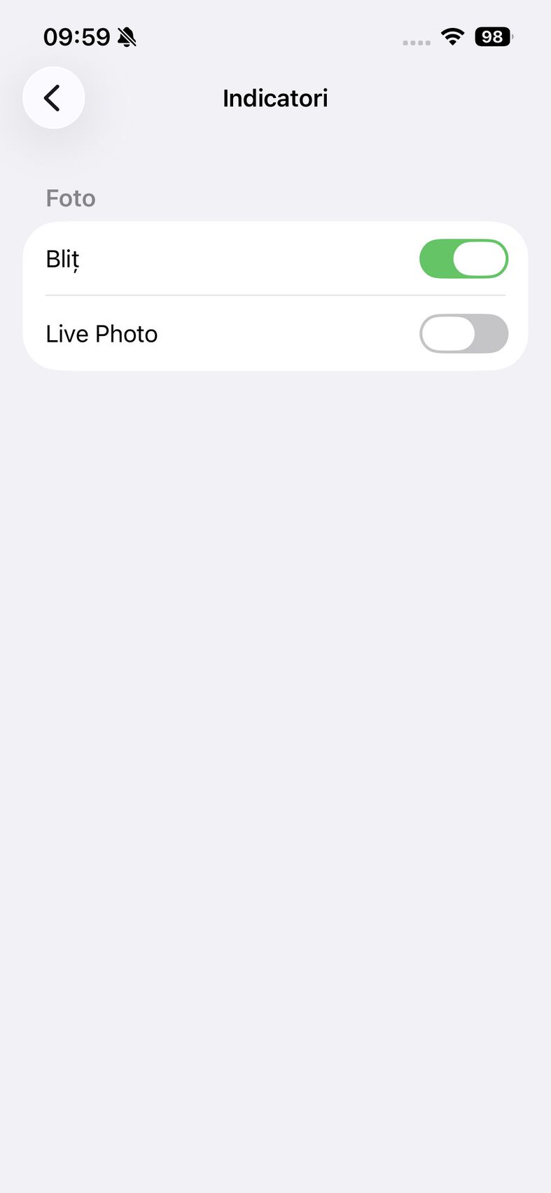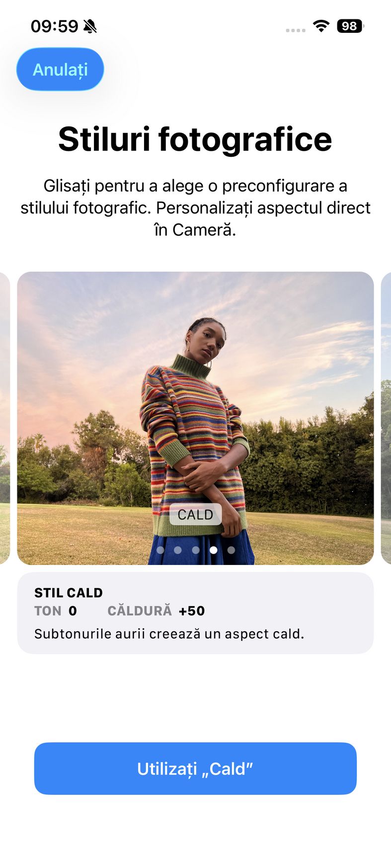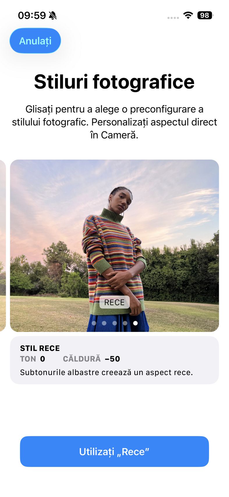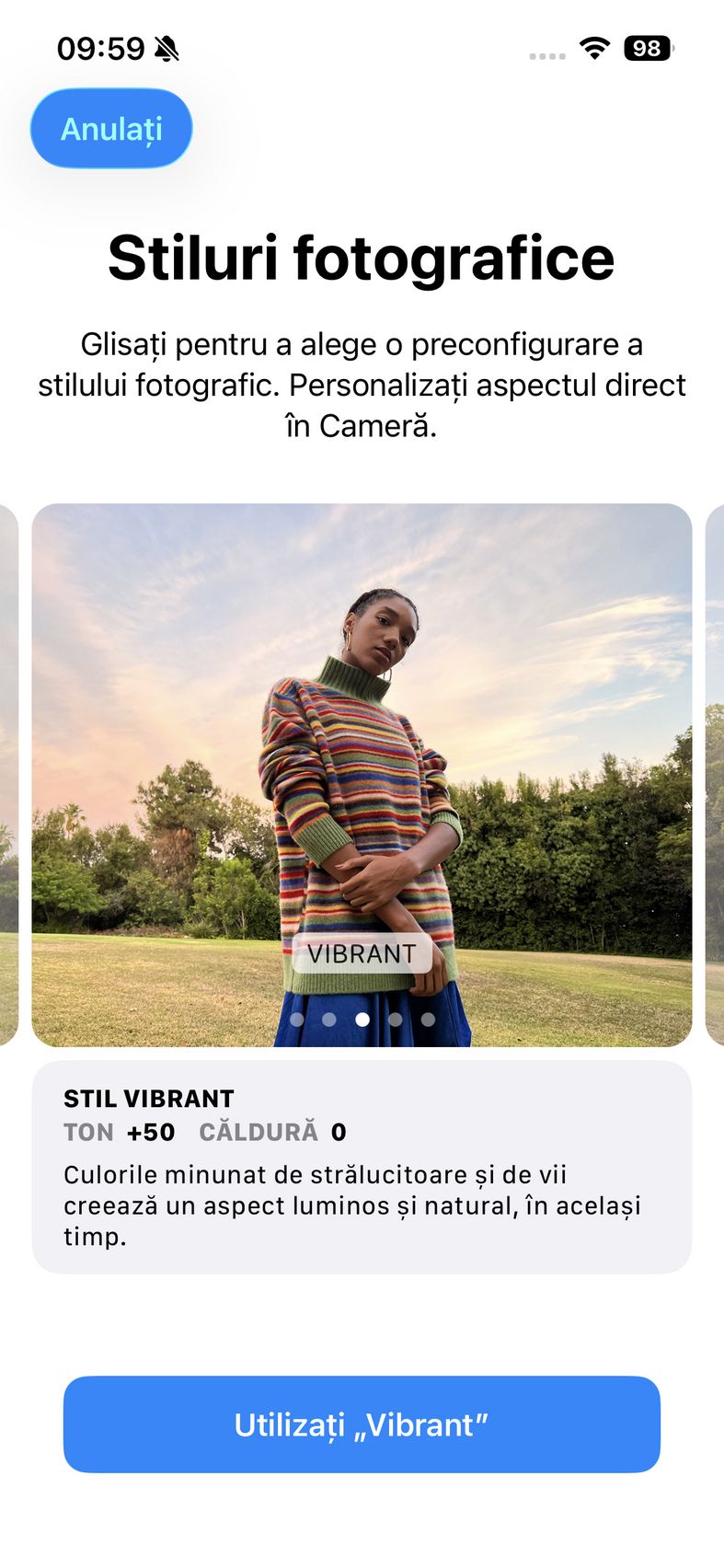 Pentru selfie-uri ne bazăm pe o cameră de 12 mpx, senzor de 1/3.6", 23mm focala, deschidere f/1.9 și PDAF. Nu se face trecerea către senzorul pătrat de pe restul familiei iPhone 17, dar e bine și așa. Și această cameră filmează 4K 60. După cum suntem obișnuiți în iOS, grosul setărilor nu sunt în aplicația cameră, ci în Setări.
