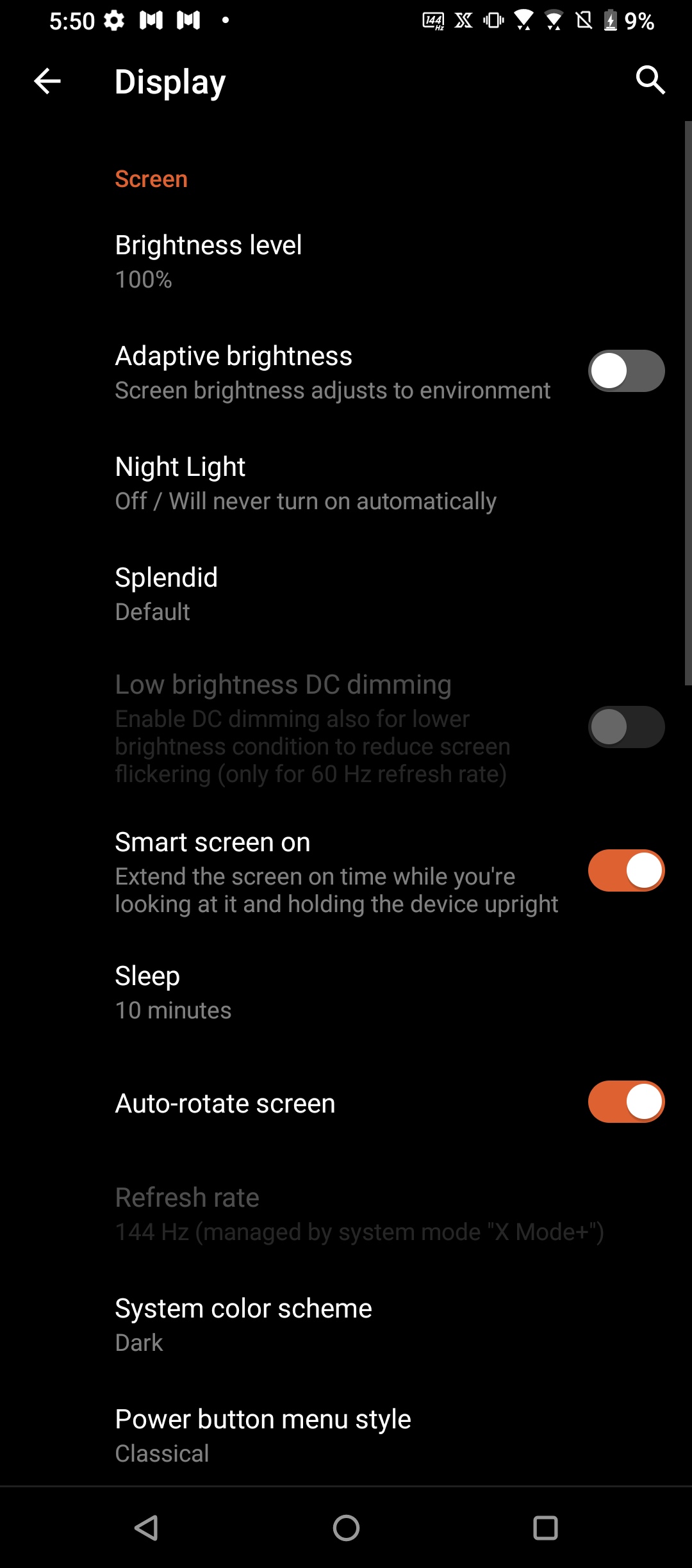 - X-Mode - prioritizează gaming-ul, luminozitatea ecranului crește, sensibilitatea ecranului crește și refresh rate-ul rămâne la 144Hz