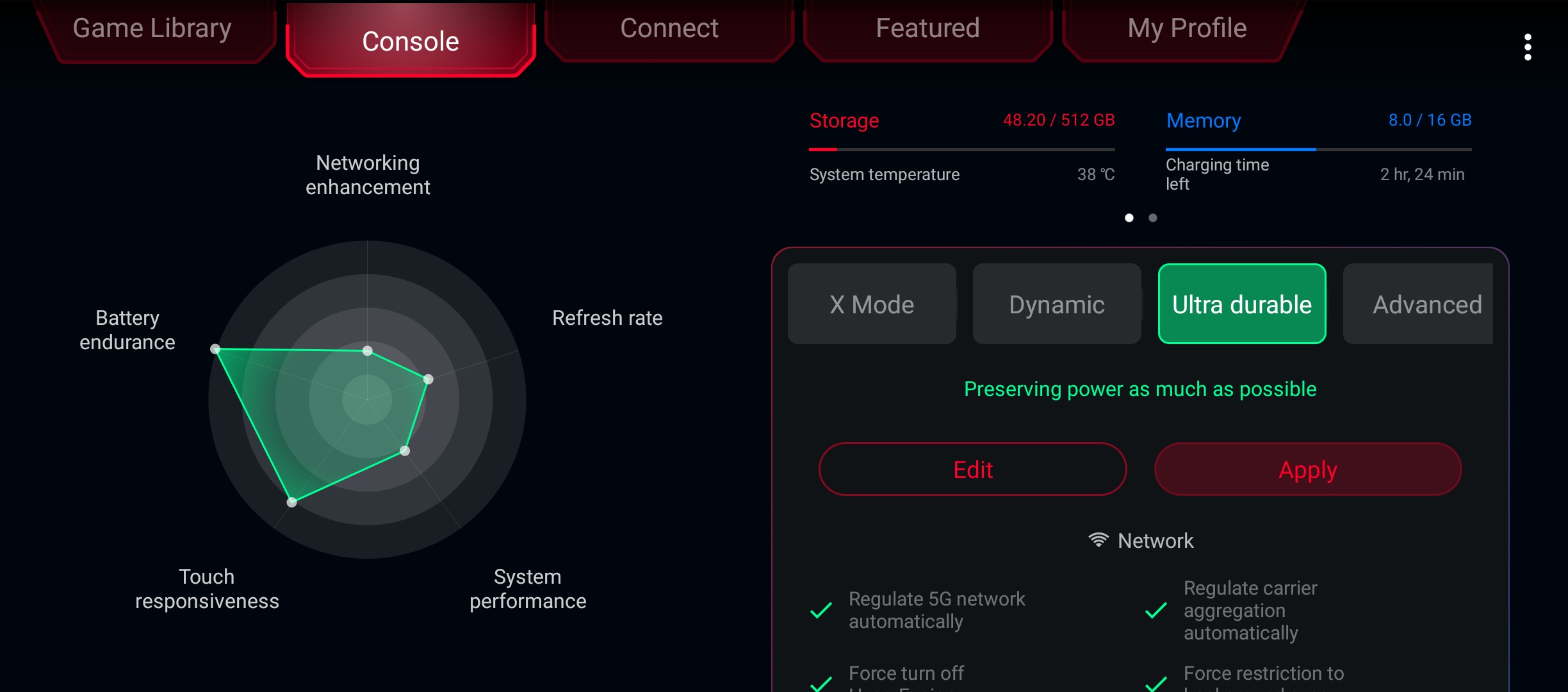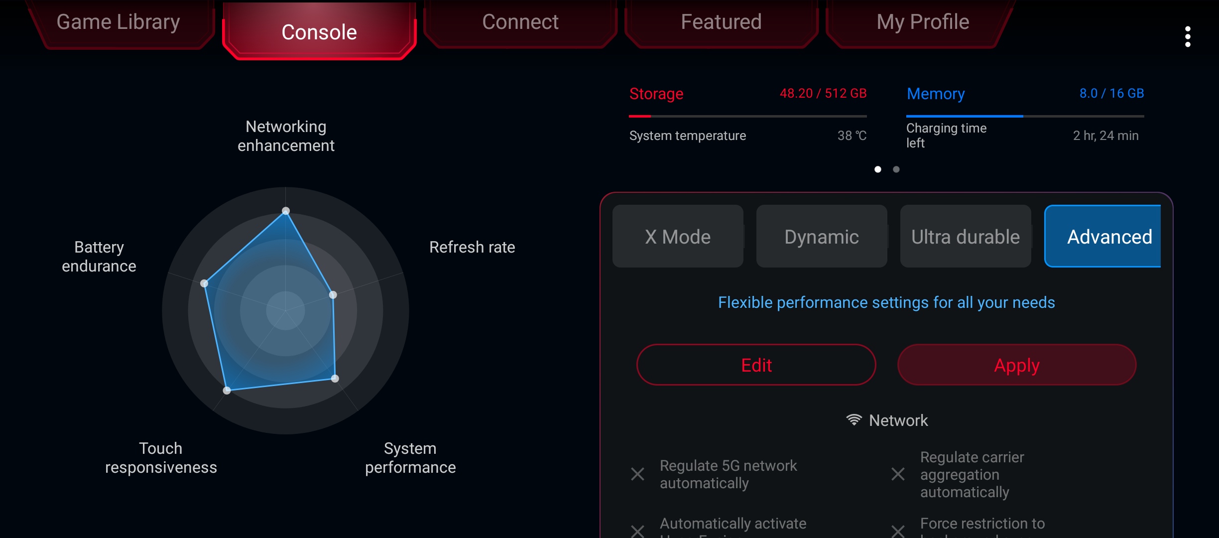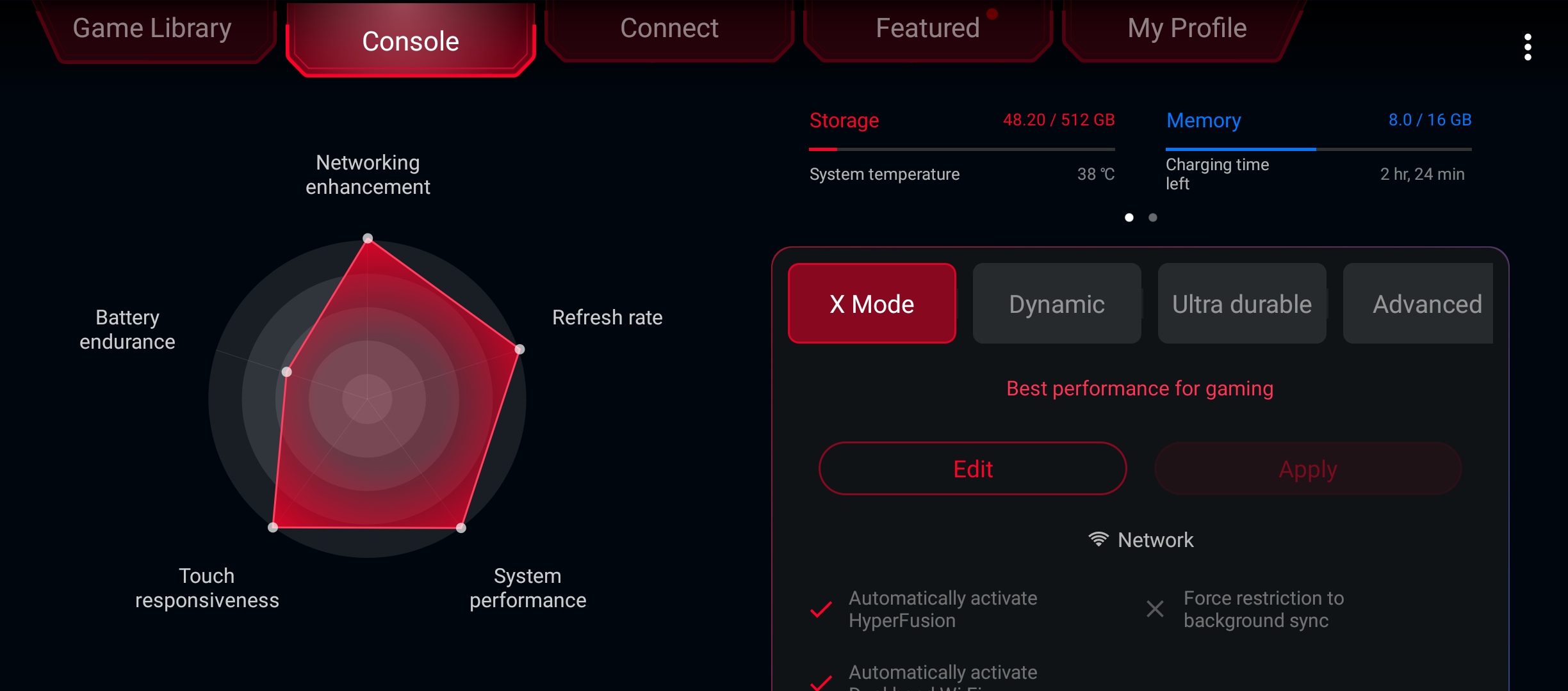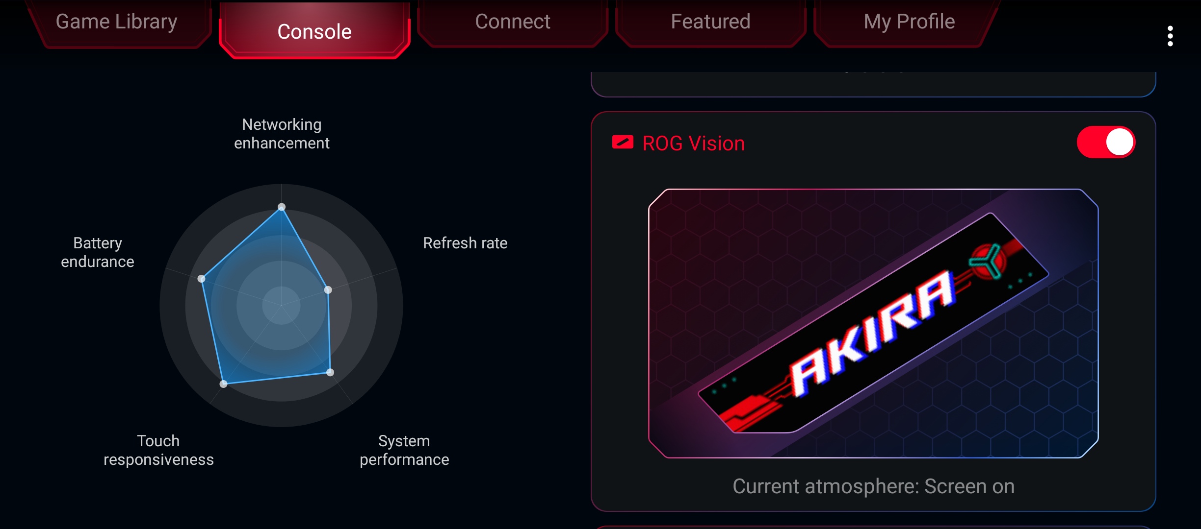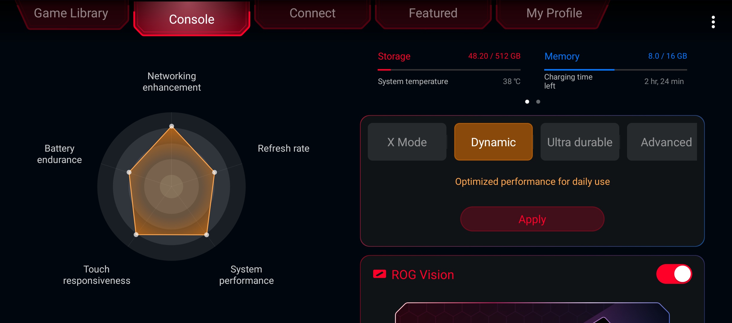 X-Mode poate fi activat prin butonul fizic aflat în lateral, în partea stângă, iar fiecare mod poate fi complet personalizat din setări. Iese în evidență și ASUS Armoury, o aplicație deja populară pentru seria ROG. Este de această dată mai bine organizat și include o zonă de comunitate și știri, dar și o Consolă cu reglaje pentru ventilator, frecvență și ecranul secundar de pe spate. Că tot veni vorba despre acesta, aflați că puteți afișa diverse animații, logo-ul ROG, dar și alte informații utile precum nivelul bateriei la încărcare sau notificări în momentul în care le primești.