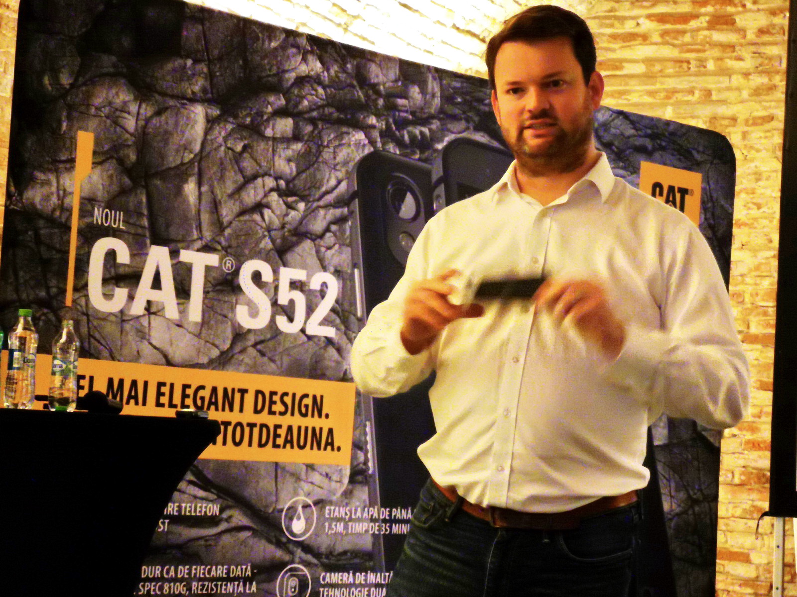 La evenimentul organizat ieri ne-a vorbit Tim Shepherd, Senior Director Product Marketing CAT, de la care am aflat că atât el, CAT şi alţi angajaţi au folosit CAT S52 timp de 6 săptămâni. În această perioadă au constatat o autonomie a bateriei de 1.5, până la 2 zile fără probleme. Am aflat şi că rezistenţa a început să conteze mult pentru cumpărătorii de telefoane, mai ales că 1 din 3 consumatori europeni şi-au stricat telefonul în ultimii 3 ani.