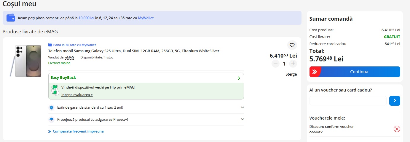 UPDATE 22/02/2025: Pe data de 8 februarie vă informarm prin intermediul articolului de față despre oferta specială asociată lui Samsung Galaxy S25 Ultra care de la 7199 lei preț de lansare pica la 6299 lei. Se poate și mai bine de atât, astăzi 22 februarie, când putem cumpăra telefonul la 6410 lei de la eMAG, iar odată cu aplicarea codului "electro" avem 10% extra reducere și ajungem la 5769 lei.