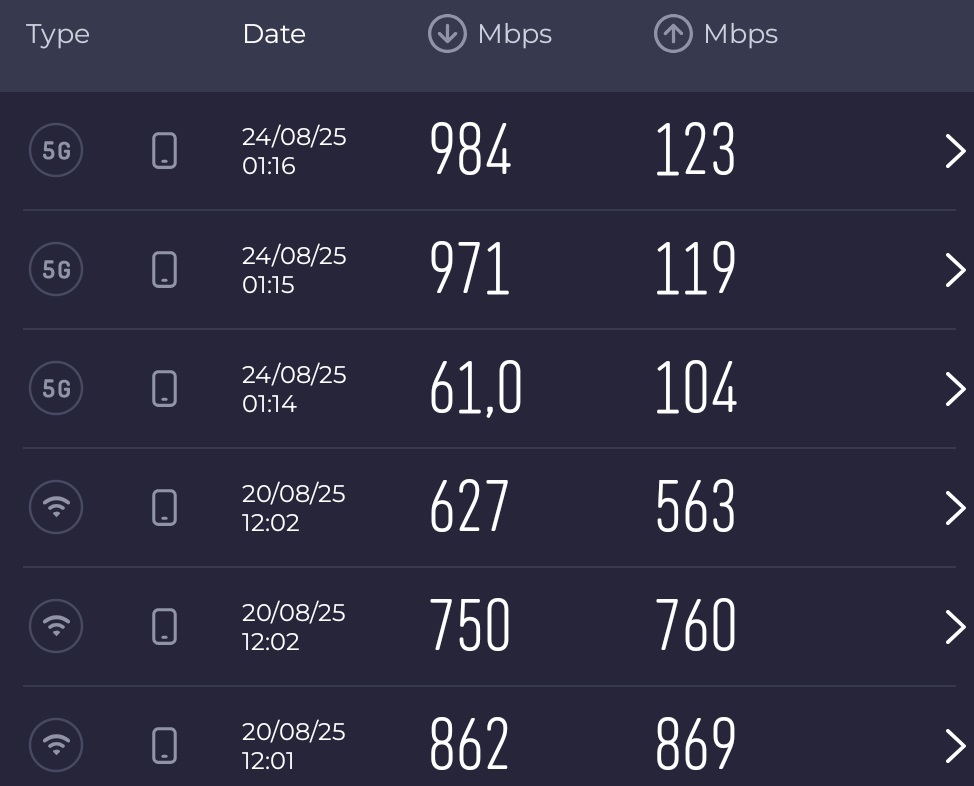 În fine, avem parte şi de suport Wi-Fi 7 tri band, GPS dual band, Glonass, Galileo, BDS, QZSS şi NavIC. Plus NFC, evident, dar şi port USB-C 3.2 jos. Fără infraroşu, dar cu suport UWB pentru smart tag-uri. Sunt şi servicii de conexiune la satelit, dar nu la noi deocamdată. Apelurile s-au auzit tare şi clar, iar SpeedTest ne-a adus în buza scorului de 1 Gbps la 5G.