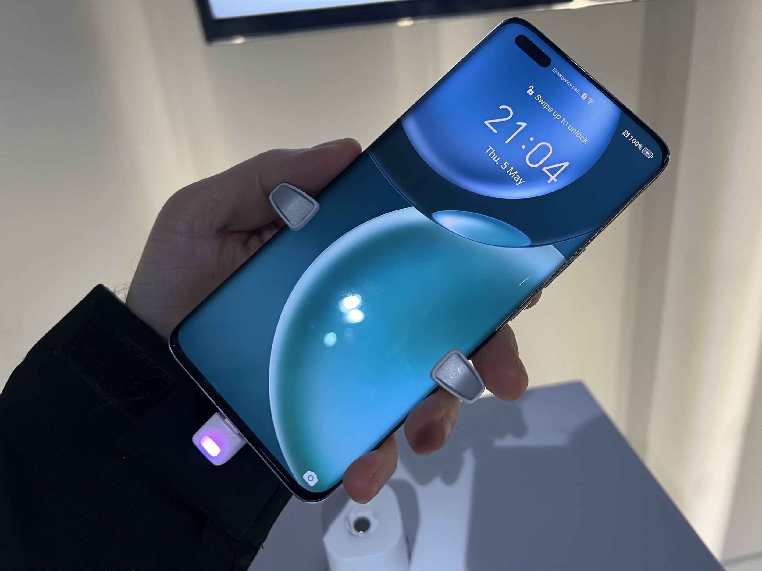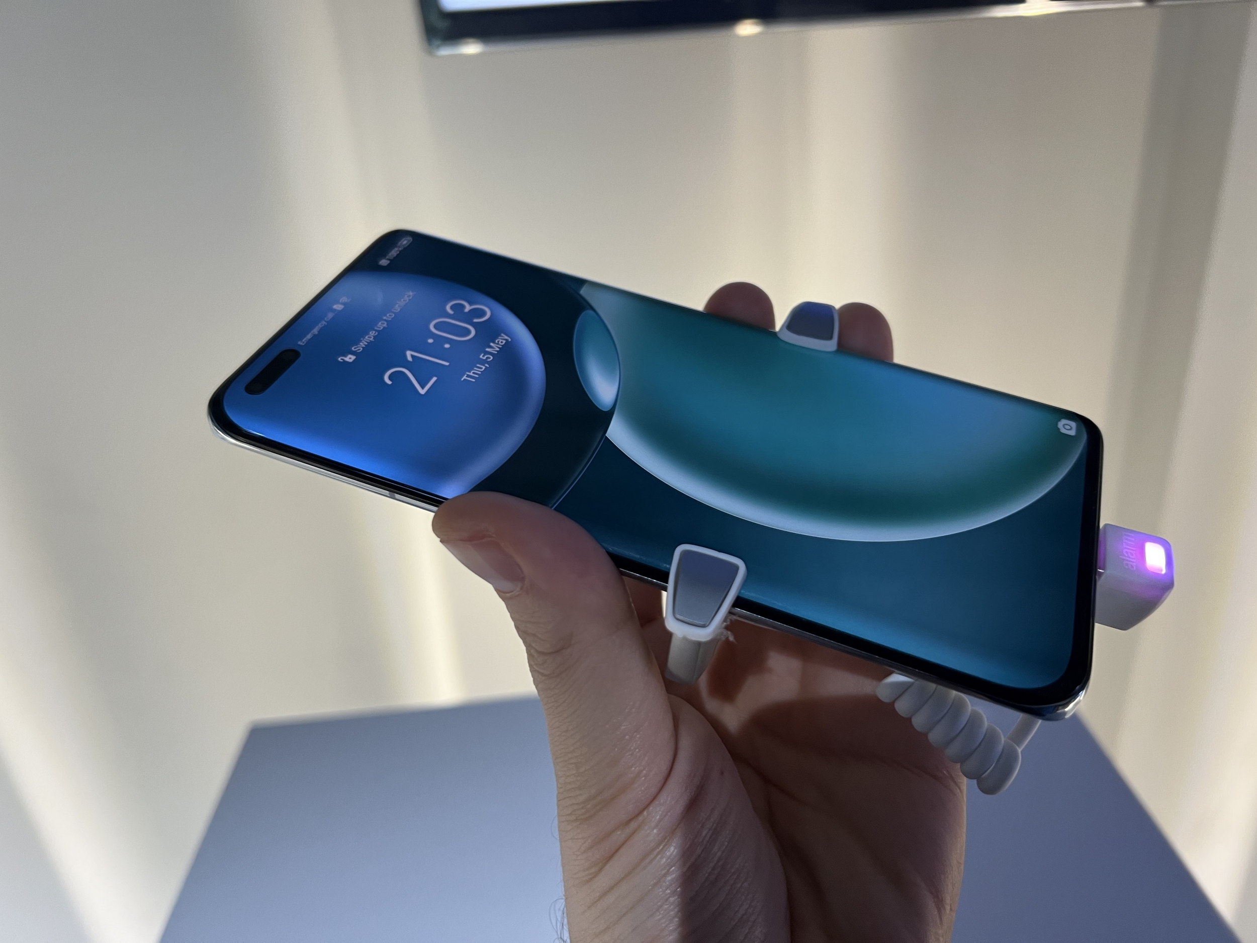 Telefonul are ecranul curbat în colţuri şi are duce cele mai înguste muchii văzute în ultima vreme, de doar 0.94 mm în grosime. Remarcăm şi decupajul pilula pentru camera frontală selfie duala, care aminteşte de Huawei Mate 40 Pro şi Huawei P40 Pro. Nuanţa Cyan a telefonului este inspirată de Colecţia Sir Percival David de la The British Museum. Vine şi pe negru şi are certificare IP68, pentru rezistenţa la apă şi praf. Este fabricat din sticlă şi metal, e destul de masiv, dar manevrabil aş spune. Greu la 209 grame şi gros la 9.2 mm, totuşi. Spatele atrage multe amprente şi grăsime.