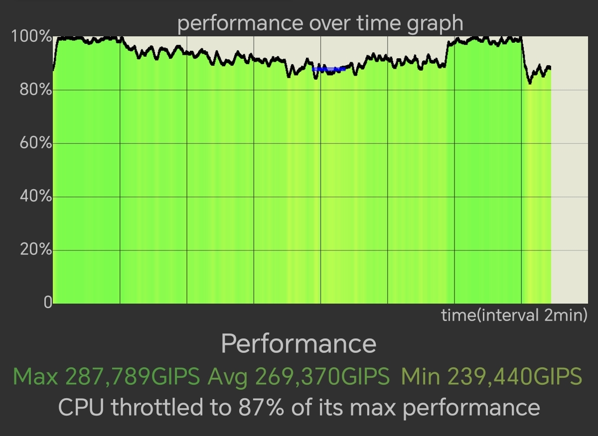 O veste bună e că nu are nici throttling, pierzând doar 13% din performanţă în 15 minute de test. Nu pare a se încinge deloc, cu 35.8 grade Celsius în benchmark-uri şi 36 grade Celsius în jocuri. Merg şi jocurile dacă ţii musai.